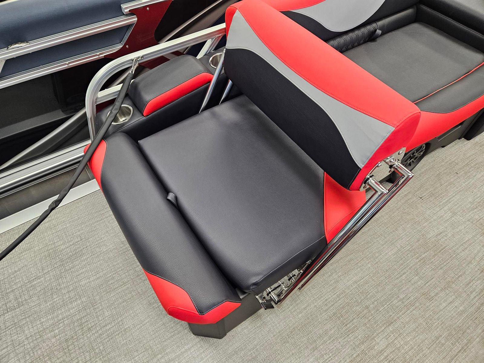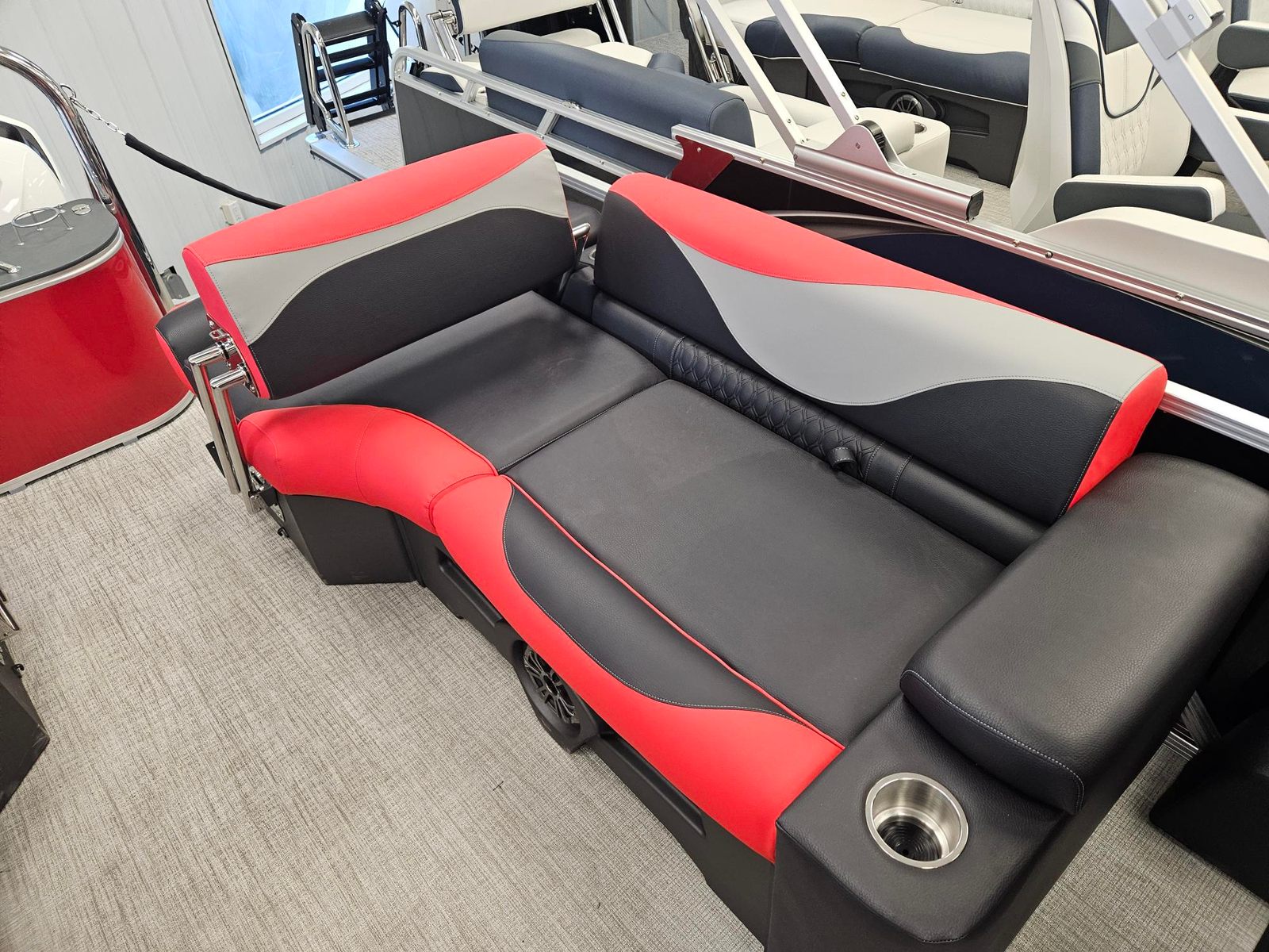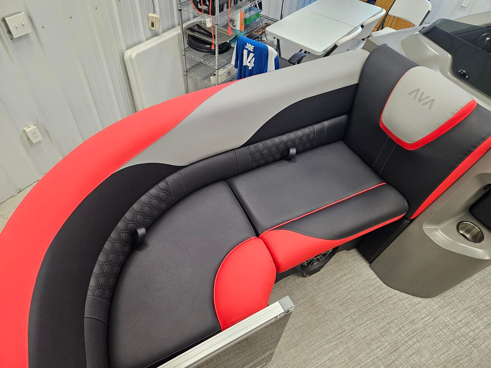 Step aboard the 2026 Avalon LSZ QLS-23T and discover a pontoon boat that stands out in every way. Measuring 23 feet in length, this spacious vessel offers ample room for entertaining, lounging, and enjoying the open water. The sleek black walls, accented with a bold red second wall color, create a striking visual impression that is sure to turn heads at the marina or on the lake. The combination of Black Fresco Base 1 Vinyl, Leon Graphite Base 2 Vinyl, and Red Accent Vinyl throughout the seating and interior adds a touch of modern elegance and comfort, making every outing a stylish affair.
