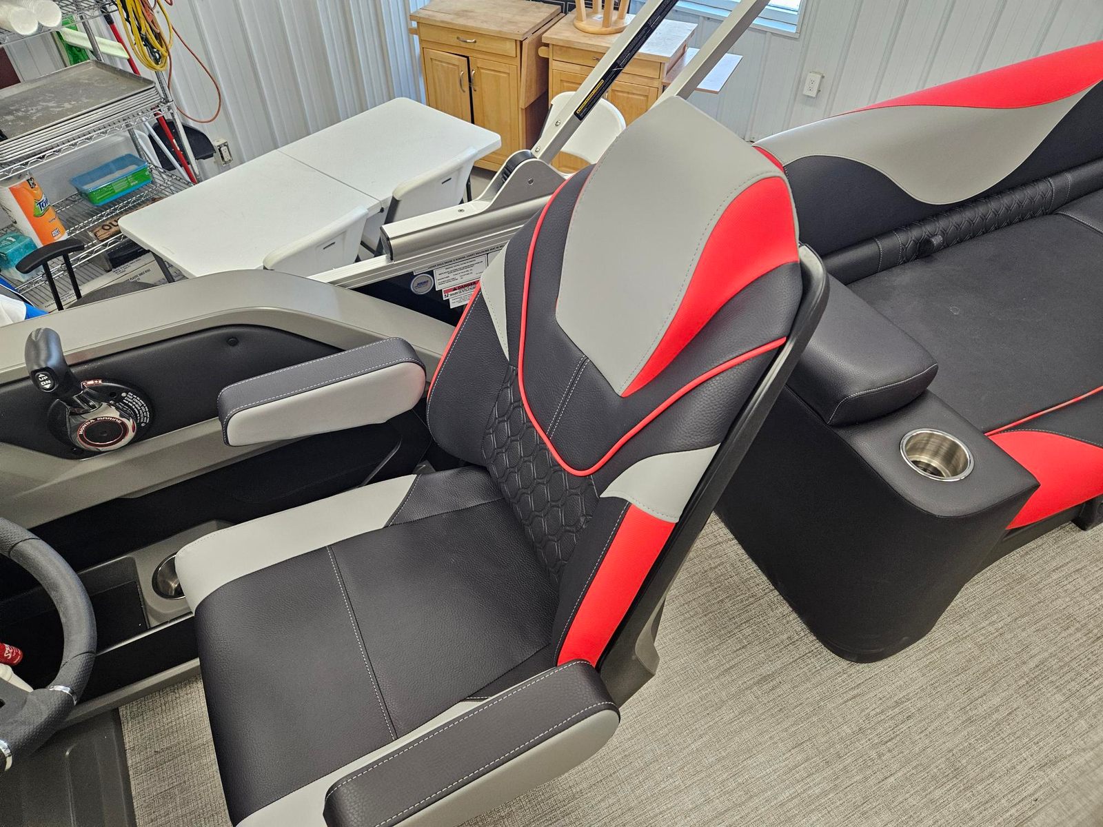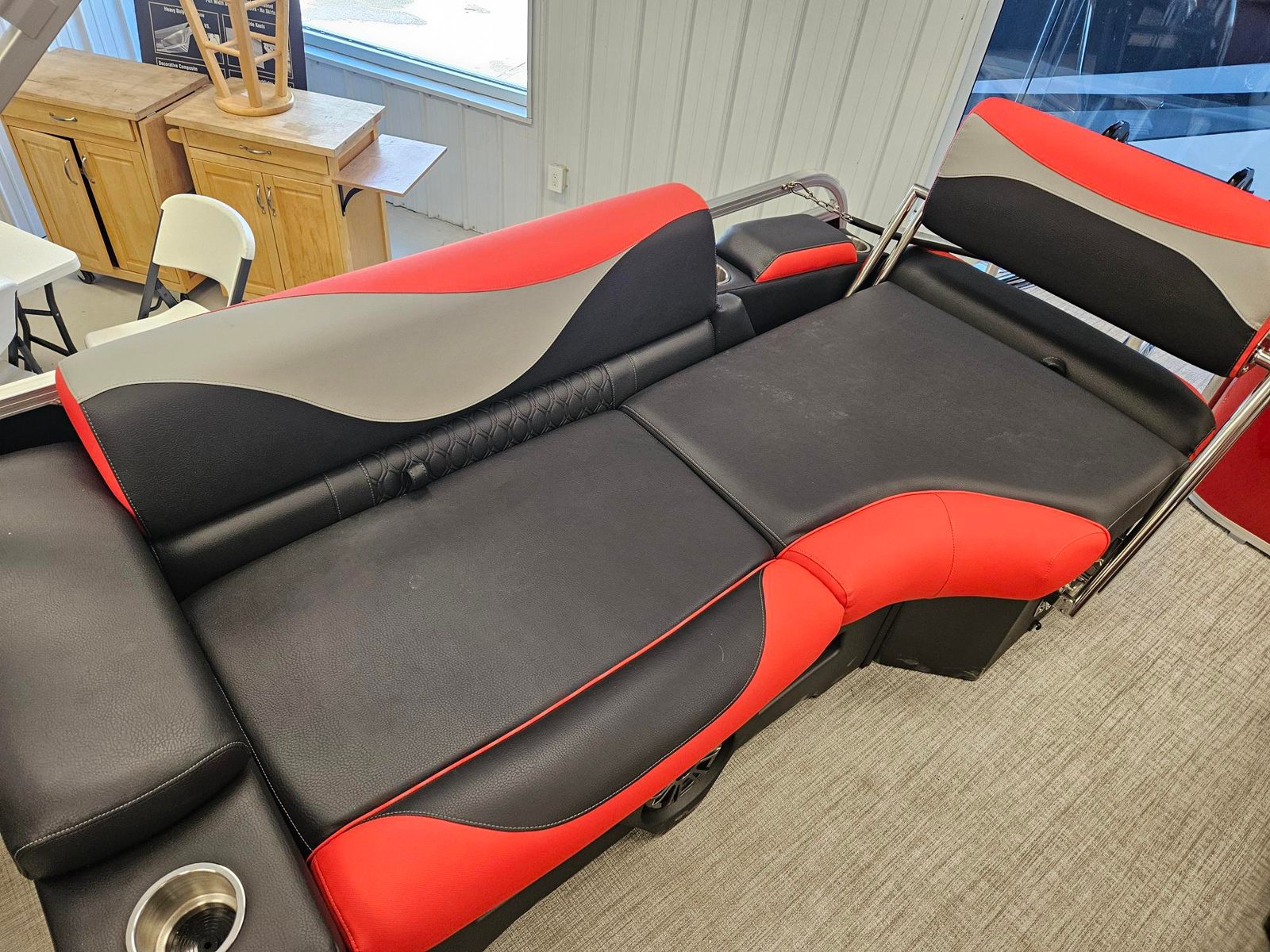 The Avalon LSZ QLS-23T is loaded with special features that set it apart from other pontoon boats for sale. The striking black walls and red accent create a bold exterior, while the premium vinyl seating ensures lasting comfort and durability. The Black Canvas adds a layer of protection and style, perfect for shielding you from the sun or unexpected weather. Both the port and starboard sport high back reclining chairs offer superior support, allowing you and your guests to relax in luxury as you cruise. The Sport Performance Package further enhances the boat’s handling and ride quality, making every trip smooth and enjoyable.