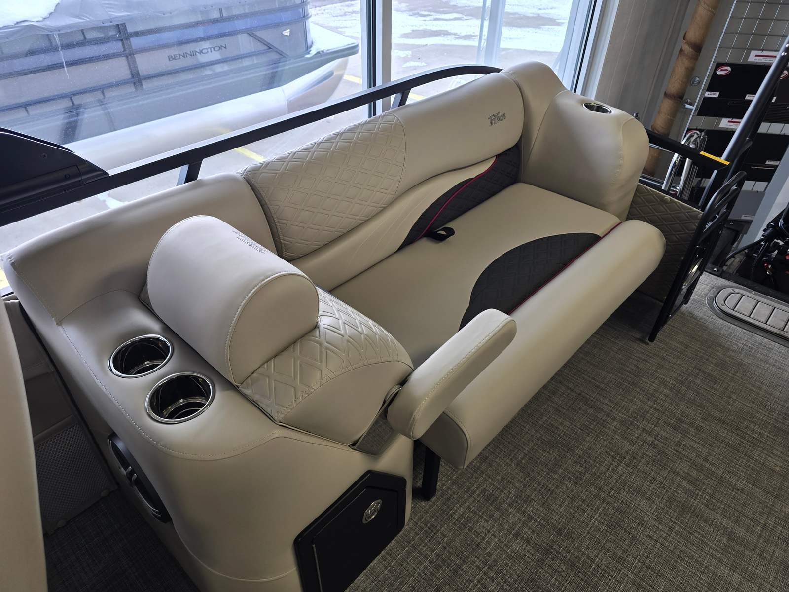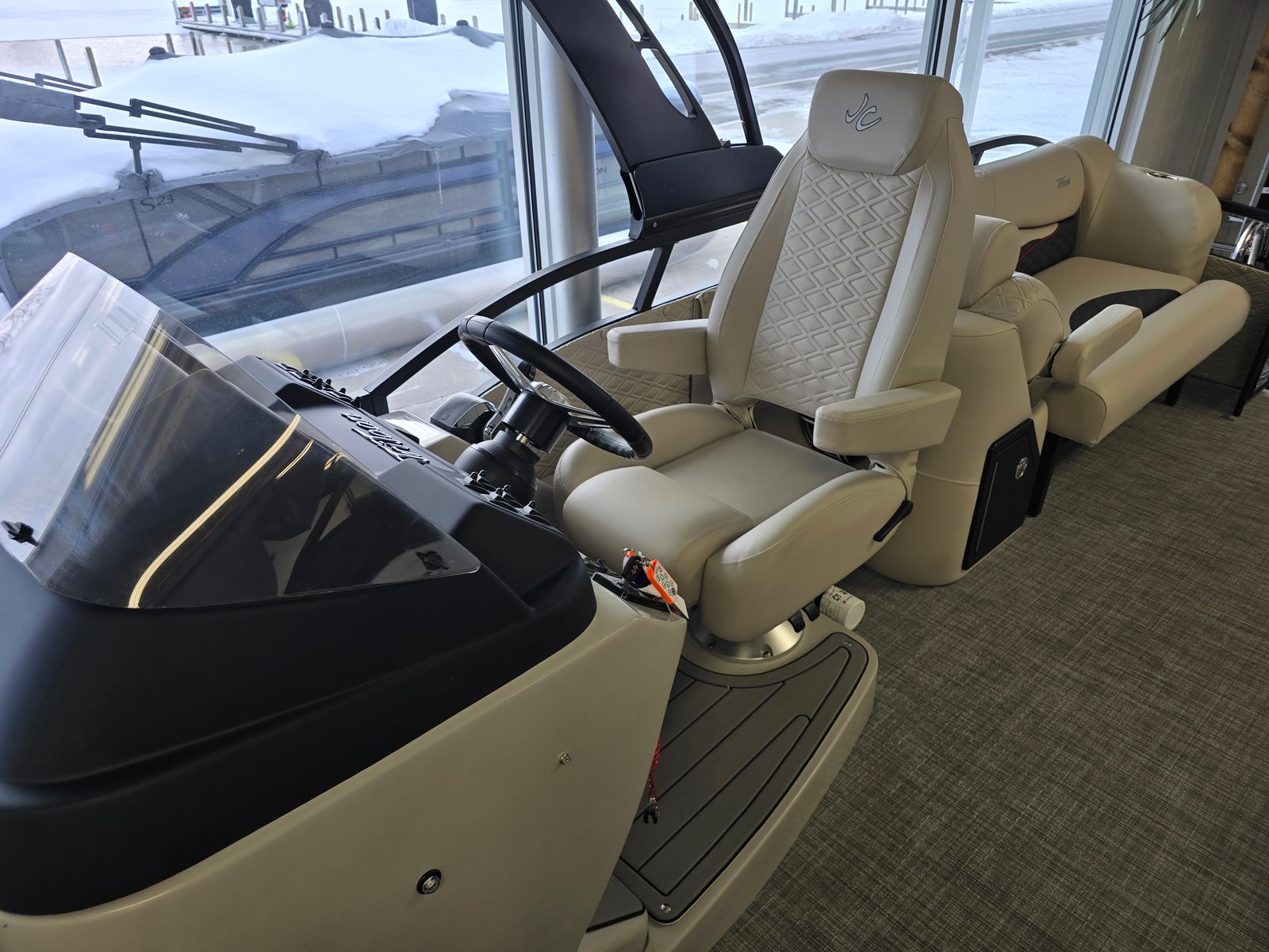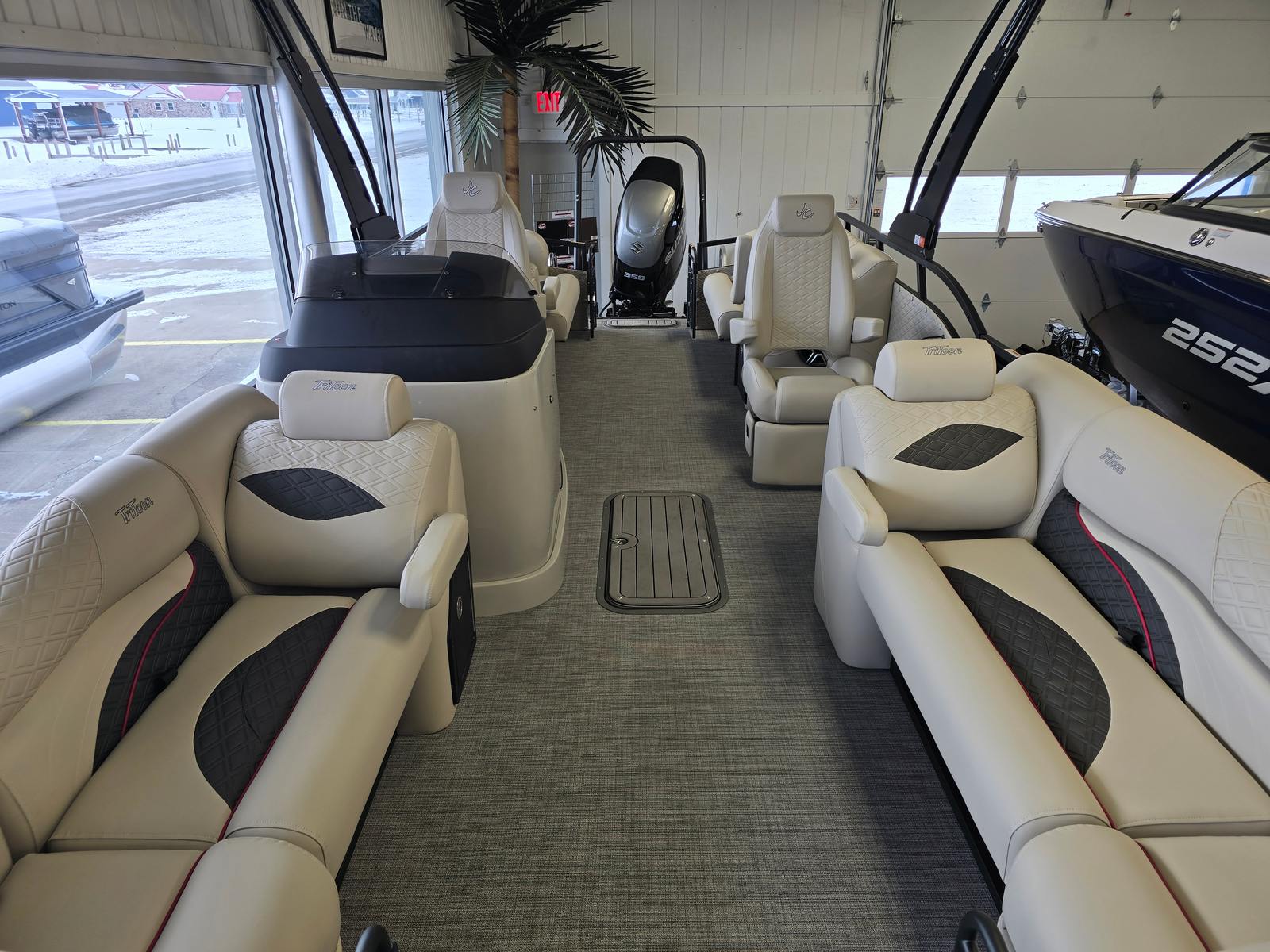 Step aboard the Jc Sporttoon 24TT and you’ll immediately notice its striking visual appeal. The upholstery base color in tan is complemented by carbon accents, creating a sophisticated and inviting atmosphere. The seat base panel color in burgundy adds a touch of elegance, while the black panels with burgundy lower panels provide a bold, modern look. Black rails further enhance the boat’s sleek appearance, and the black bimini offers shade and protection from the sun, allowing you to relax in comfort.The JC Grass Flooring in gray is both stylish and practical, providing a soft, slip-resistant surface that’s easy to maintain. Dual stern lounges invite you and your guests to stretch out and unwind, making every trip on the water a luxurious experience. The thoughtful layout ensures plenty of room for socializing, sunbathing, or simply enjoying the view. With no sundeck and no starboard gate, the design remains streamlined and uncluttered, maximizing usable space and enhancing the overall aesthetic.