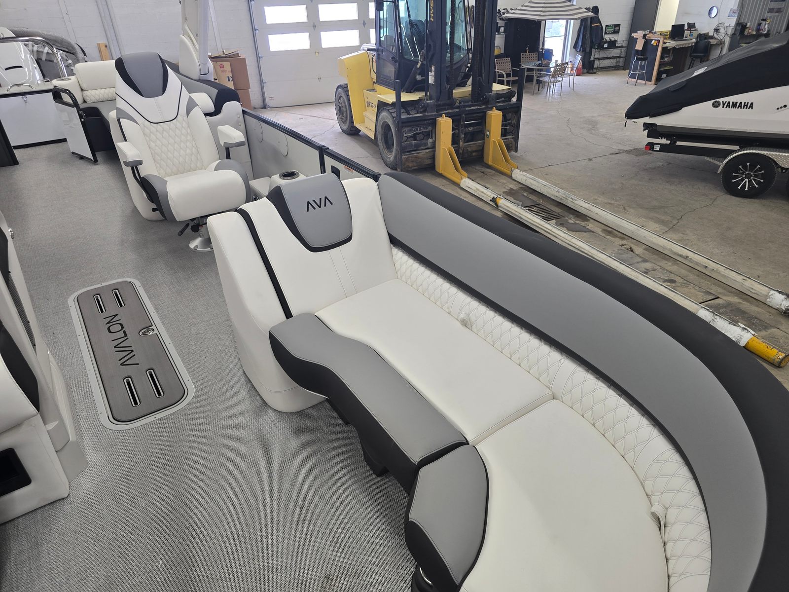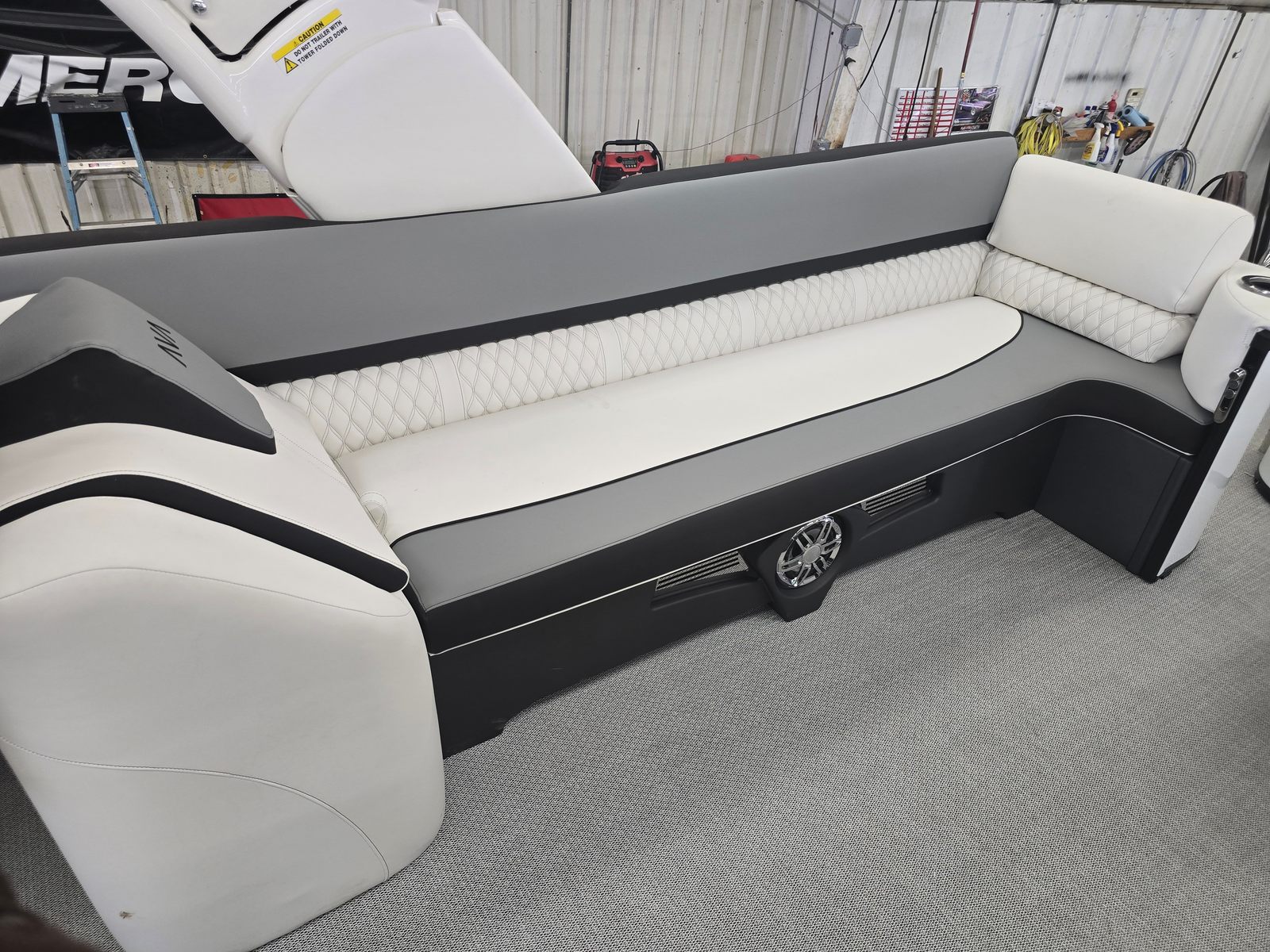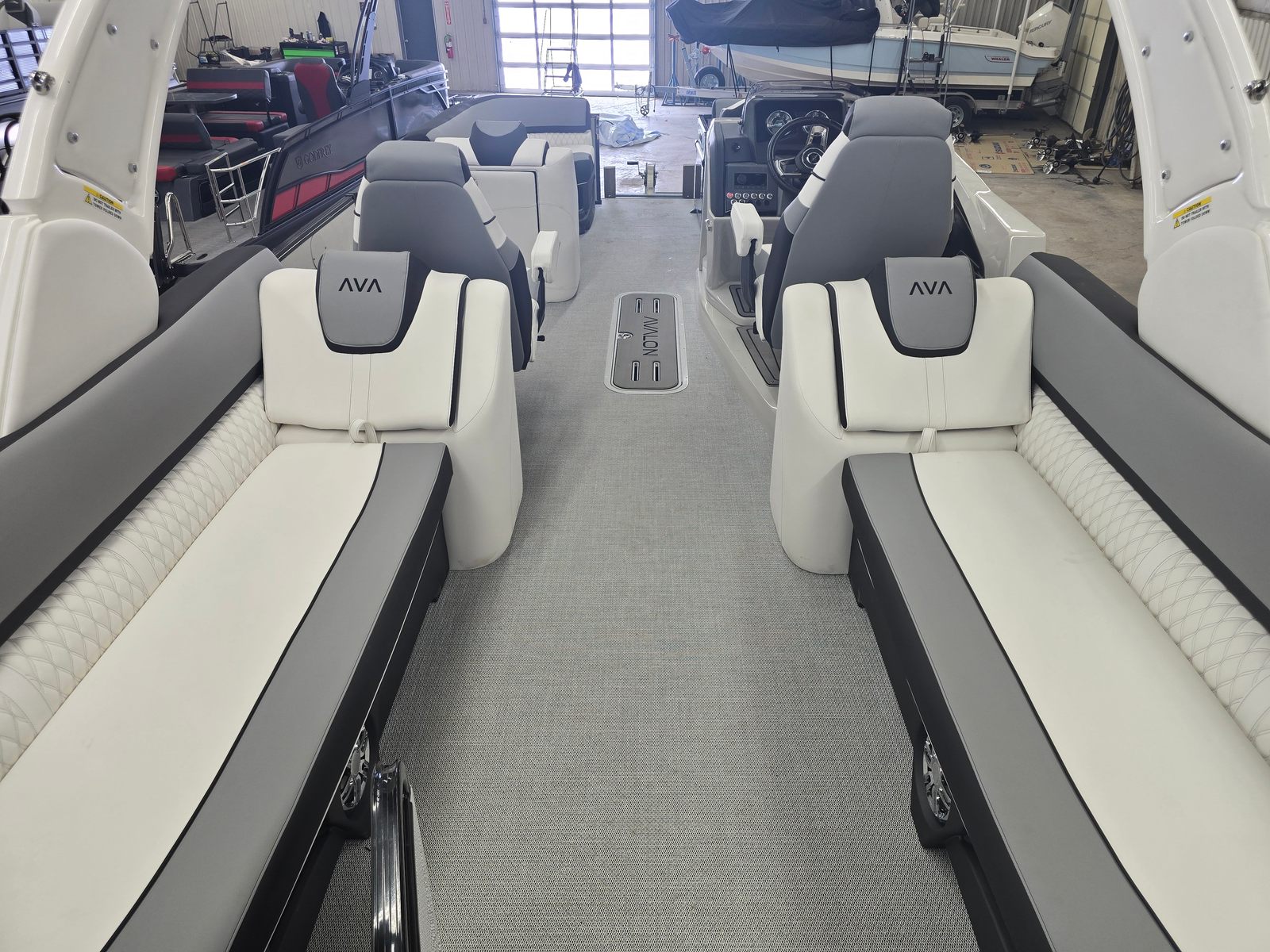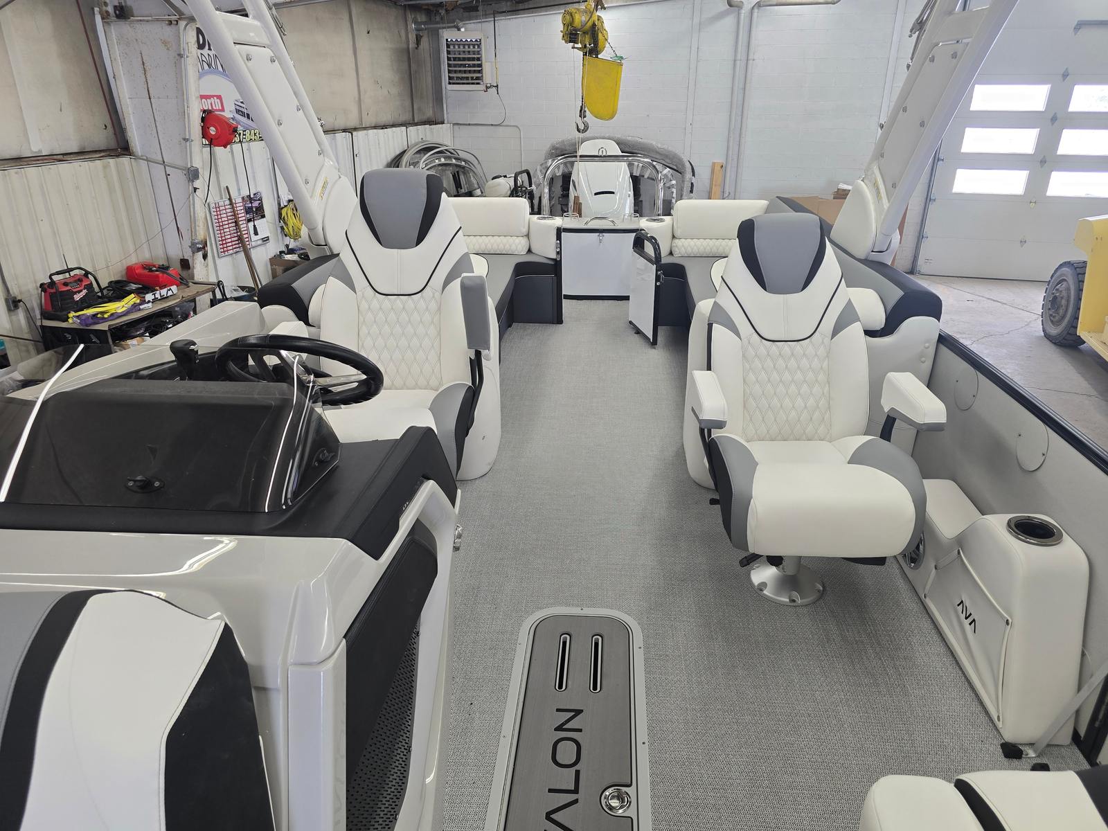 The Avalon CAT QL-25T is packed with premium features designed to elevate your time on the water. The Catalina Platinum Edition brings a touch of elegance and sophistication, while the 27 Waveglider Package ensures superior stability and a smooth, comfortable ride even in choppy conditions. The Blackout Package adds a modern, sleek aesthetic, enhancing the boat’s visual appeal and presence on the water.Step aboard and you will be greeted by luxurious Ultrafine Bright White Base 1 Vinyl seating, complemented by Ultrafine Koolfab Graphite Base 2 Vinyl and Koolfab Black Accent Vinyl. These high-quality materials not only provide exceptional comfort but also offer durability and resistance to the elements, ensuring your pontoon remains pristine season after season. Every detail, from the plush seating to the stylish color accents, is thoughtfully designed to create an inviting and upscale atmosphere.