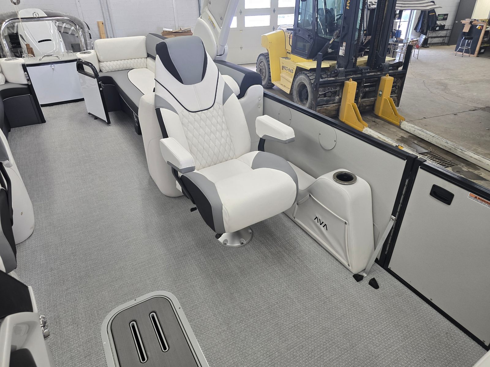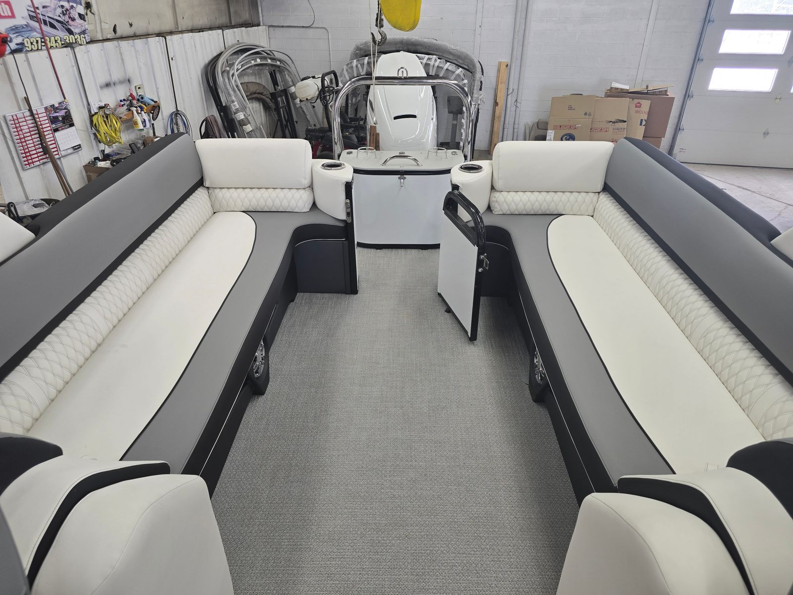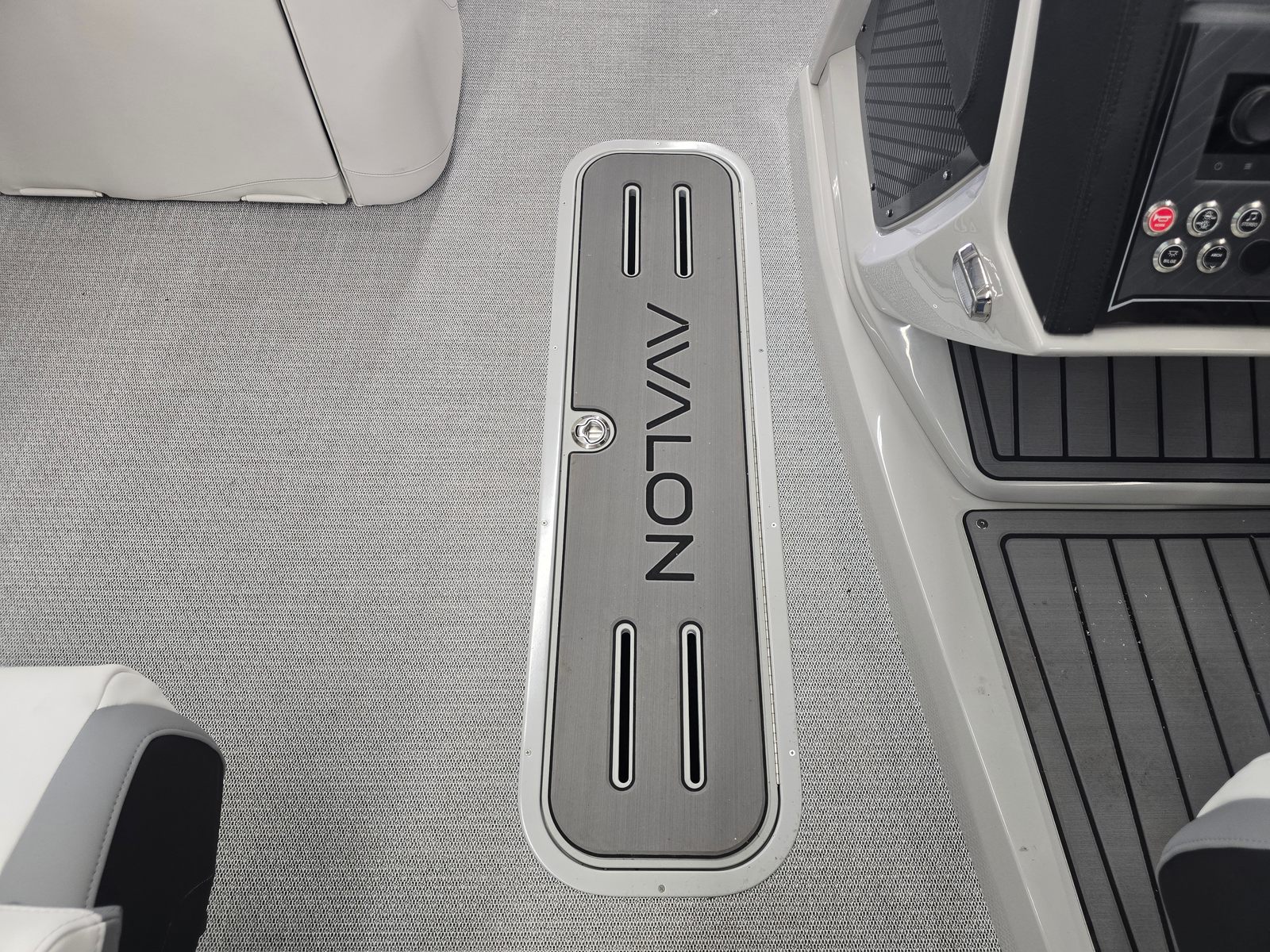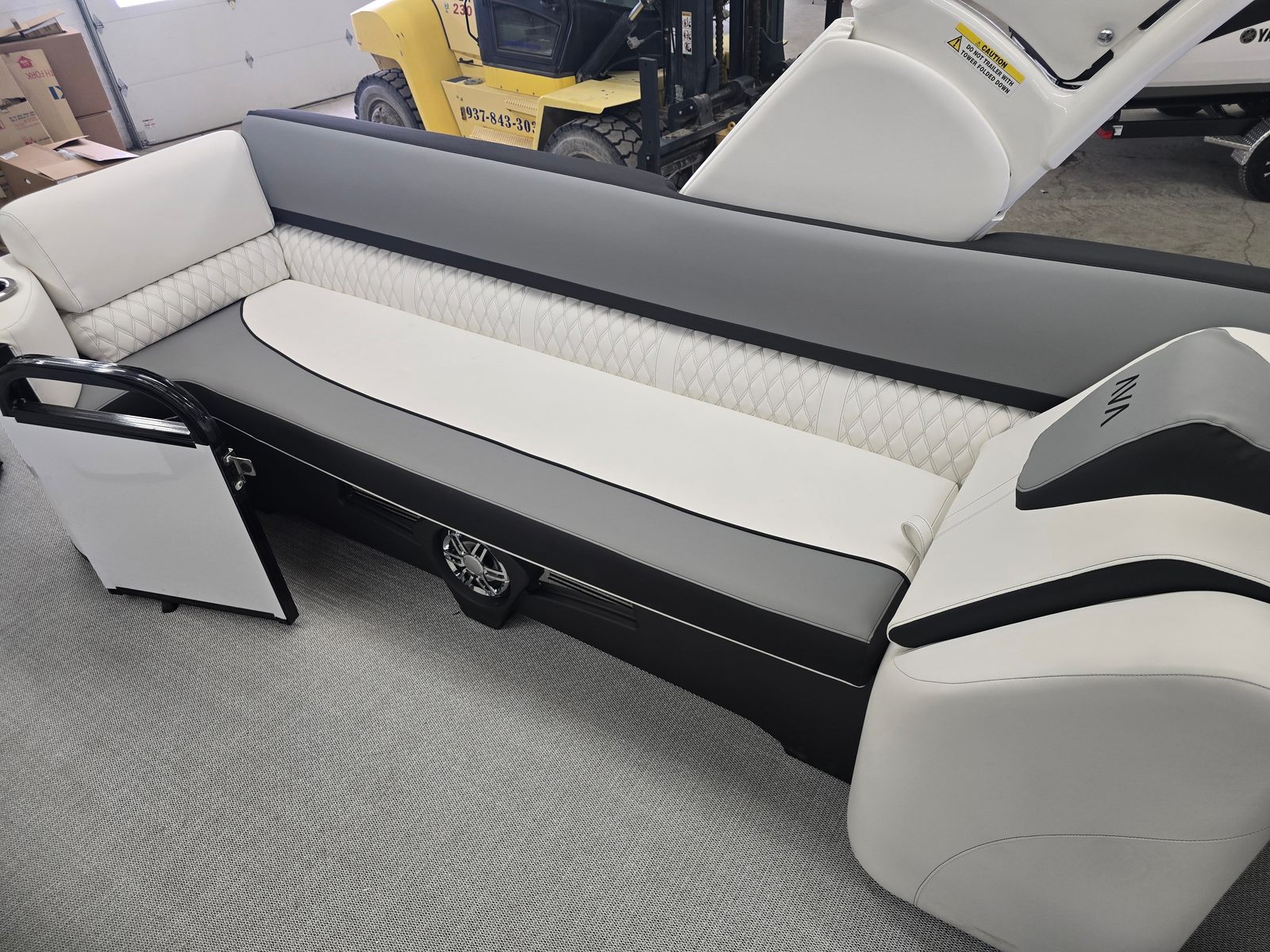 The Avalon CAT QL-25T is packed with premium features designed to elevate your time on the water. The Catalina Platinum Edition brings a touch of elegance and sophistication, while the 27 Waveglider Package ensures superior stability and a smooth, comfortable ride even in choppy conditions. The Blackout Package adds a modern, sleek aesthetic, enhancing the boat’s visual appeal and presence on the water.Step aboard and you will be greeted by luxurious Ultrafine Bright White Base 1 Vinyl seating, complemented by Ultrafine Koolfab Graphite Base 2 Vinyl and Koolfab Black Accent Vinyl. These high-quality materials not only provide exceptional comfort but also offer durability and resistance to the elements, ensuring your pontoon remains pristine season after season. Every detail, from the plush seating to the stylish color accents, is thoughtfully designed to create an inviting and upscale atmosphere.