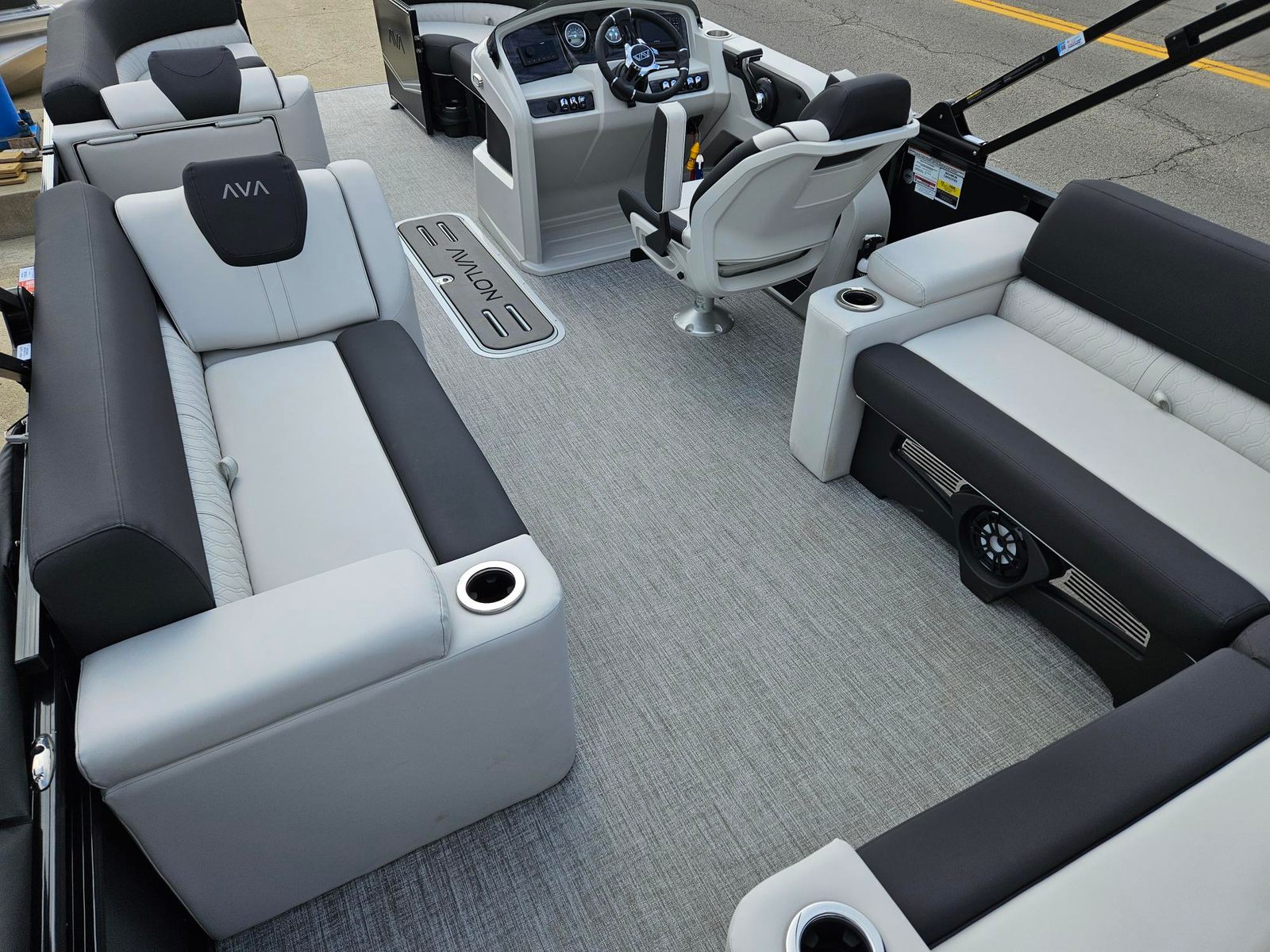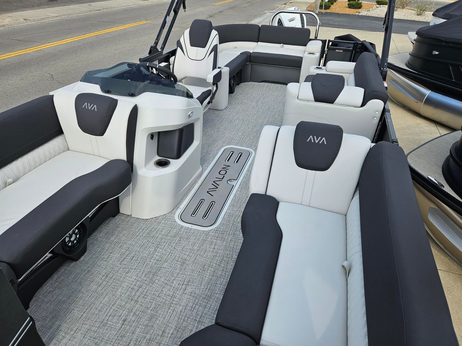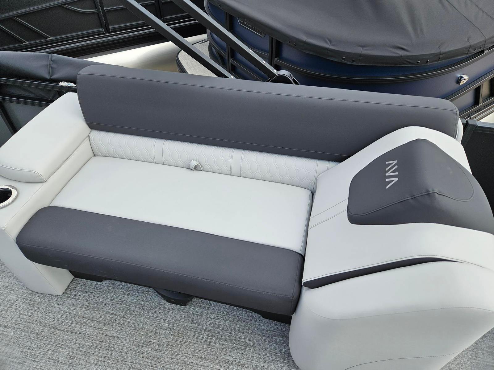 The Avalon LSZ Elite-23T is loaded with special features that set it apart from other pontoon boats for sale. The LSZ Platinum Edition package elevates the boat’s aesthetics and comfort, ensuring you and your guests enjoy a premium experience every time you step aboard. The 27 Waveglider Package enhances stability and ride quality, making every journey smooth and enjoyable, even in choppier conditions.For those who appreciate a touch of elegance, the Blue Ice Package adds a cool, modern flair to the boat’s appearance, while the Blackout Package delivers a sleek, contemporary look that is sure to turn heads at the marina. The seating is upholstered in Ultrafine Silver Base 1 Vinyl, complemented by Koolfab Black Base 2 Vinyl and Koolfab Black Accent Vinyl, creating a luxurious and inviting atmosphere. The Black Canvas adds a final touch of sophistication, providing shade and protection when needed.