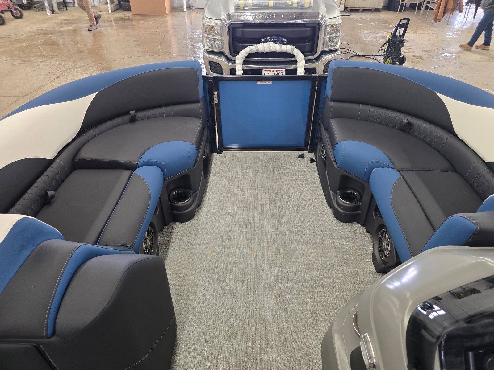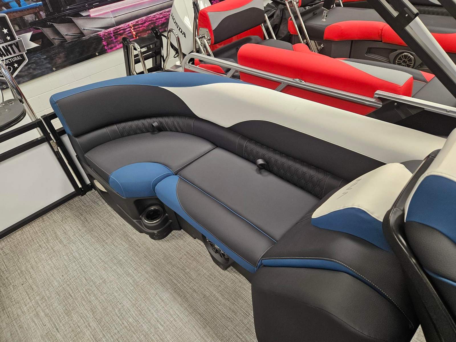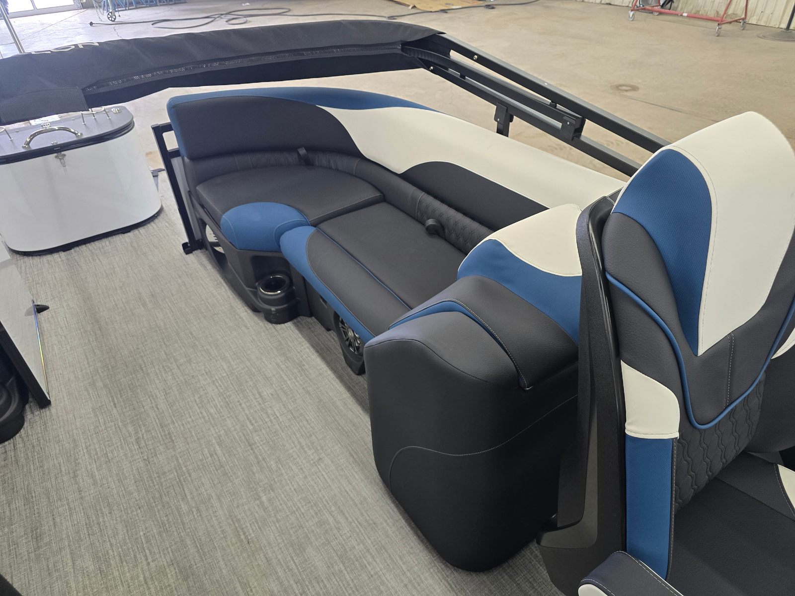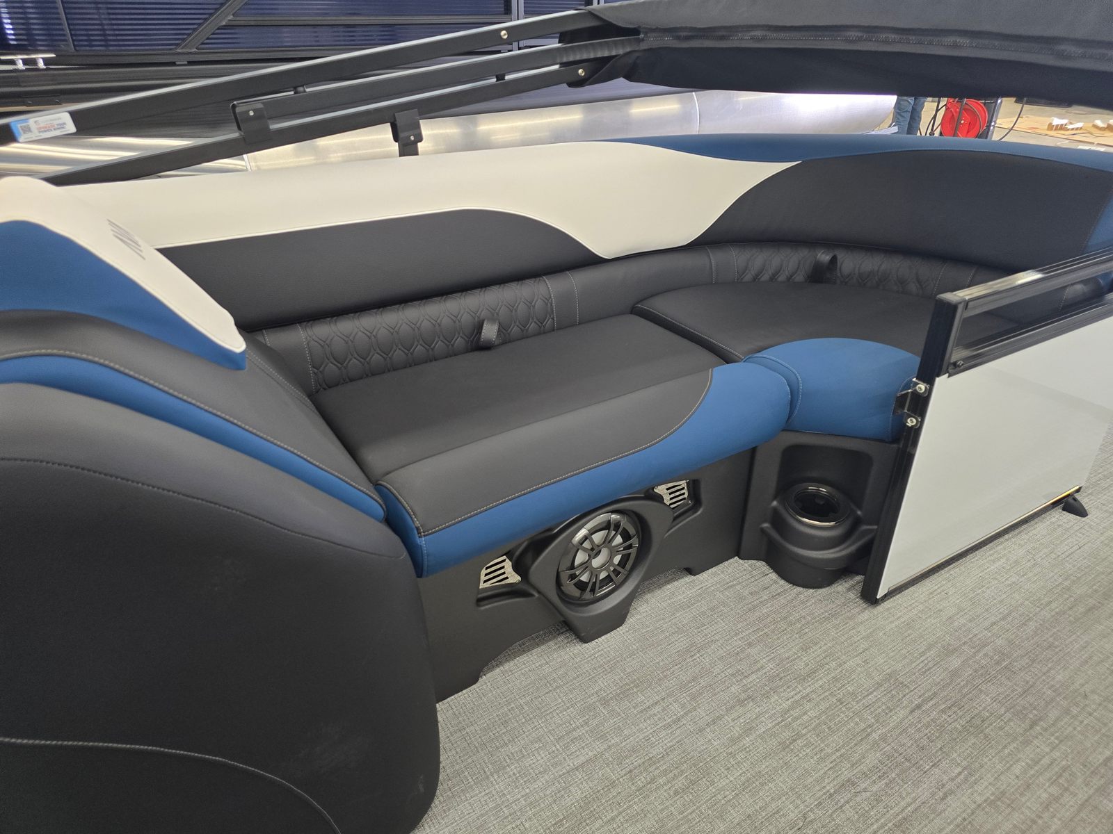 The Avalon LSZ QL-23T is packed with features designed to elevate your time on the water. The LSZ Platinum Edition brings a host of premium touches, from upgraded materials to refined finishes. The Blue Ice Package adds a cool, modern flair, making evening cruises even more magical. The Caribbean Blue Walls and White Flake Metallic accents create a visually stunning exterior, while the Black Fresco and Ultrafine Bright White vinyls, accented with Caribbean Blue, offer both comfort and durability for all-day lounging. The spacious 24.5-foot layout provides plenty of room for guests, making it easy to host gatherings or enjoy quiet moments with loved ones. Every detail of this pontoon boat is crafted to enhance your comfort and enjoyment.