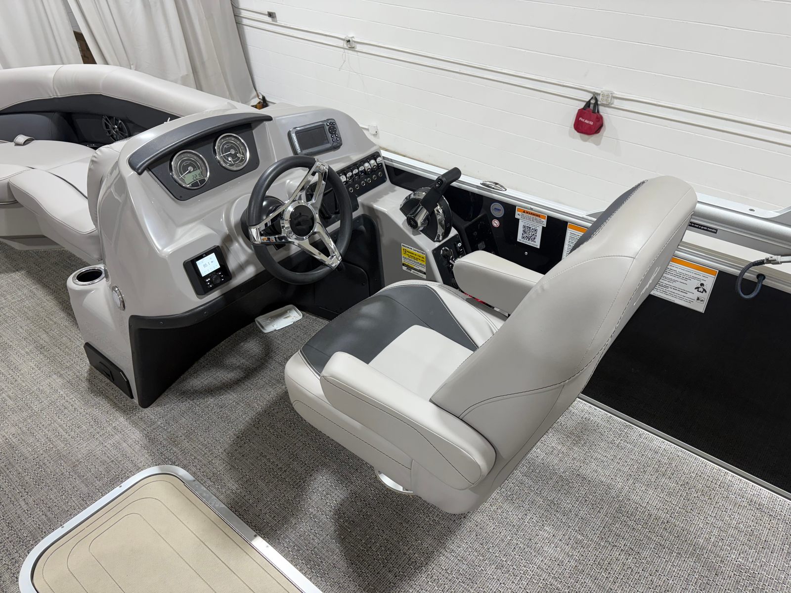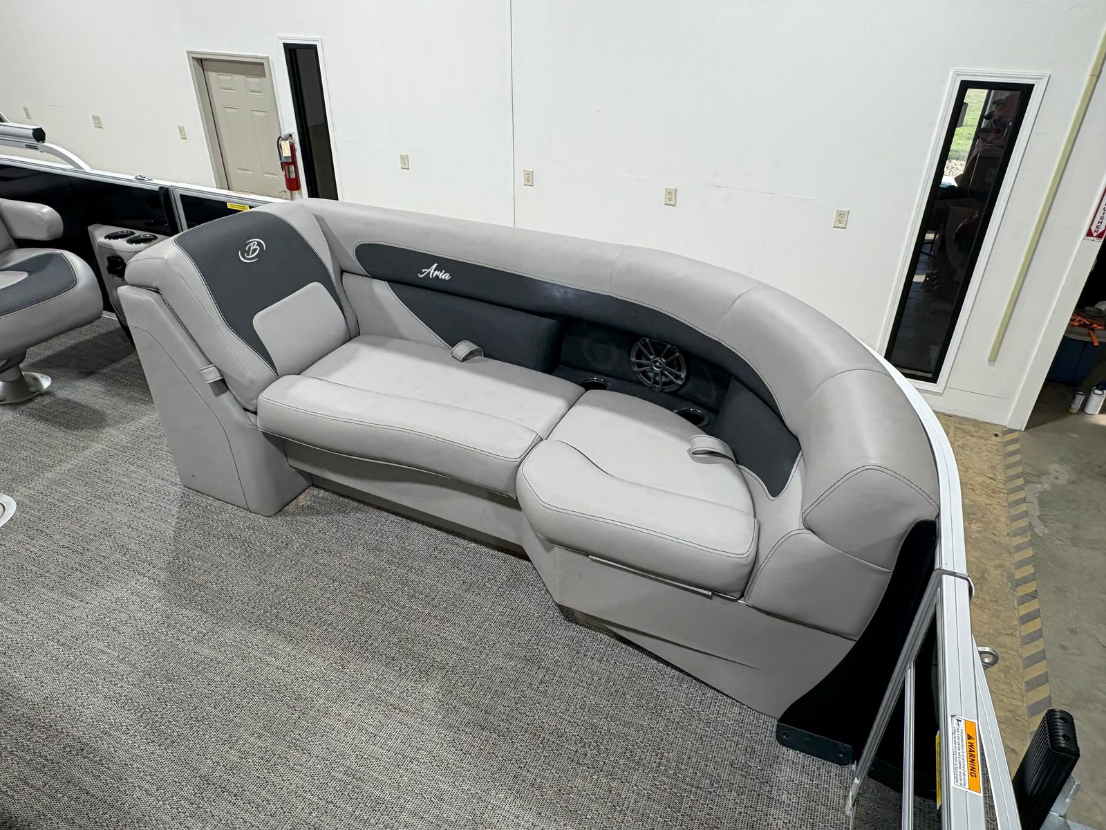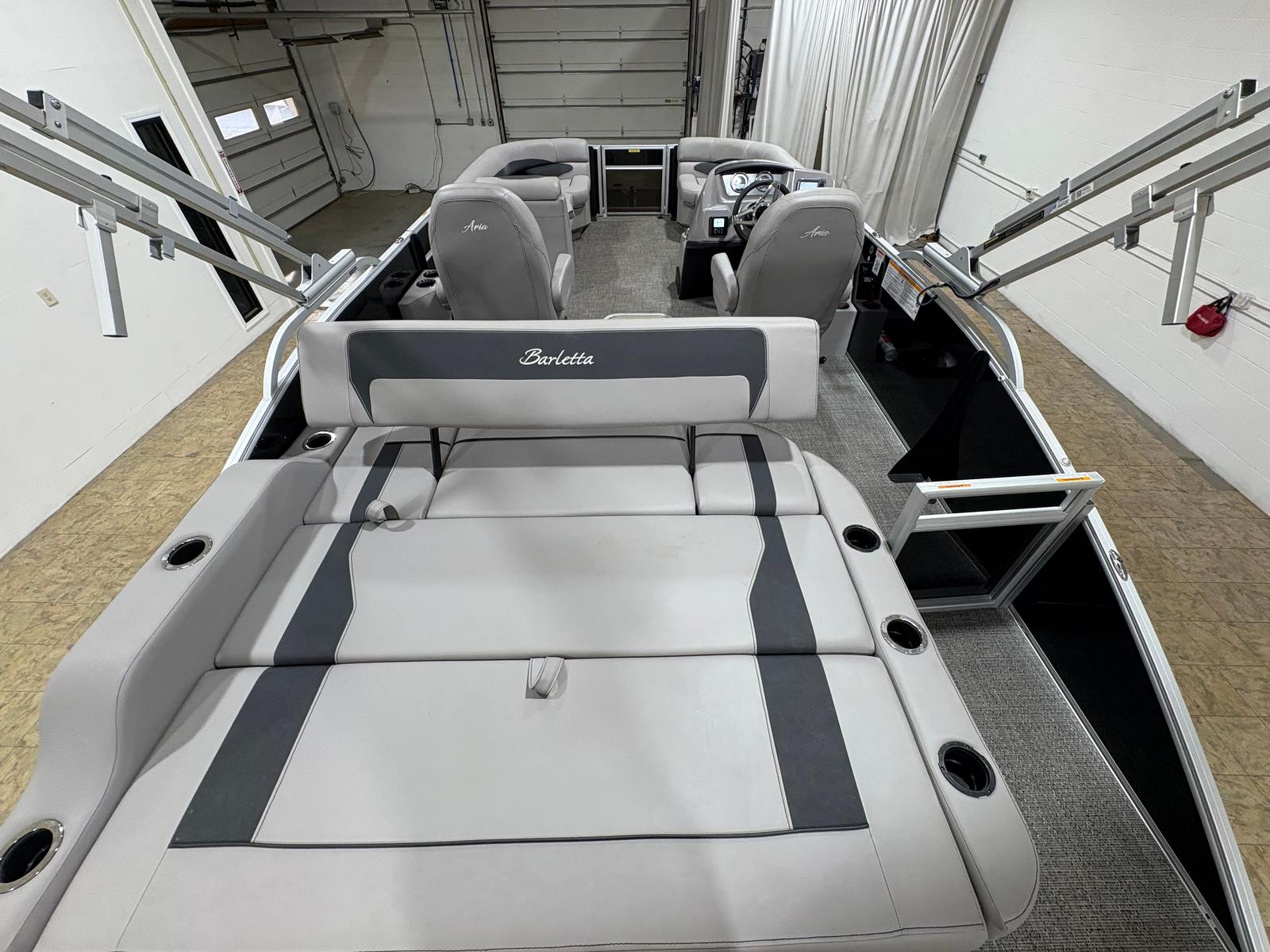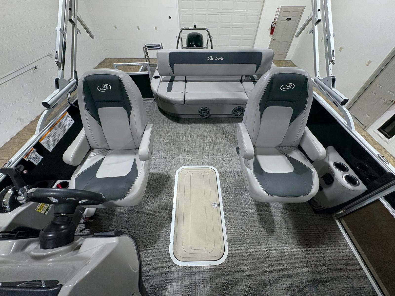 The Barletta A22UC is loaded with features designed to enhance your boating experience. The flooring is finished in elegant Amore Gray, providing a modern and easy-to-clean surface that complements the overall aesthetic. The furniture is upholstered in Tempest Gray, offering both comfort and style for all passengers. One of the standout features is the in-floor midship storage, which provides convenient space for stowing gear, water toys, and personal items, keeping the deck clutter-free and organized.The boat’s exterior is highlighted by the Railskin Color Aria in Black Diamond, giving it a sophisticated and eye-catching appearance. The Triple Toon Package Aria adds to the boat’s stability and performance, ensuring a smooth ride even in choppier waters. With the rig engine and standard prop, you can expect reliable propulsion and easy maneuverability, making docking and navigating tight spaces a breeze.