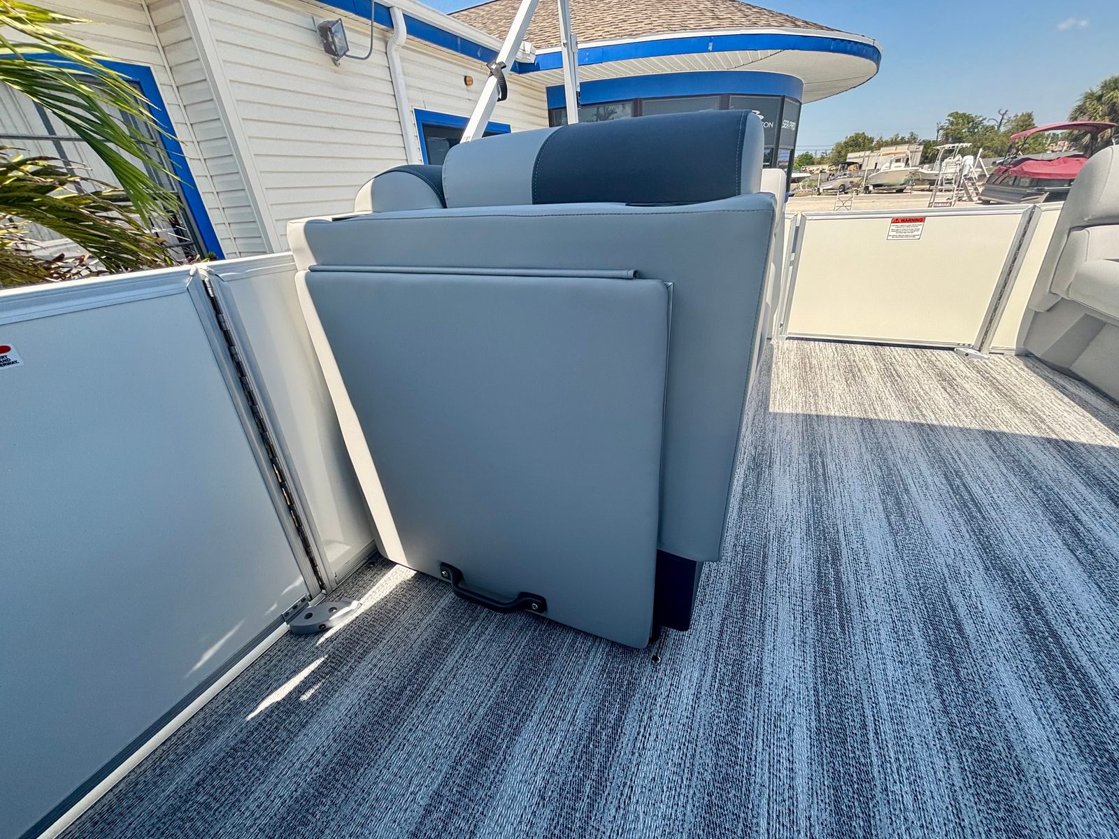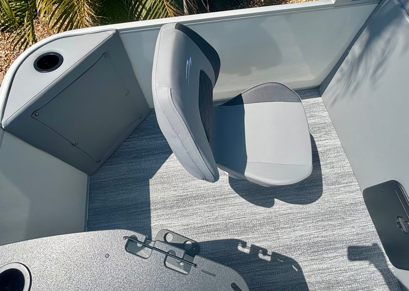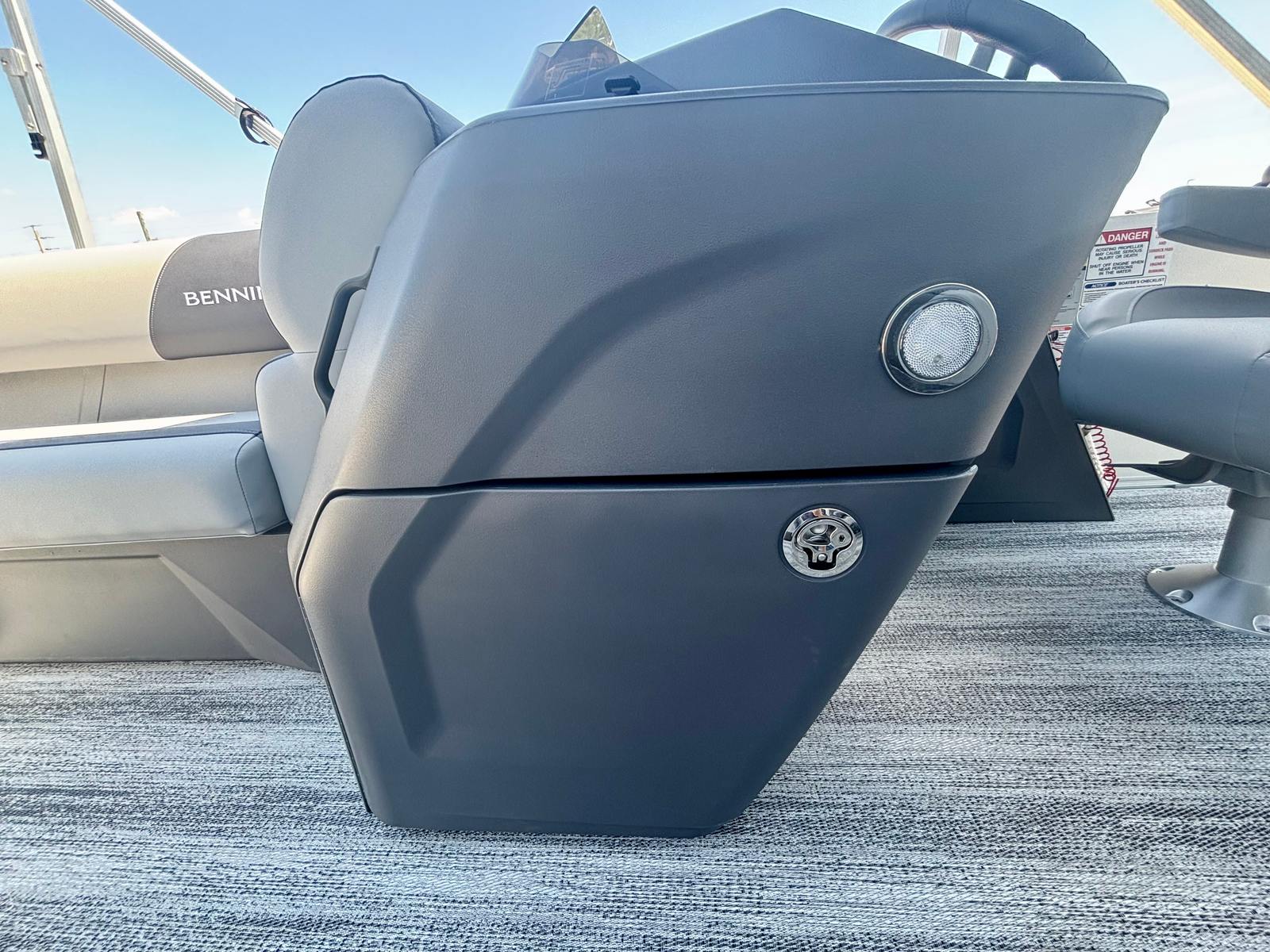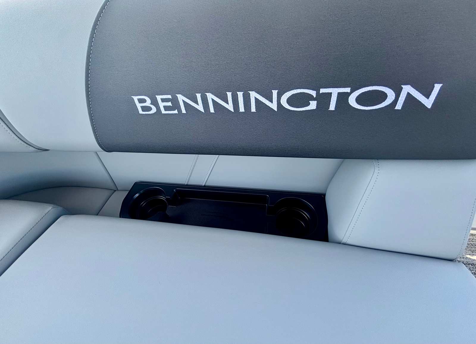 Step aboard the Bennington 21 SFC SPS and you will immediately notice the attention to detail and premium materials throughout. The smooth Metallic White color gives this pontoon a modern, sophisticated look that stands out at any marina. The Ironwood trim accents add a touch of elegance, while the Mythos Grey furniture accents create a refined and inviting atmosphere. The Shoreline Grey flooring is both stylish and practical, providing a comfortable and easy-to-clean surface for all your activities.For anglers and outdoor enthusiasts, the trolling motor gate and wiring harness offer added convenience, making it easy to customize your pontoon for fishing adventures. The fixed cleats at the aft and bow provide secure mooring options, ensuring your boat stays safely in place wherever you dock. The dimensional brushed logos add a distinctive flair, showcasing the Bennington brand’s commitment to excellence.The captain’s area is designed for ultimate comfort and control. The mid-back air recliner offers ergonomic support for long days on the water, while the captain’s chair slider and pedestal allow you to find the perfect position for navigating or relaxing. The black wheel with chrome accents adds a sporty touch, making every journey feel like a first-class experience.