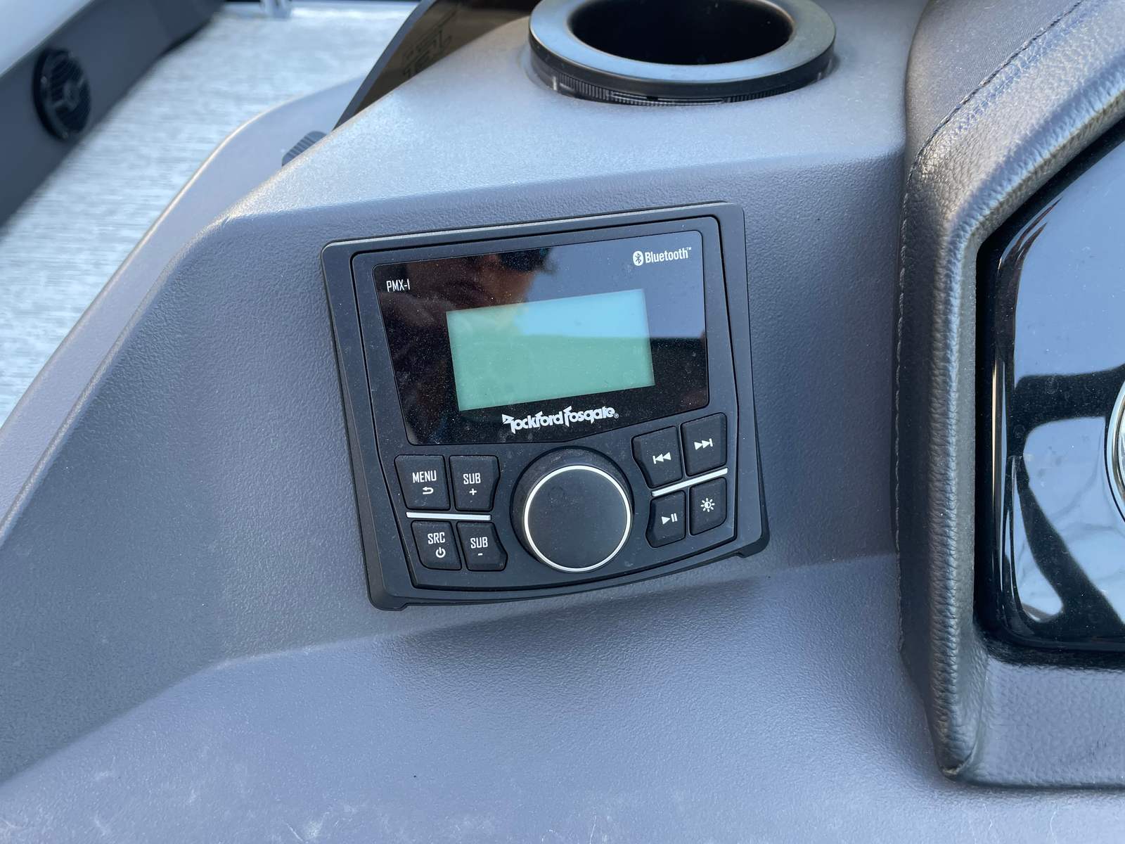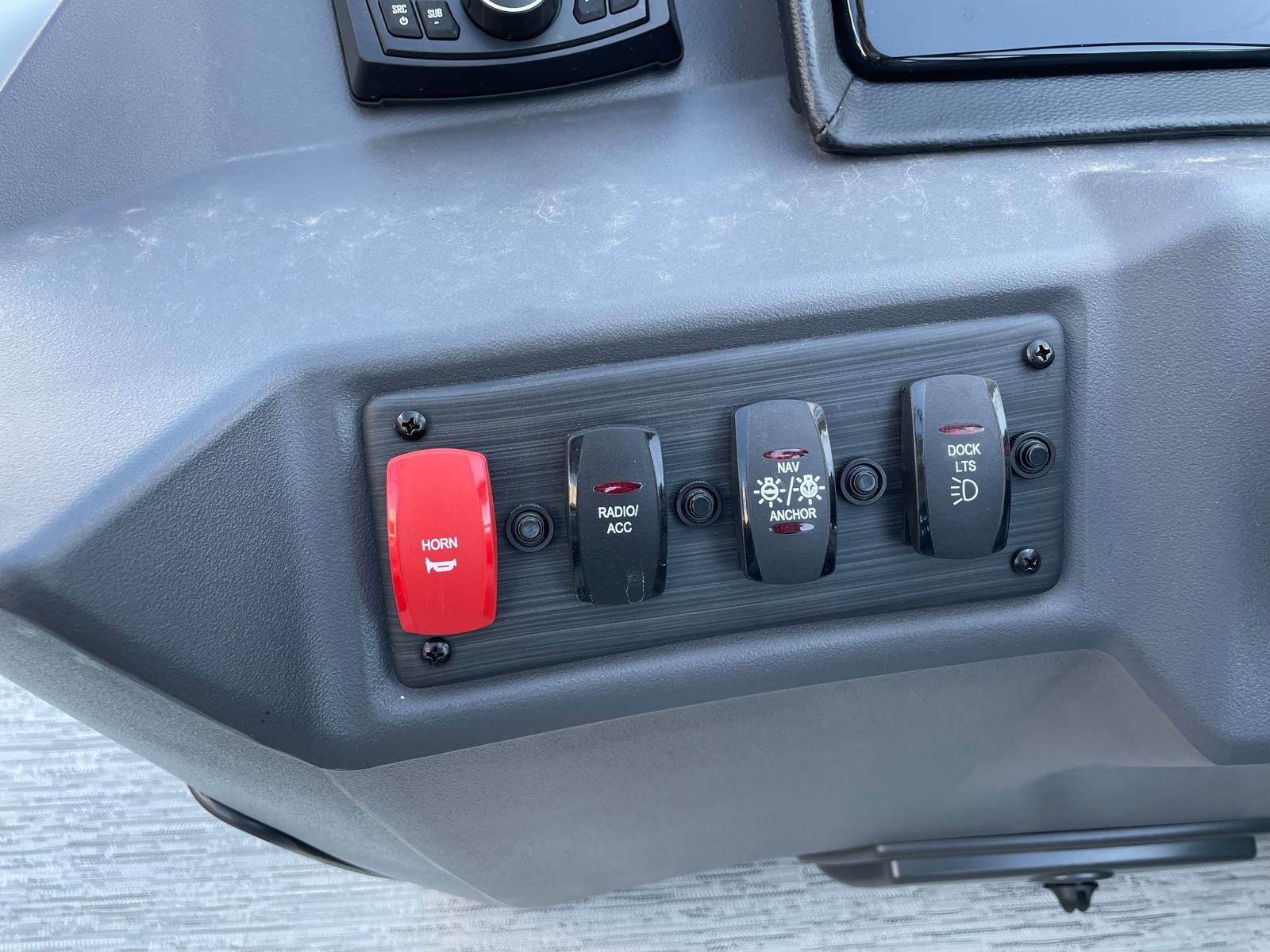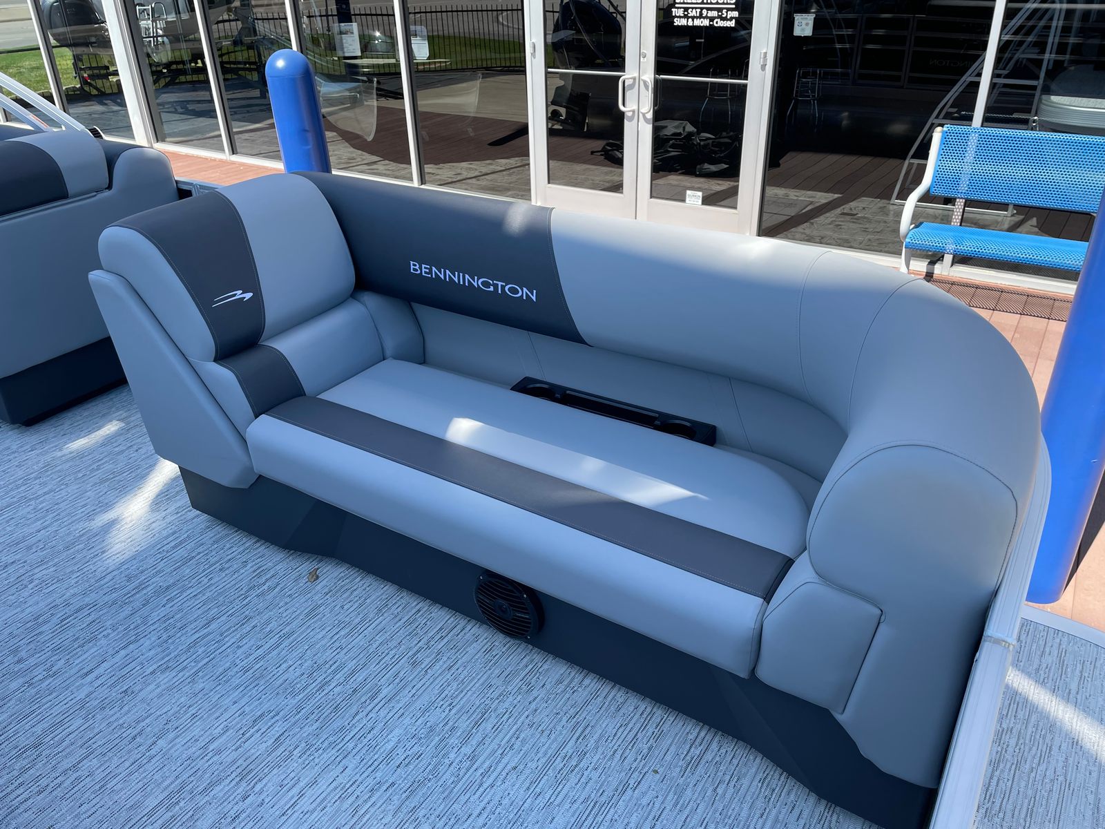 Step aboard the Bennington 21 SLJ SPS and discover a host of premium features designed to maximize your enjoyment and convenience. The single switch battery system provides reliable power management, while the electric power top curved Bimini offers effortless shade adjustment with a sleek, modern look. The midnight black canvas paired with shadow grey accents creates a sophisticated aesthetic, complemented by the ironwood dash accent for a touch of elegance at the helm. Stay connected and powered up with the integrated wireless charger, ensuring your devices are always ready for action. The Valencia grey upholstery adds a refined touch to the spacious seating areas, inviting you to relax in comfort as you cruise. The SPS Performance Package, featuring a 33-gallon transom direct fill, further enhances the boat’s stability and fuel capacity, supporting longer journeys and more time on the water.