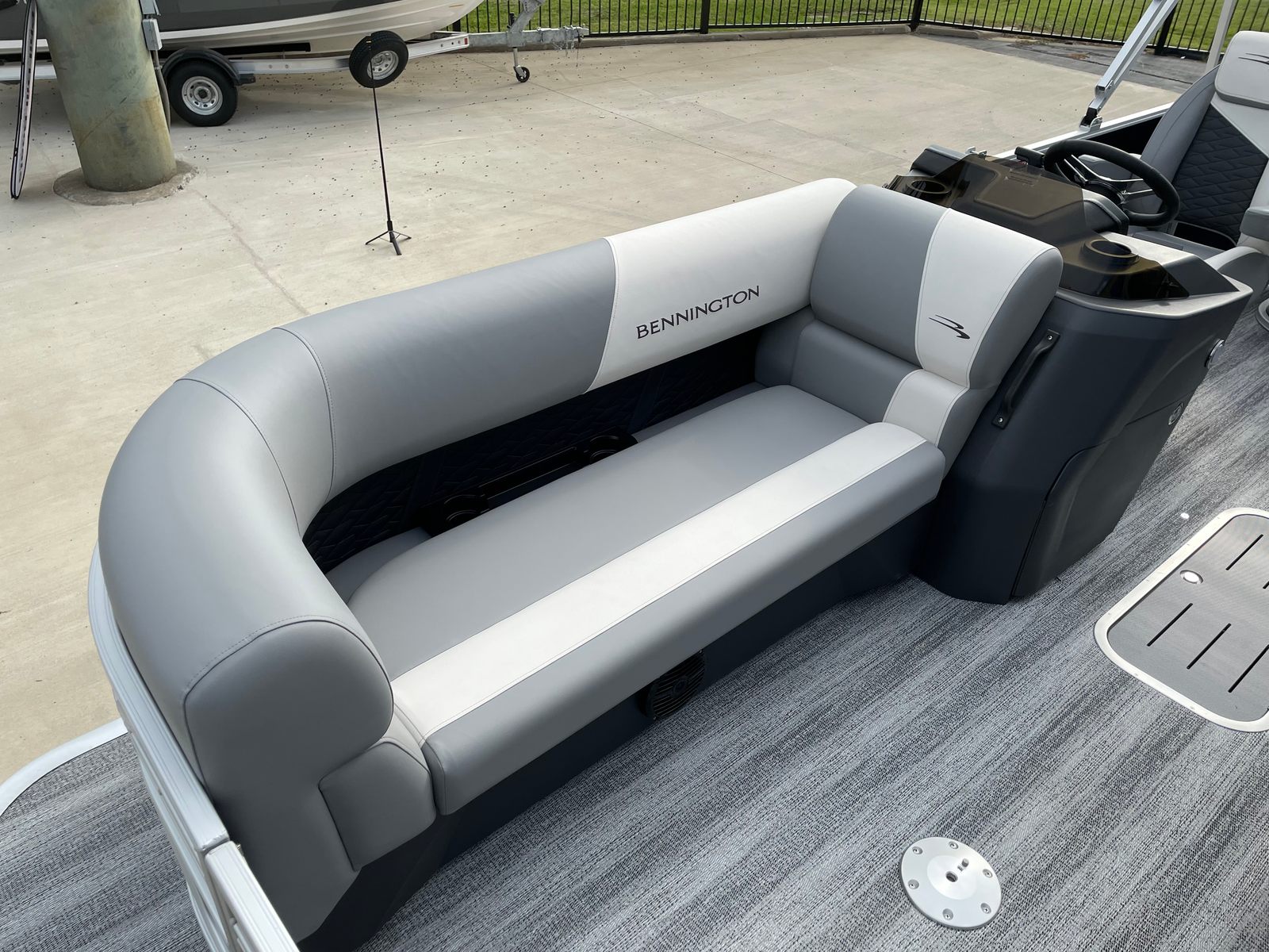 This Bennington pontoon boat is loaded with premium features designed to enhance your time on the water. The underdeck wave shield improves ride quality by reducing drag and providing a smoother, quieter experience, even at higher speeds. The ski tow bar—part of the SPS package—makes it easy to enjoy watersports, while the wireless charger ensures your devices stay powered throughout the day. A windscreen offers protection from the elements, adding to your comfort during breezy or sunny conditions.Inside, the Serene Soft Touch Vinyl with Simtex accents and diamond-pressed lumbar support creates a plush, inviting atmosphere for you and your guests. The battery single switch simplifies power management, while the thoughtfully designed layout maximizes both seating and storage. Every detail, from the accent colors to the ergonomic seating, reflects Bennington’s commitment to quality and style.