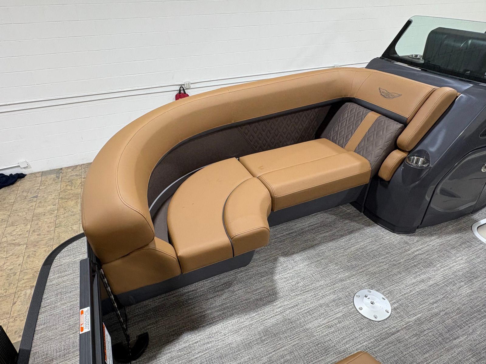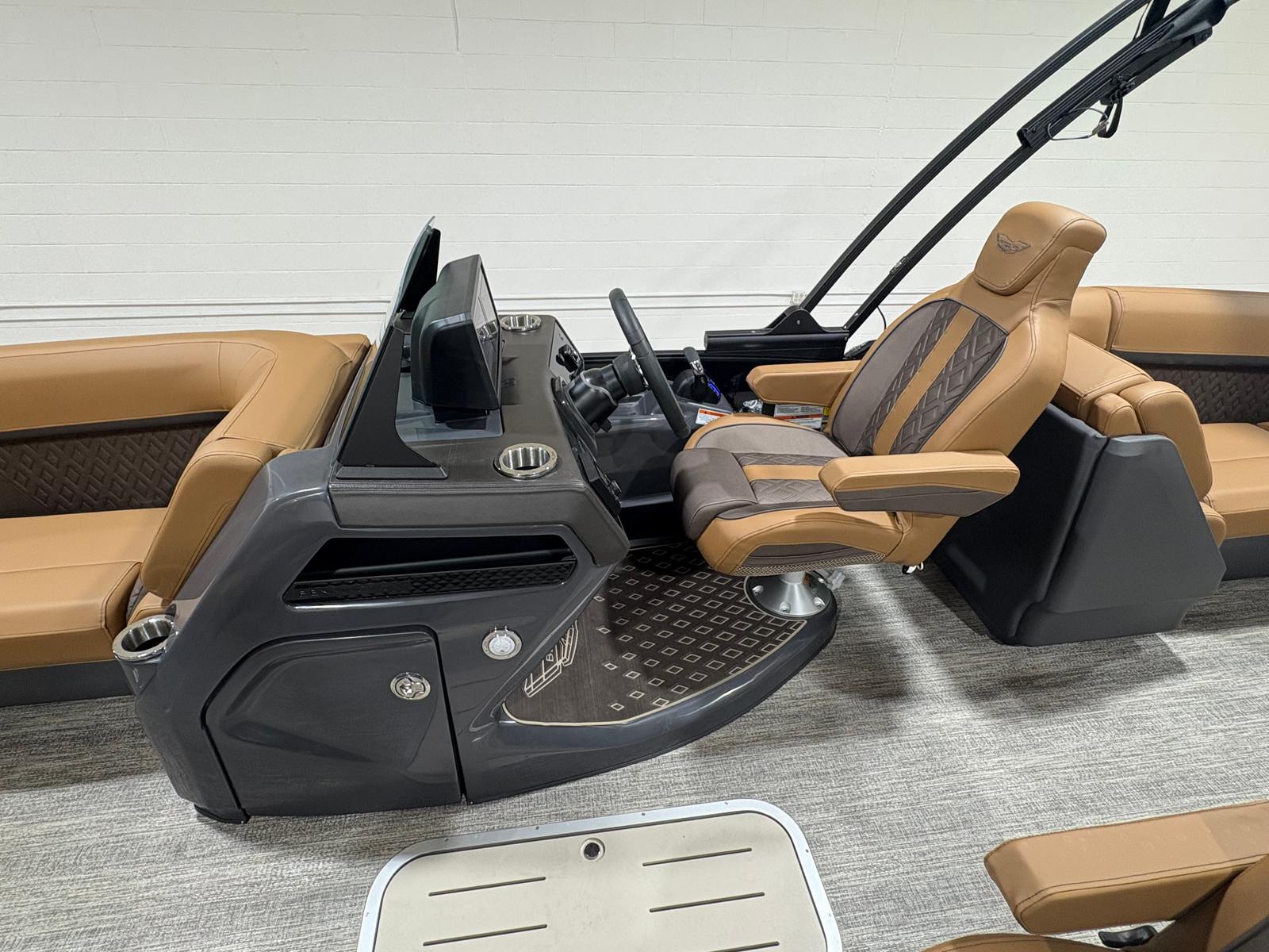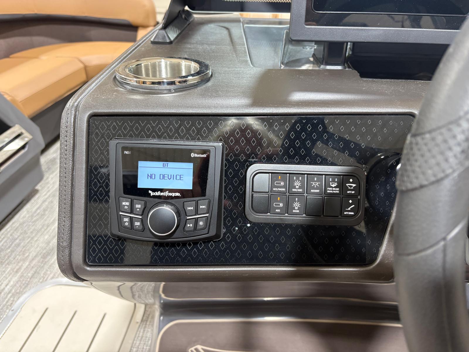 The Bennington 22 MFB SPS is loaded with premium features designed to enhance your time on the water. The RGB Control M Series lighting system allows you to set the perfect mood, with customizable colors that illuminate the deck and create a vibrant atmosphere for evening gatherings. Exterior side lighting and underwater lighting not only add to the boat’s striking appearance but also improve visibility and safety during nighttime excursions.For those who appreciate comfort and convenience, the Bimini - Electric Power Top Curved 12B S/M Blk offers effortless shade at the touch of a button, allowing you to relax in comfort no matter the weather. The toekick lights (1-37" and 3-41") provide subtle illumination along the deck, enhancing both safety and ambiance.Entertainment is taken to the next level with six Rockford Fosgate Ml Lighted Speakers, delivering crystal-clear sound throughout the boat. Whether you are hosting a lively party or enjoying a quiet afternoon, the audio experience is second to none. The twelve illuminated cupholders ensure that your favorite beverages are always within reach, even after the sun goes down. The elevated console Mythos provides a commanding view and intuitive control layout, making every journey smooth and enjoyable.