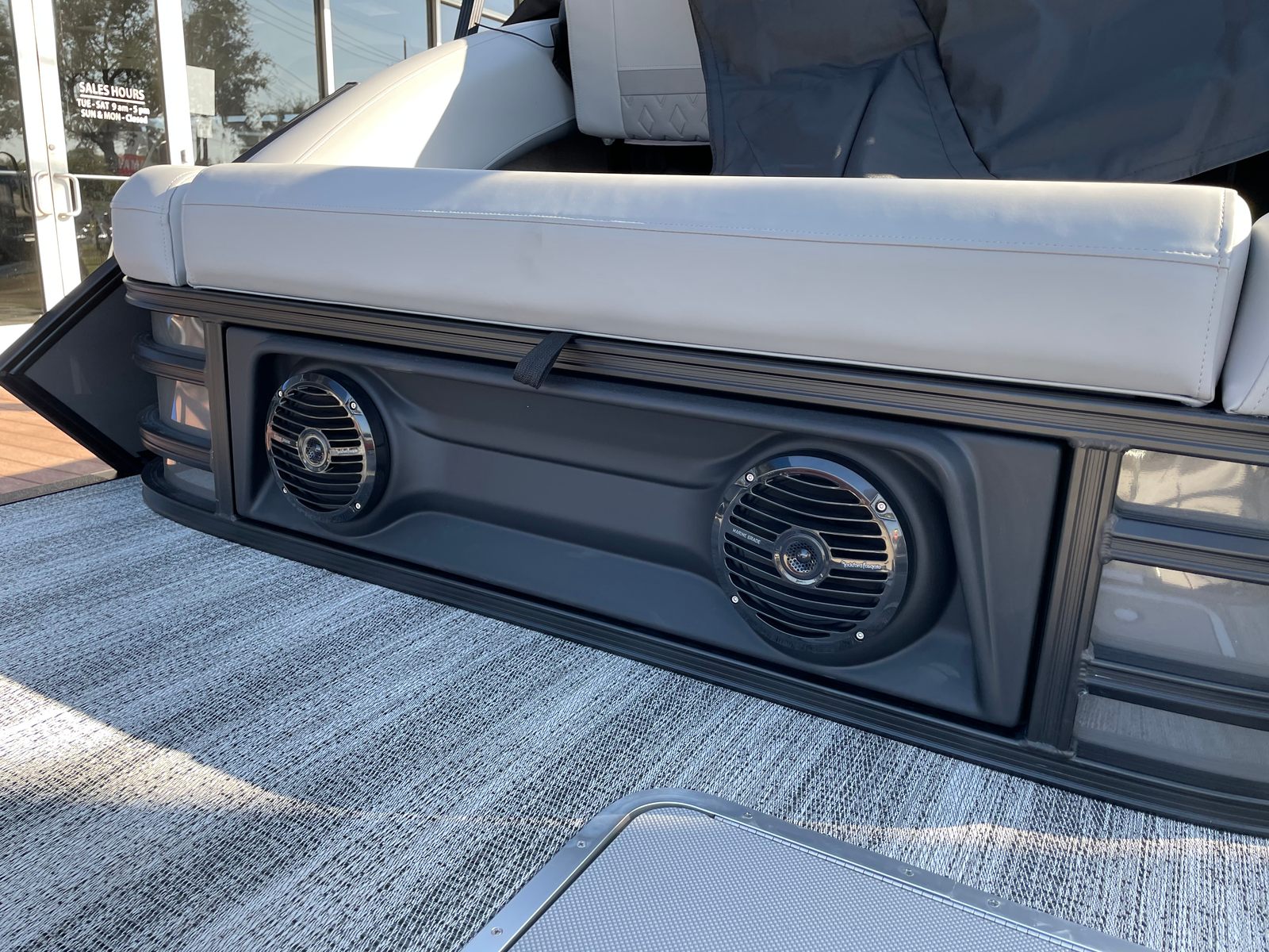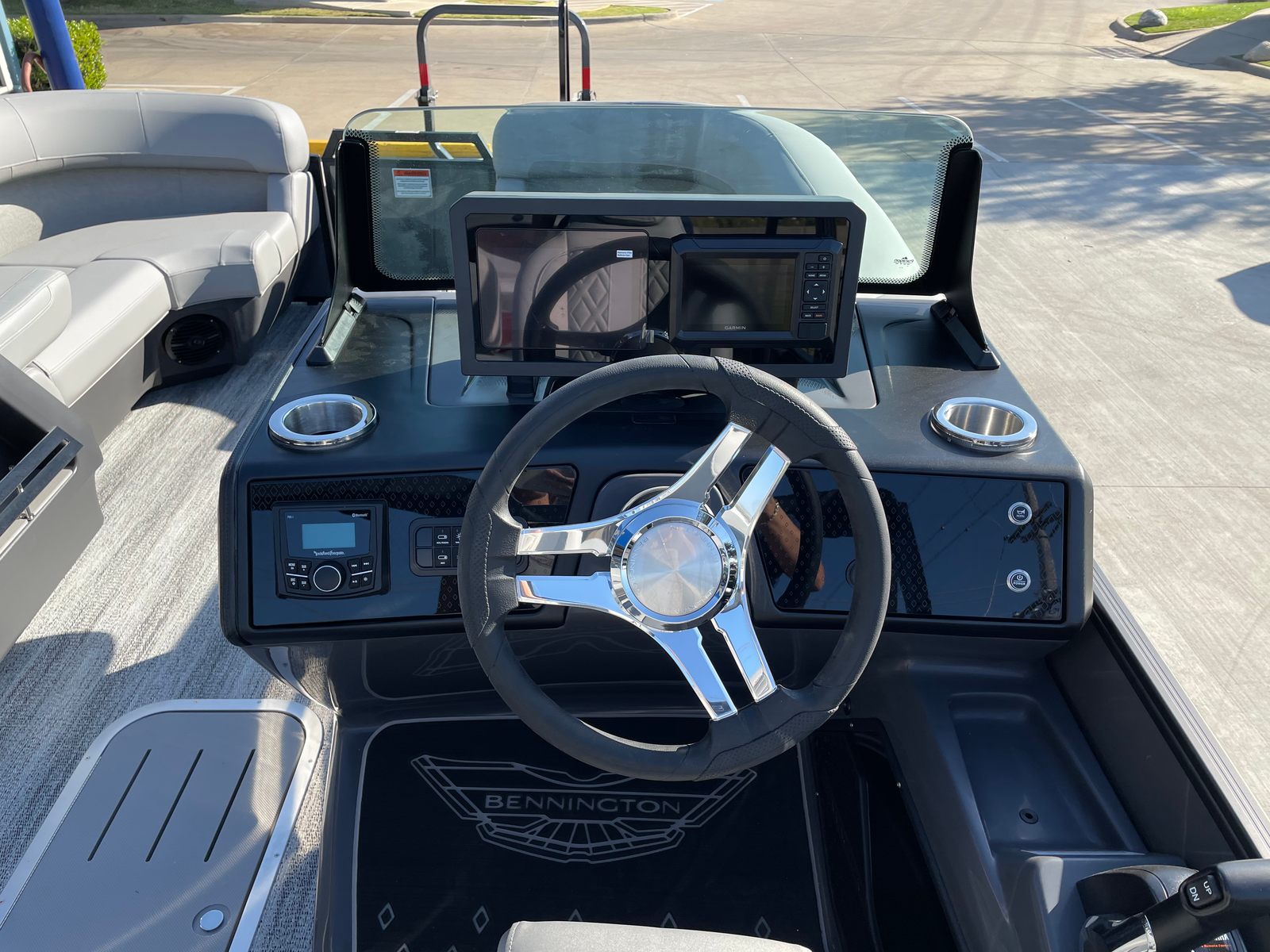 Step aboard and discover a host of premium features that set this pontoon apart. The interior accent in Graphite Simtex creates a sophisticated atmosphere, complemented by the Base Furniture M Series for ultimate comfort and style. The Zebrawood Matte Slate finish adds a touch of elegance, while the Accent - Smooth Metallic White provides a modern, eye-catching contrast. The Canvas - Midnight Black and Bimini - Curved M/LXS No Light Blk offer shade and protection from the elements, ensuring you can enjoy your time on the water in any weather.Practicality meets innovation with the Battery - Dual with Switch, giving you peace of mind and extended power for all your onboard electronics. The Ski Tow Bar opens up a world of recreational possibilities, from water skiing to tubing, making this Bennington boat for sale a versatile choice for thrill-seekers and families alike.