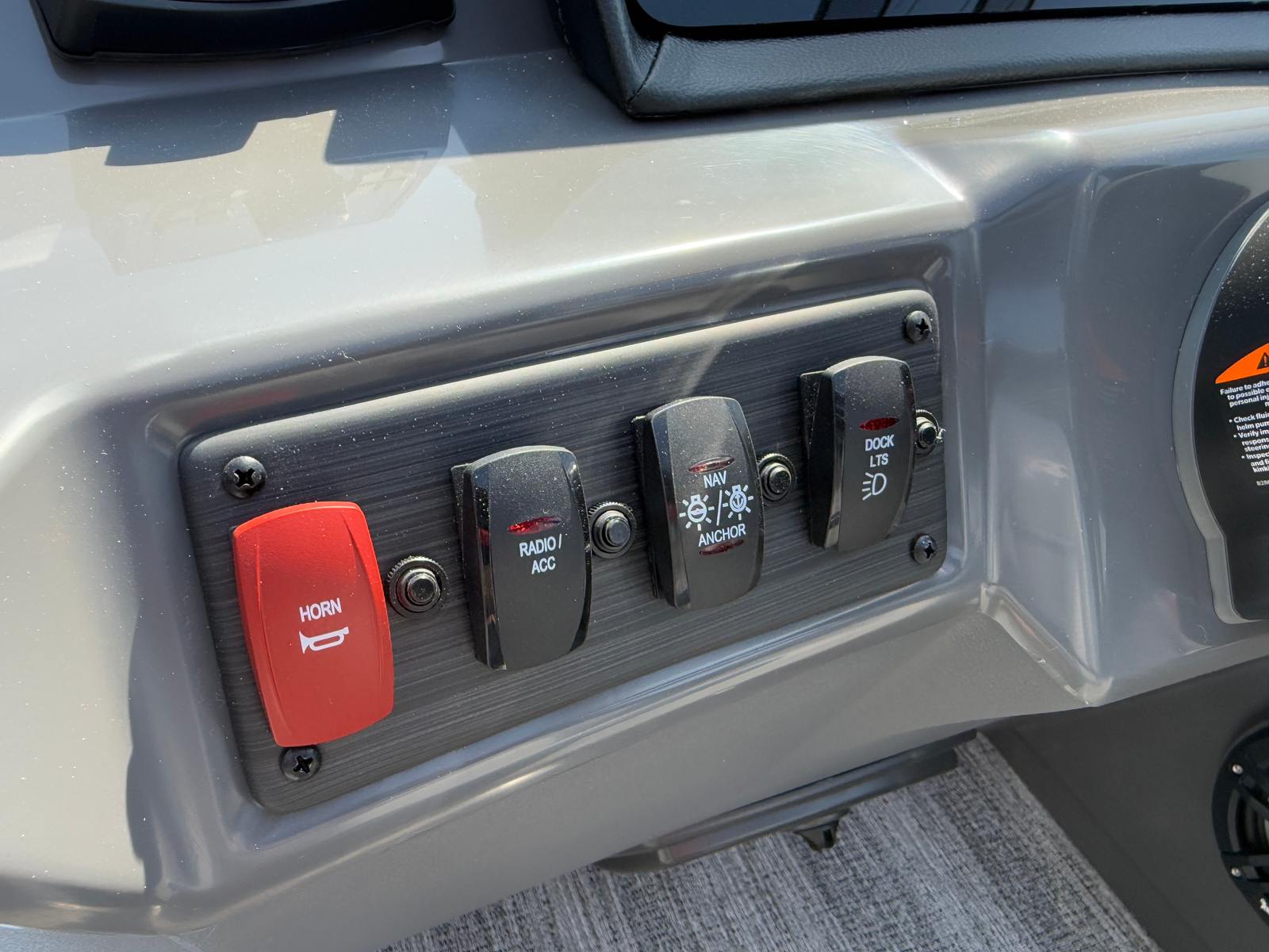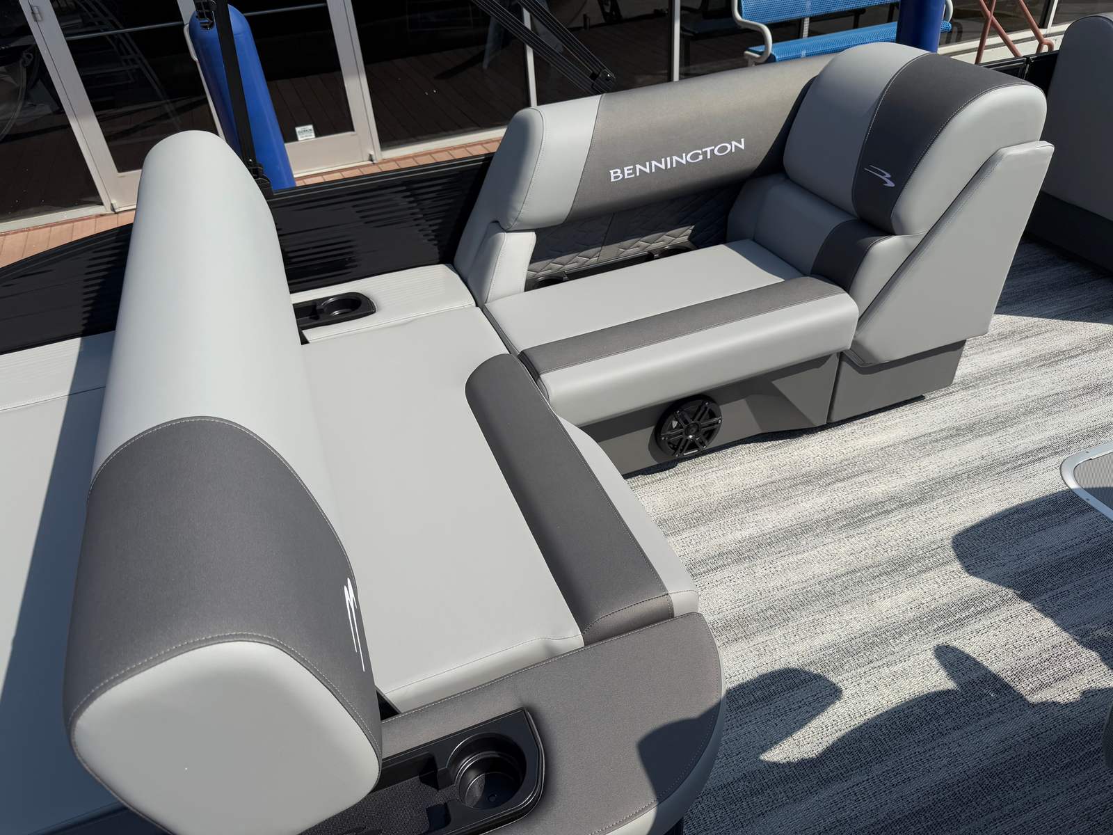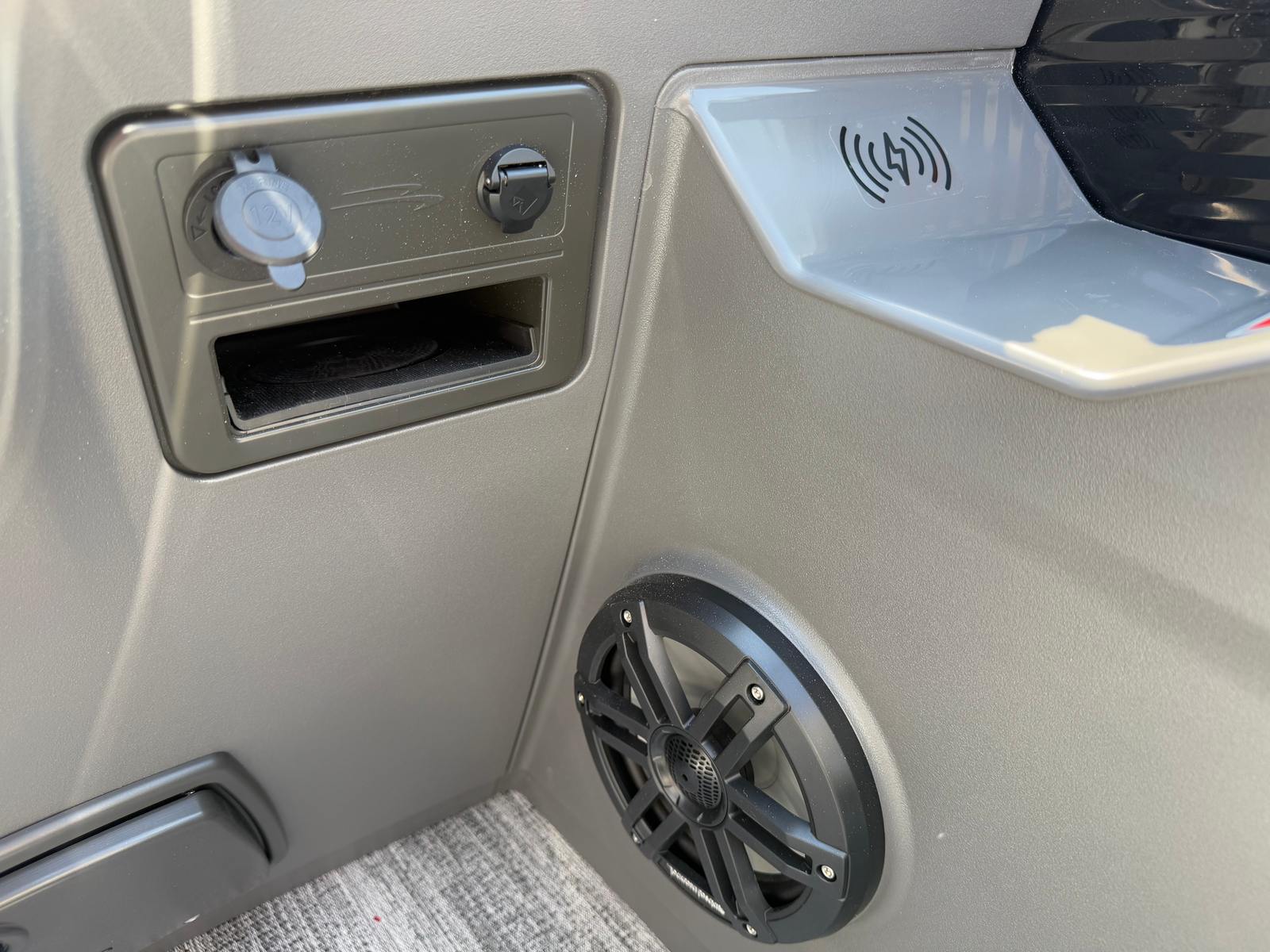 This new Bennington pontoon is loaded with premium features designed to enhance your time on the water. The dual battery switch with fuse ensures reliable power management, allowing you to enjoy extended outings without worry. The blackout logos add a touch of elegance, while the Benny Quick Fender Latch Kit in black makes docking and undocking a breeze.For those who love music and ambiance, the Bennington 22 SSB SPS comes equipped with a Rockford Fosgate 6.5" M1 lighted speaker system, featuring four speakers with an RGB control upgrade. The RGB speaker module allows you to customize the lighting to match your mood or the occasion, creating a vibrant atmosphere for every gathering. The Midnight Black canvas provides shade and protection, while the Shadow Grey and Carbon base/accent colors offer a refined aesthetic that complements the boat’s overall design.