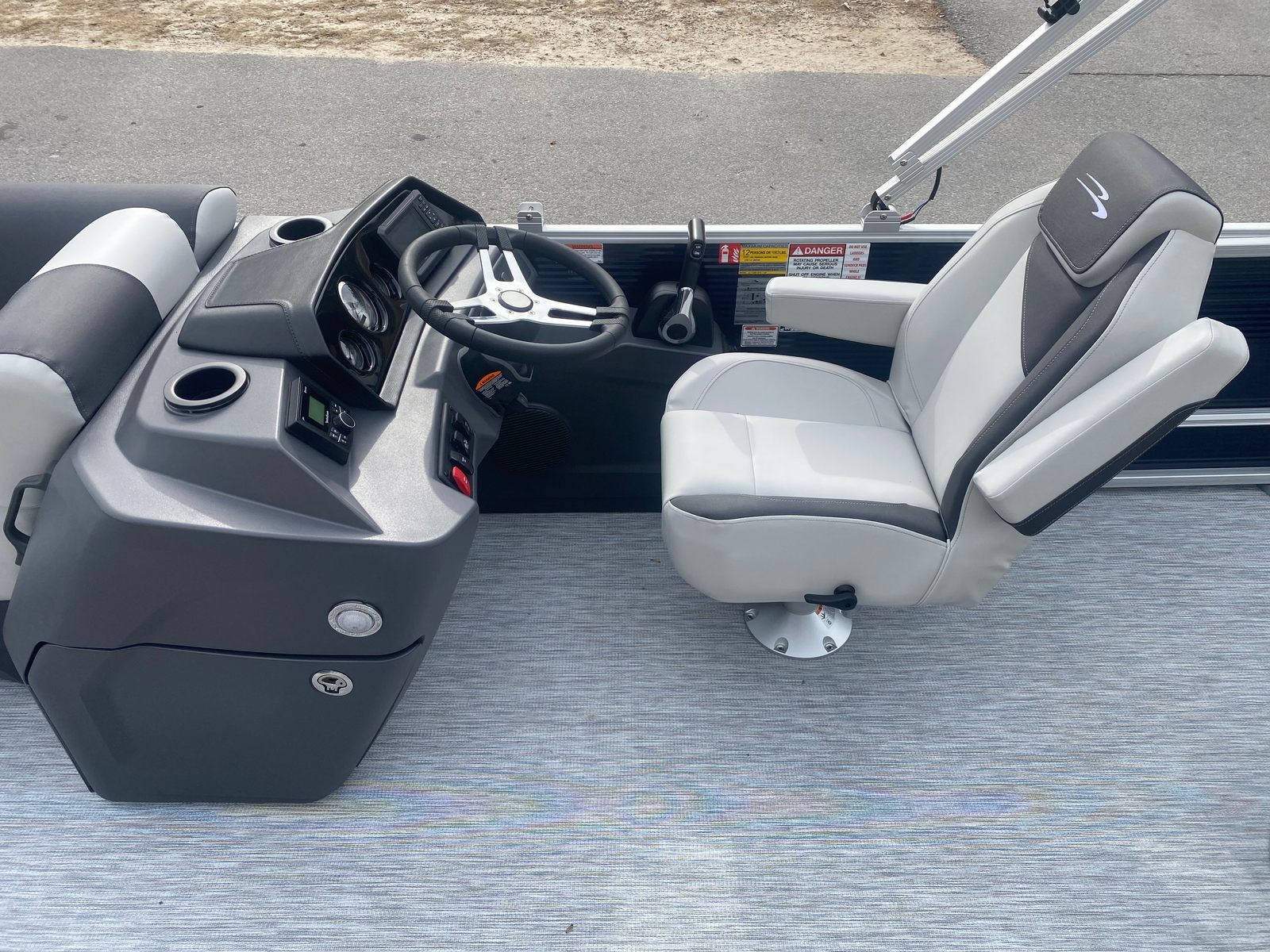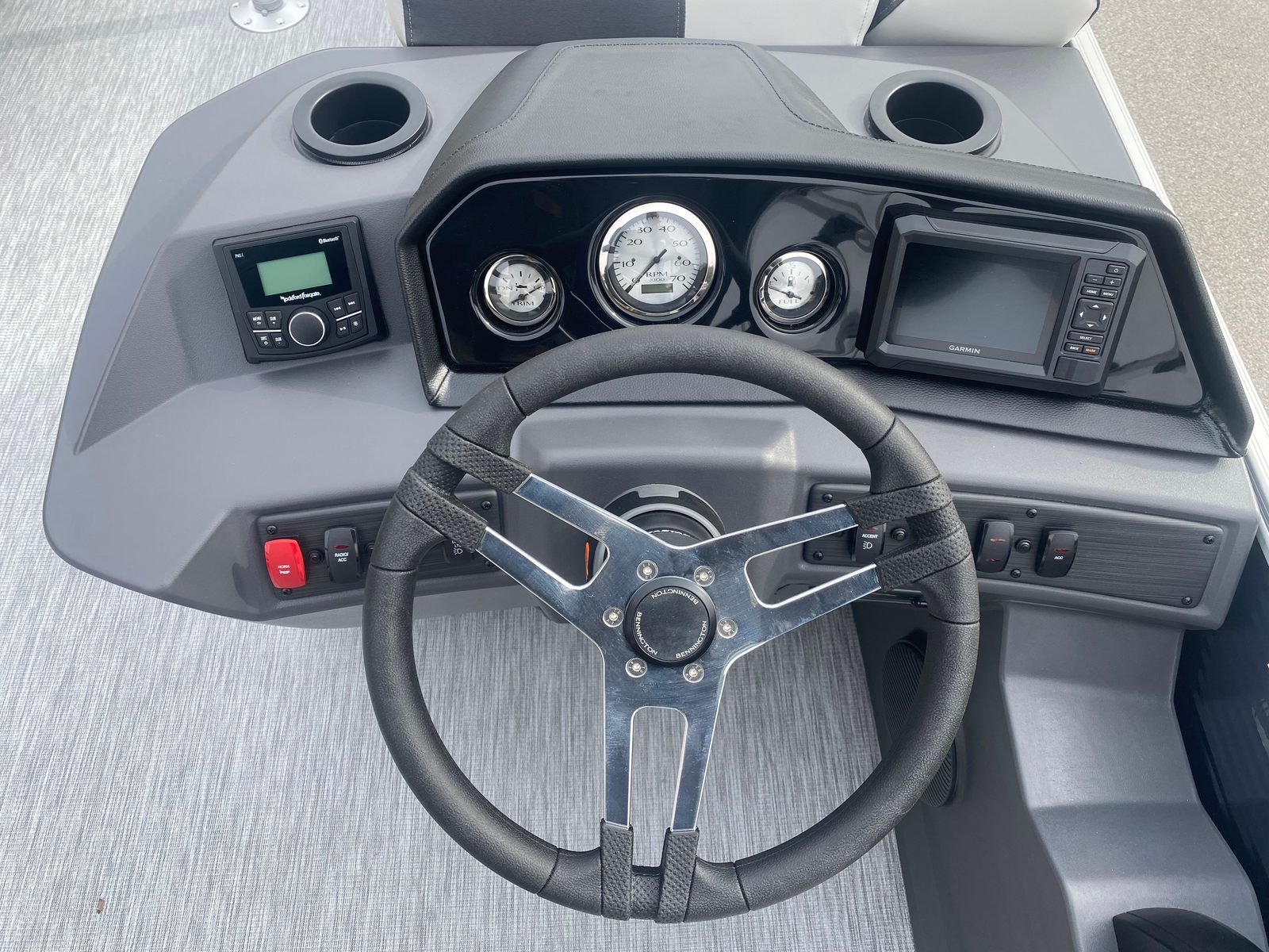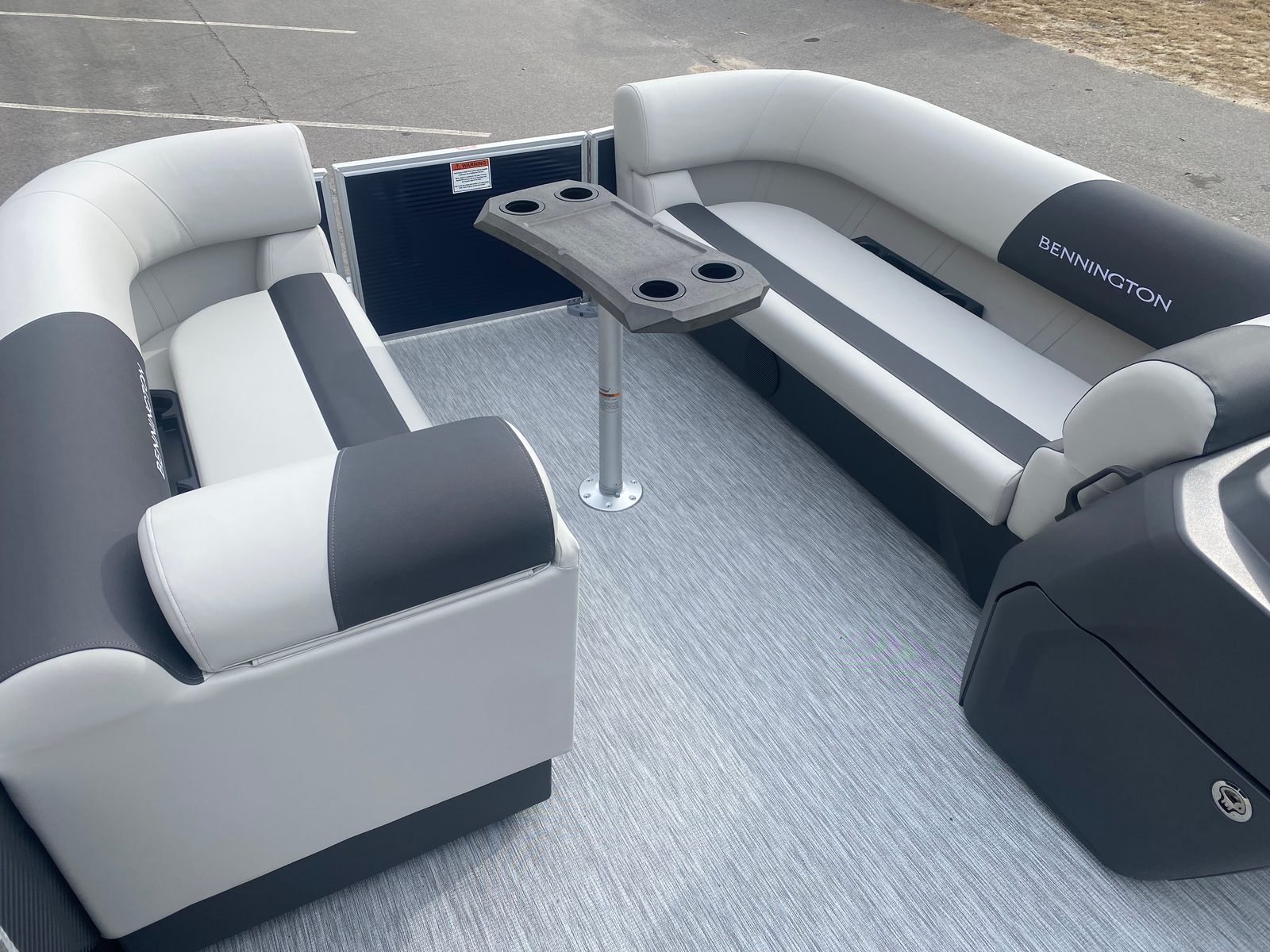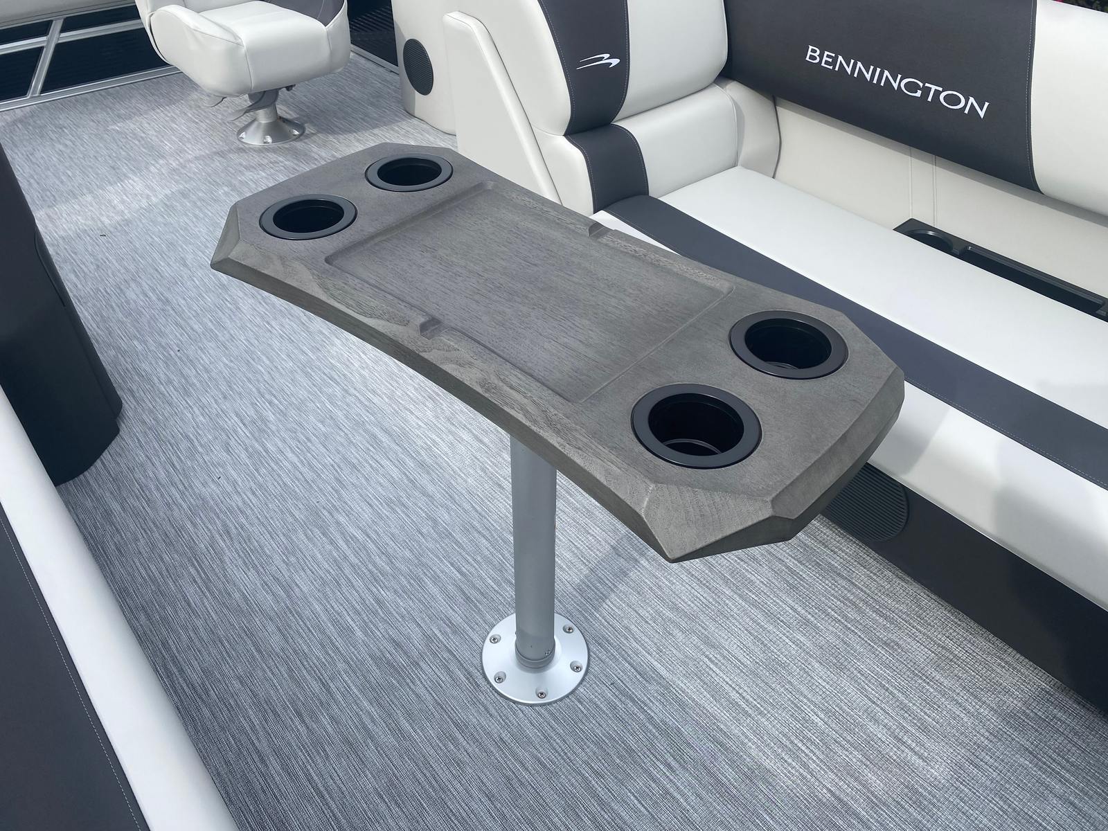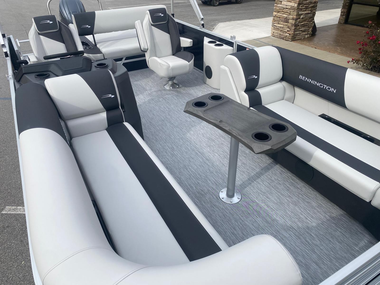 Step aboard and discover a host of special features designed to enhance your boating experience. The Midnight Blue paneling creates a sophisticated exterior, complemented by Leon Light Silver accents and Slate Simtex interior highlights for a modern, inviting atmosphere. The Ironwood Dash Accent adds a touch of elegance to the helm, while the Dimensional Brushed Silver Logos showcase Bennington’s signature style.For tech-savvy boaters, the wireless charger keeps your devices powered up throughout your journey, ensuring you stay connected and entertained. The Ski Tow Bar – SPS is perfect for water sports enthusiasts, providing a secure and convenient way to tow skiers, wakeboarders, or inflatable tubes. The spacious deck layout offers plenty of room for lounging, socializing, and enjoying the scenery, while the thoughtfully designed seating ensures comfort for all passengers.