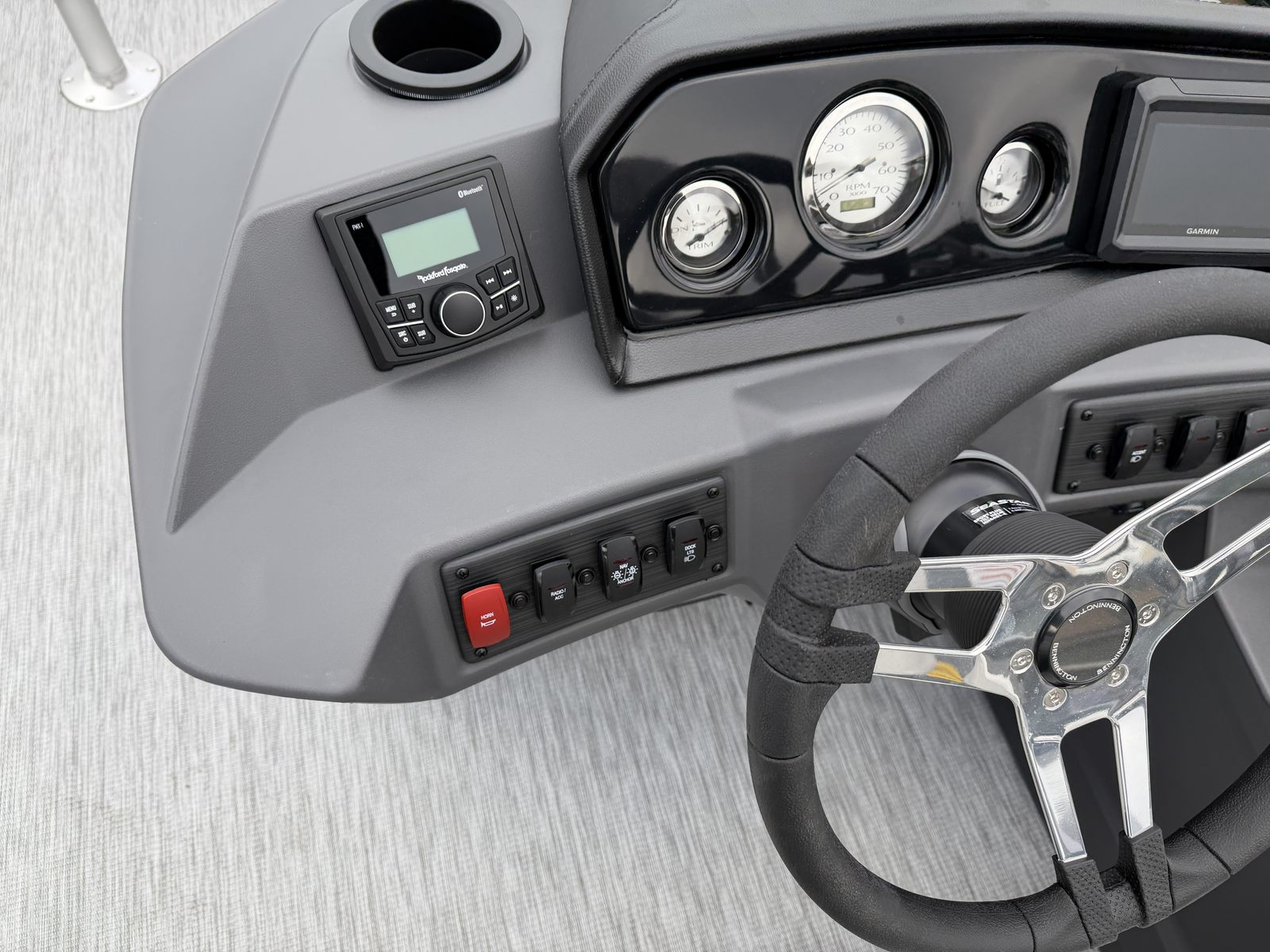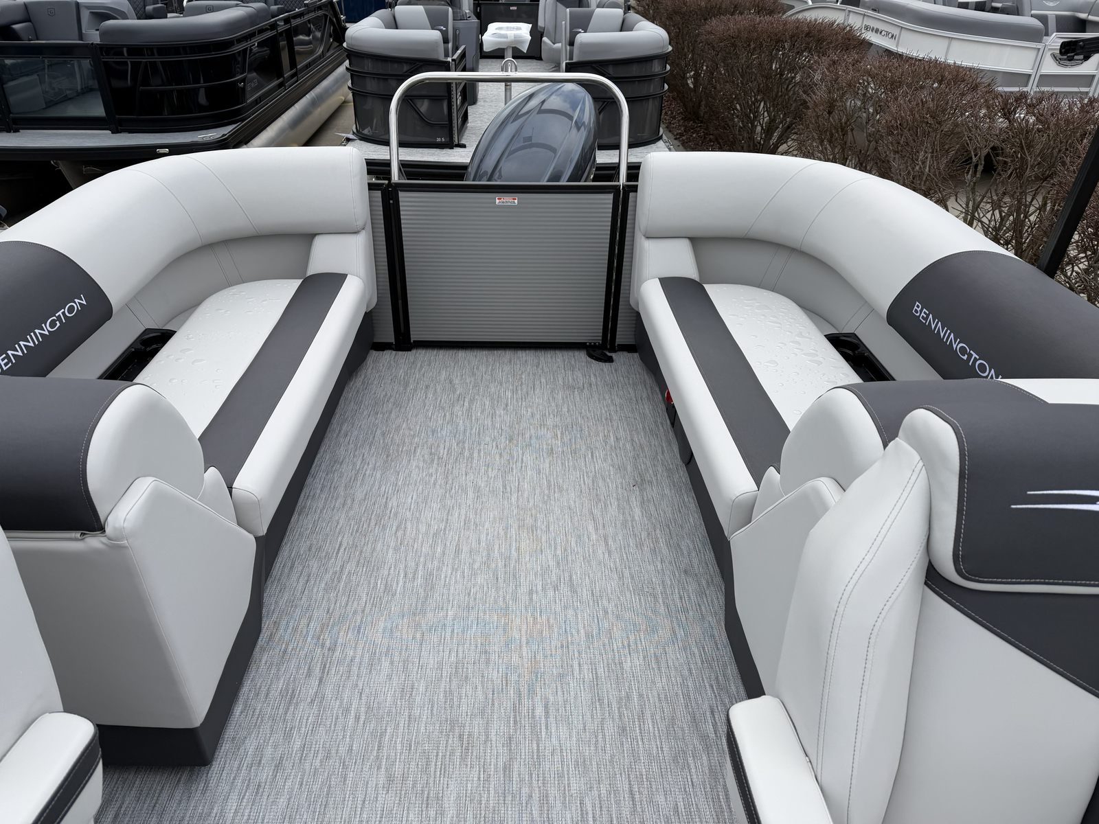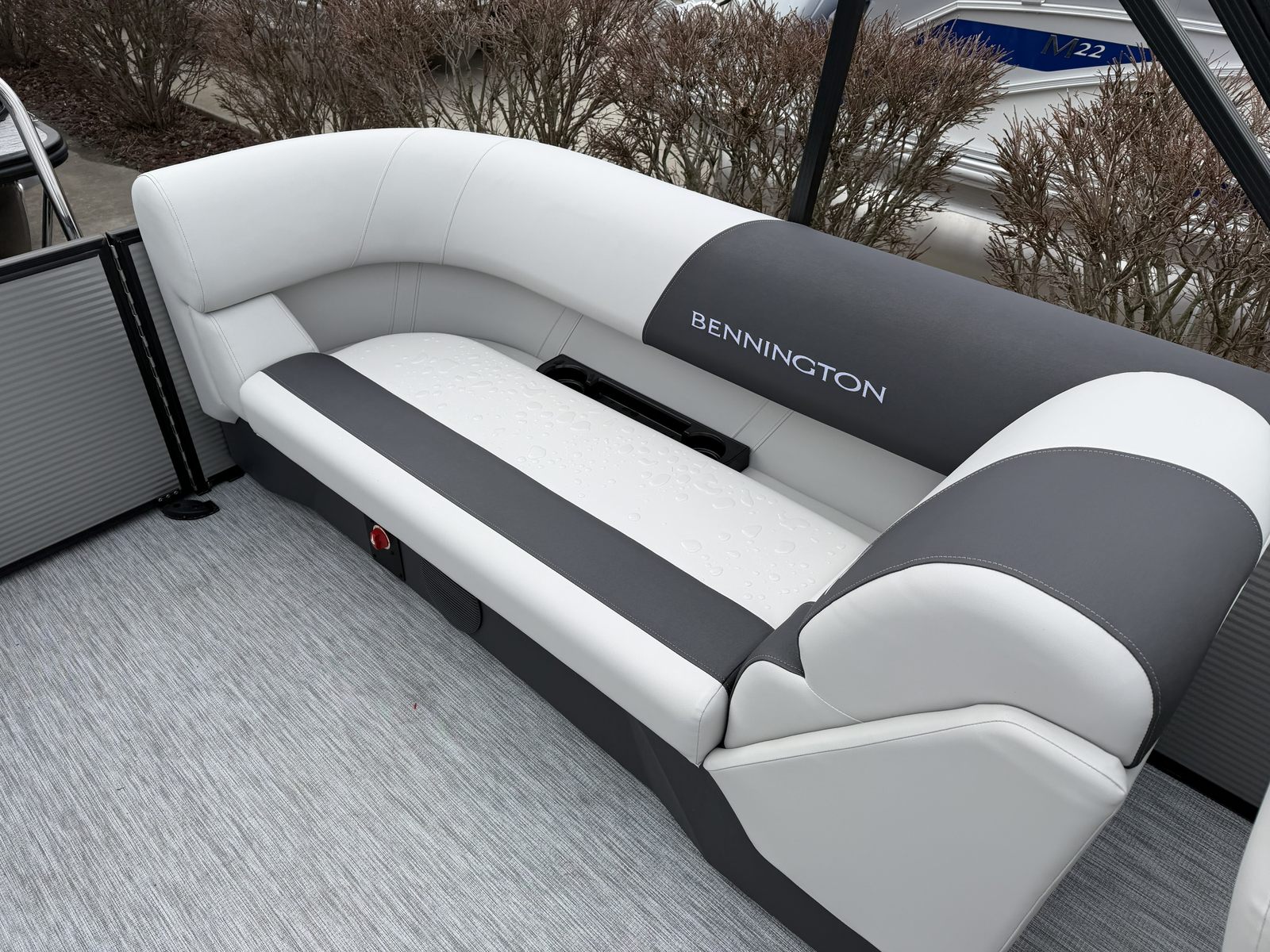 Owning the Bennington 22 SSR SPS pontoon means embracing a lifestyle of fun, relaxation, and connection. The generous layout offers plenty of room for guests, making it ideal for social gatherings, family outings, or romantic escapes. The plush seating and thoughtful design ensure everyone on board enjoys maximum comfort, whether you are lounging in the sun or sharing a meal on the water.The powerful Yamaha engine delivers exhilarating performance, while the advanced features make every trip effortless and enjoyable. The wireless charger keeps your devices ready for music, navigation, or capturing memories, and the stylish finishes create an inviting atmosphere that enhances every outing. With the Blackout Luxe Package and Ironwood Dash Accent, you will enjoy a boat that is as beautiful as it is functional.