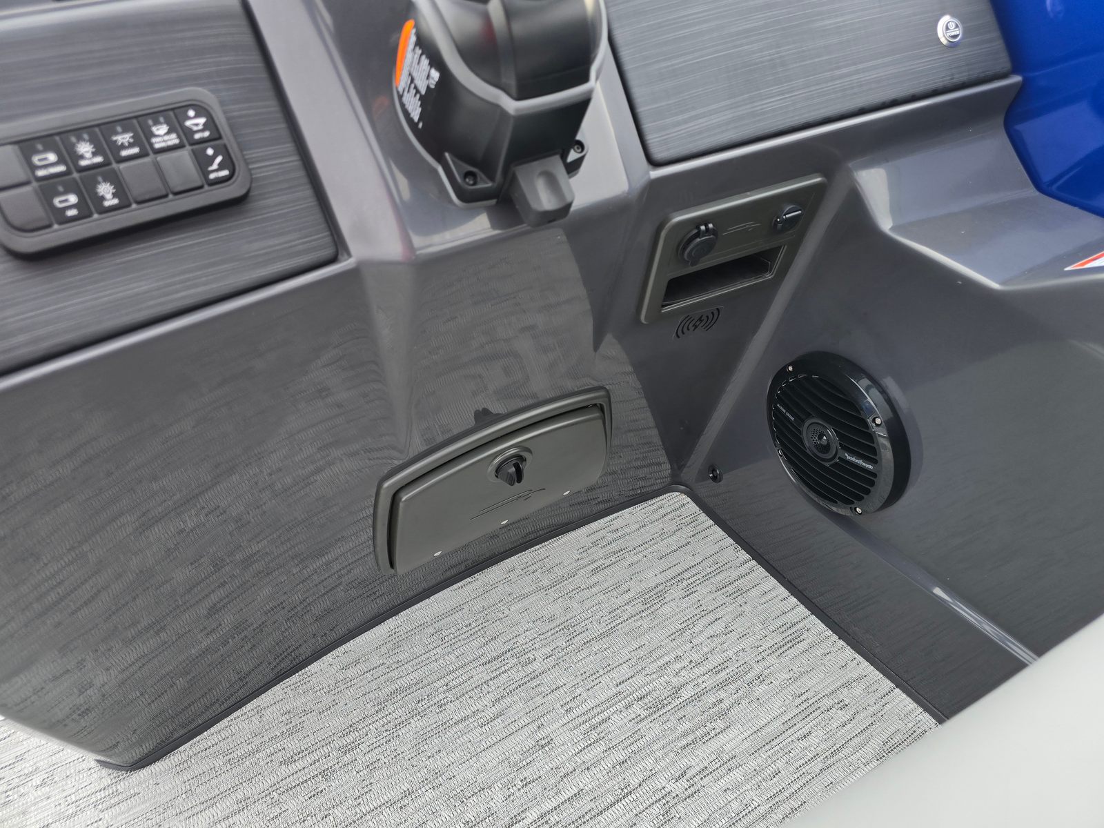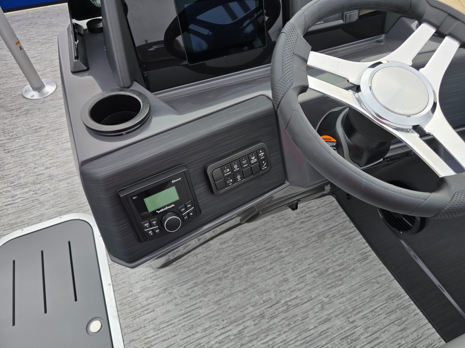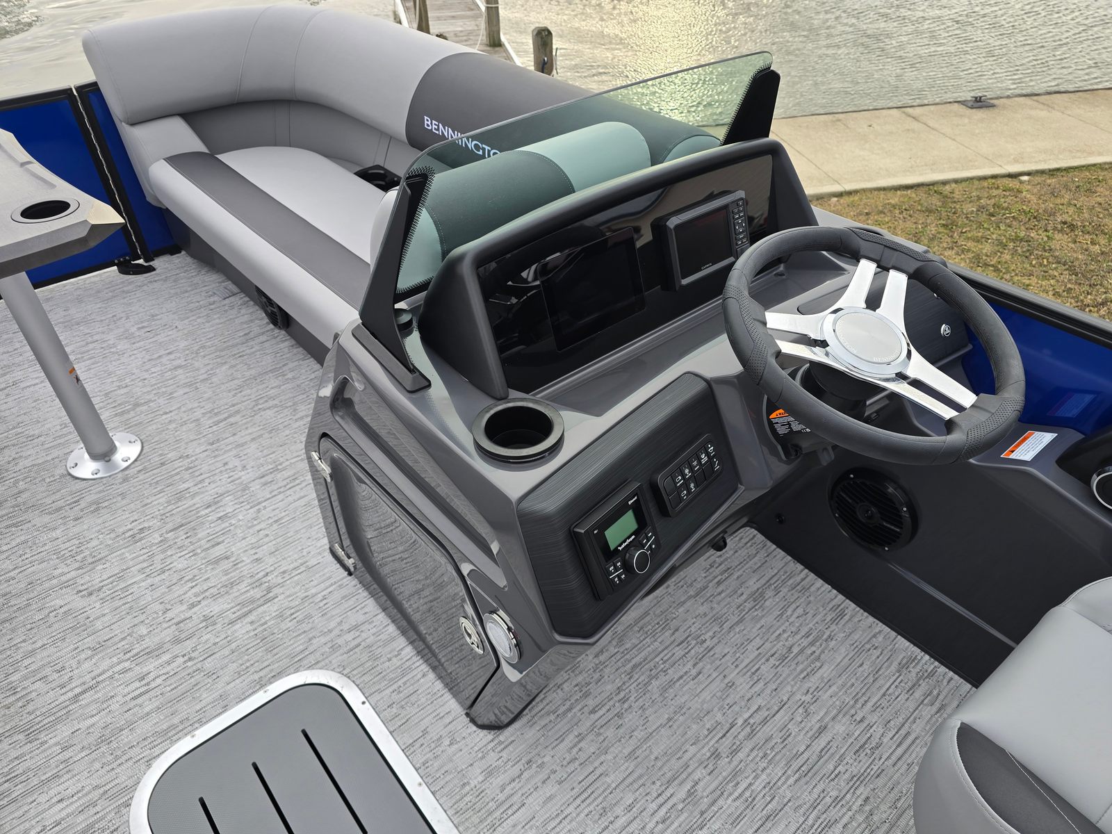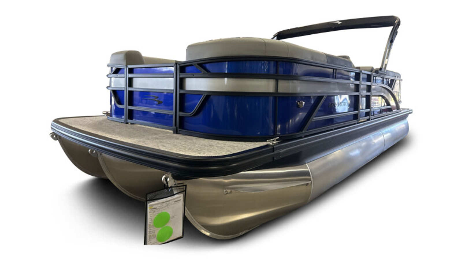 This Bennington pontoon boat for sale is packed with premium features designed to enhance your boating experience. The single switch battery system provides reliable power management, while the electric power top curved bimini offers convenient shade at the touch of a button. The smooth metallic silver accent and midnight black canvas create a sophisticated look, complemented by shadow grey and ironwood dash accents for a refined interior feel. The Blackout Luxe Package adds an extra layer of elegance, making this pontoon stand out from the crowd. For those who love water sports, the ski tow bar is a must-have feature, allowing for easy and safe towing of skiers and wakeboarders.