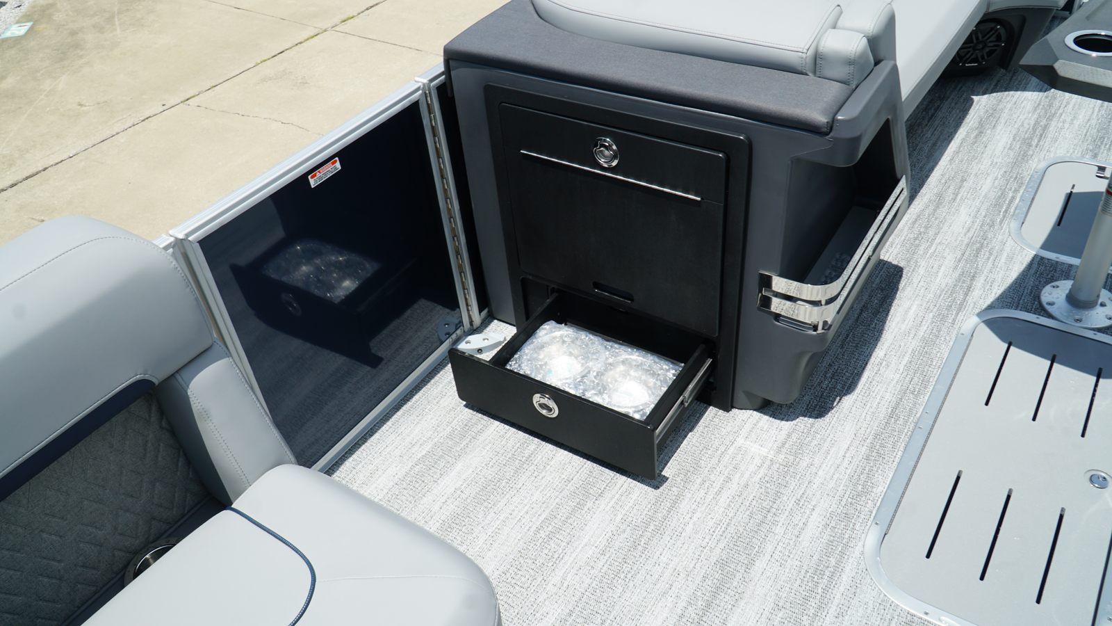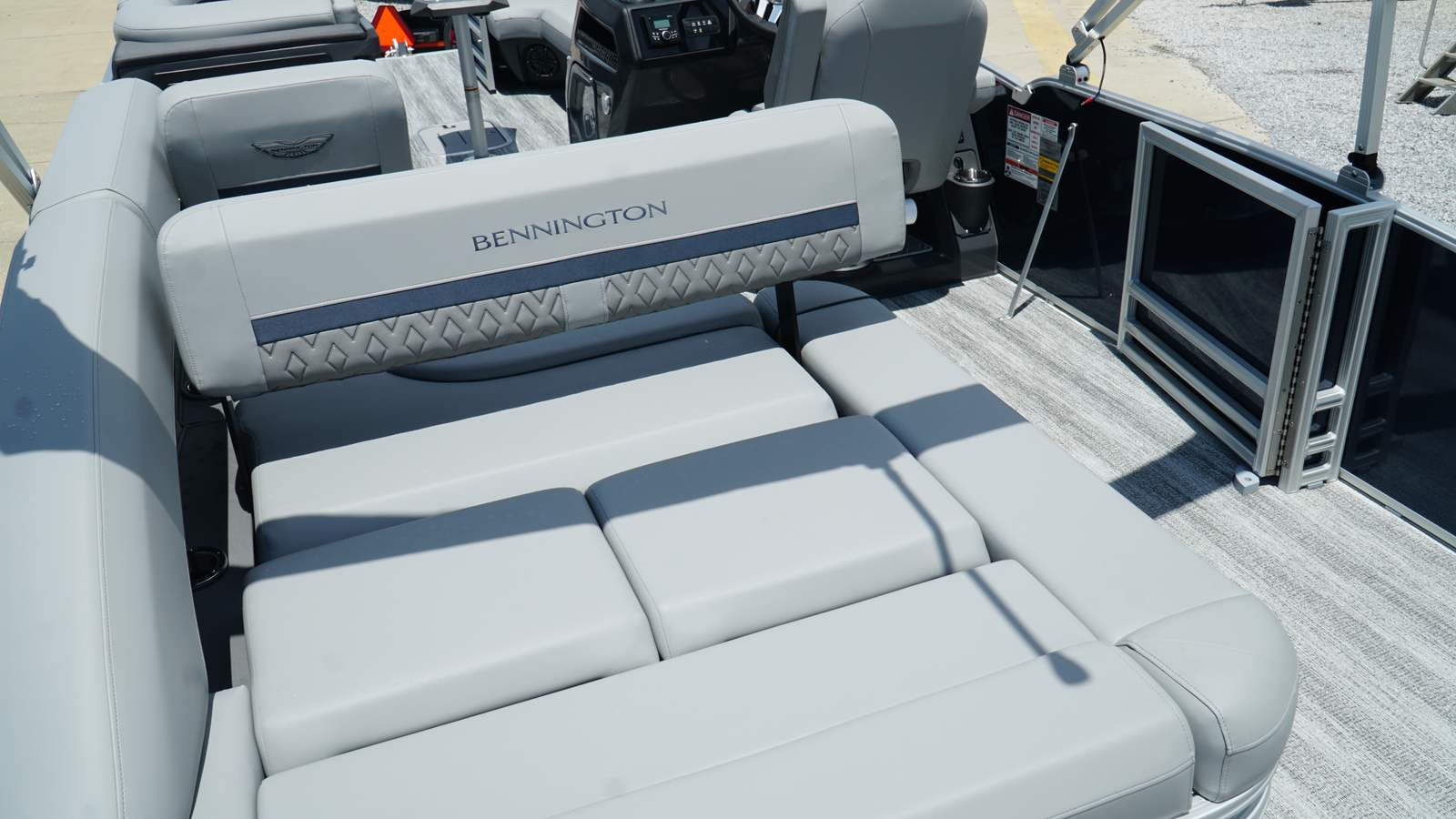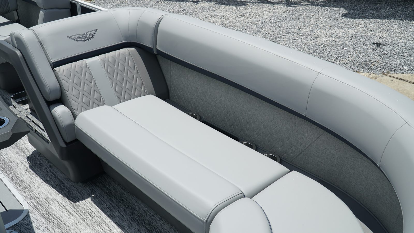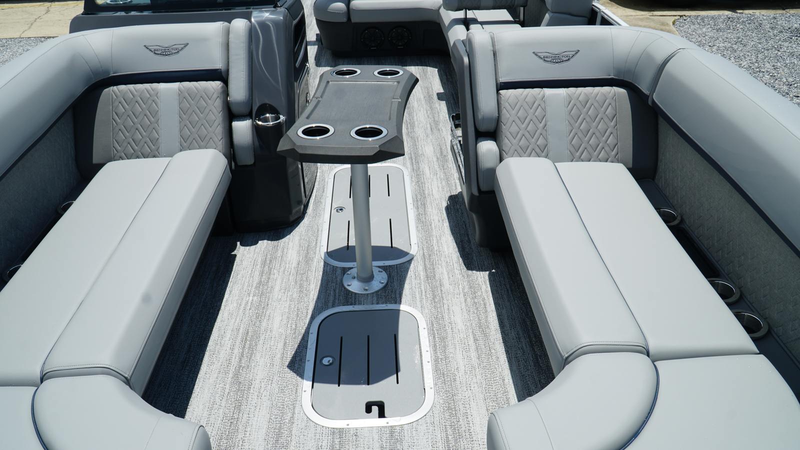 The Bennington 24 MSB SPS is packed with special features designed to enhance your boating experience. The dual switch battery system with fuse ensures reliable power management, while the RGB Control M Series allows you to customize the ambiance with vibrant lighting options. Toekick lights (2-62") add a stylish touch and improve visibility during evening cruises. Entertainment is elevated with six Rockford Fosgate M1 lighted speakers, delivering crystal-clear sound and immersive audio for your favorite playlists. The elevated console with pocket Mythos provides convenient storage and easy access to controls, while the interior accent in Ocean Blue Simtex creates a sophisticated and inviting atmosphere. Every detail has been thoughtfully considered to maximize comfort, convenience, and enjoyment.