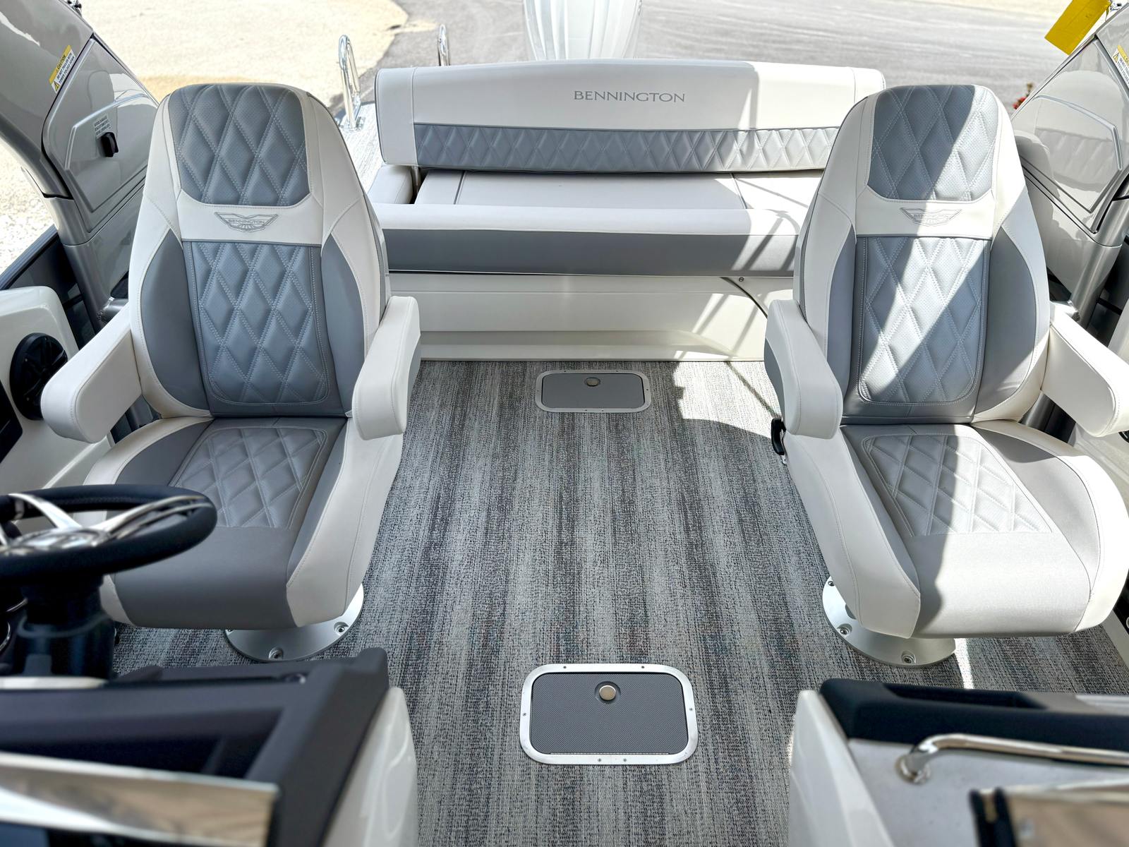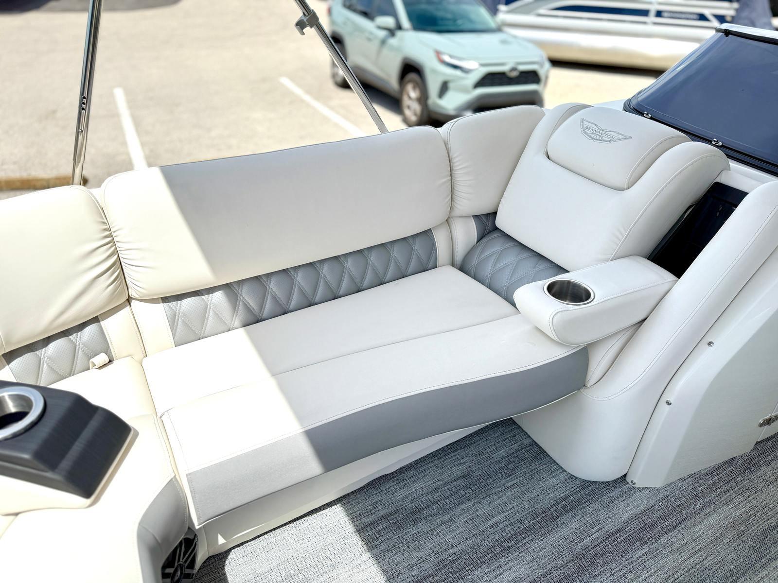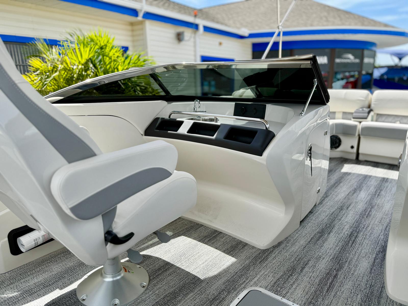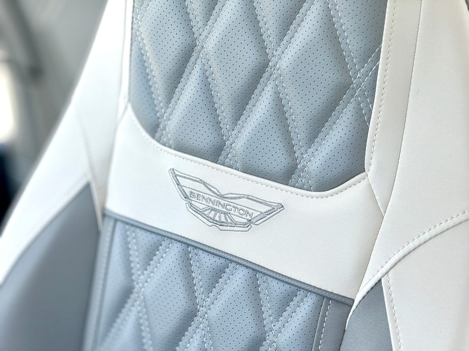 Step aboard and discover a host of premium features designed to enhance every moment on the water. The Bennington 25 Qxsbwa ESP boasts RGB toe kick lighting, creating a vibrant and customizable atmosphere for evening cruises. Seven illuminated cupholders add a touch of elegance and convenience, ensuring your favorite beverages are always within reach. Exterior side lighting and underwater lighting not only enhance the boat’s visual appeal but also improve safety and visibility during nighttime outings.The interior is adorned with perforated silver accents, complementing the Arctic Ice White color scheme and Metallic Silver panels for a sophisticated, contemporary look. Blackout logos add a bold finishing touch, while every detail reflects Bennington’s commitment to quality and craftsmanship. Whether you’re hosting a lively gathering or enjoying a peaceful sunset, these features set the stage for memorable experiences.