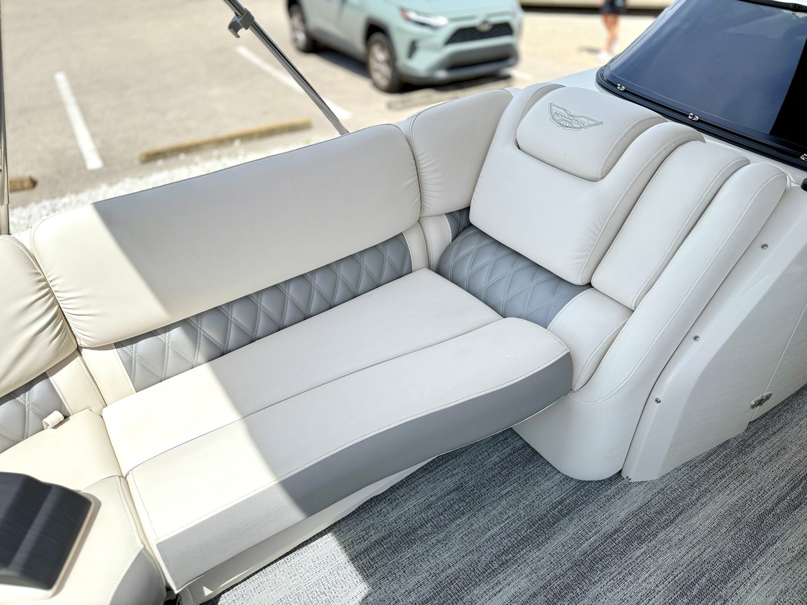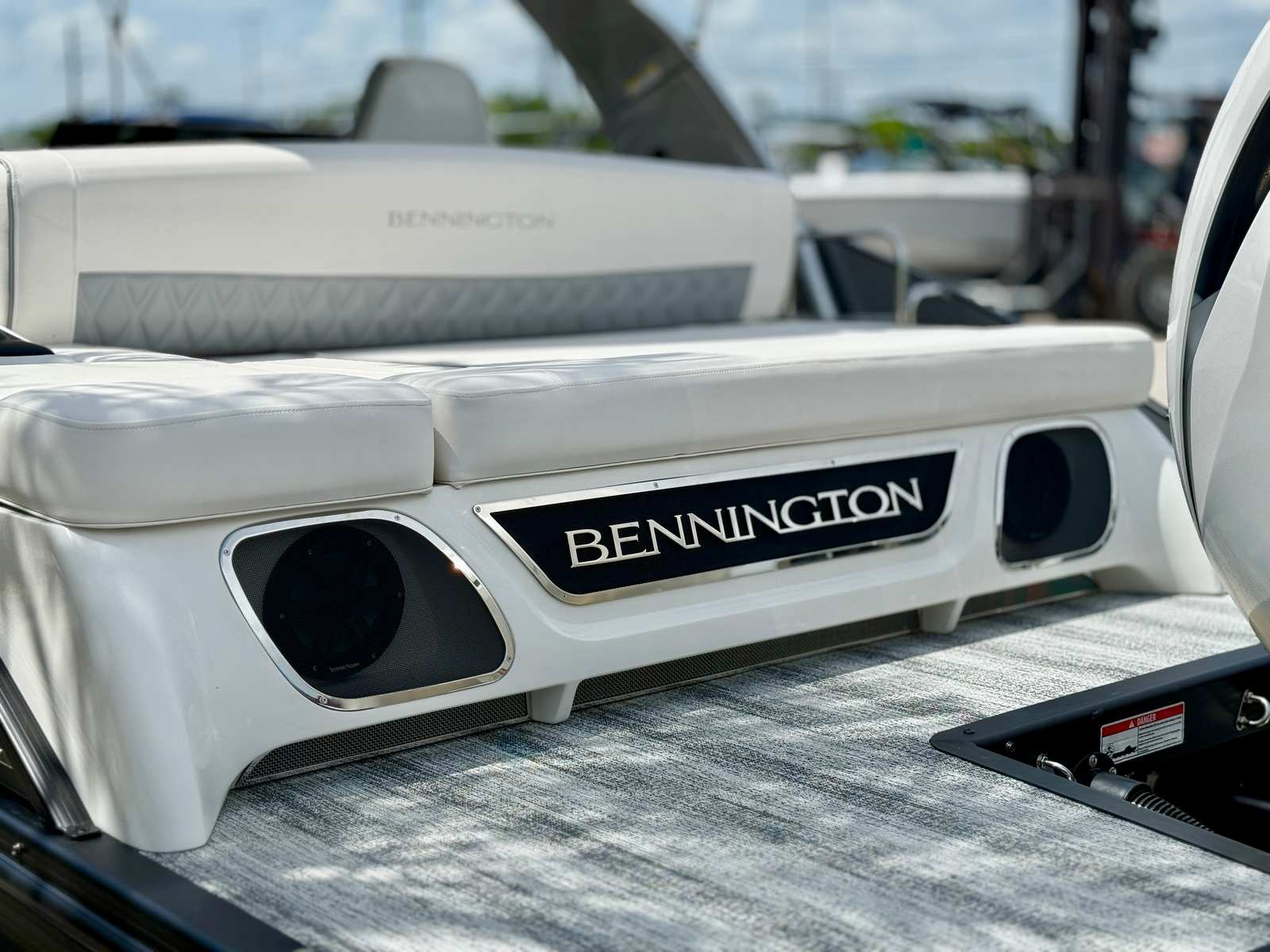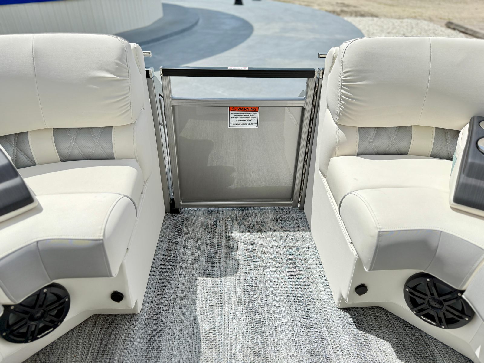Step aboard and discover a host of premium features designed to enhance every moment on the water. The Bennington 25 Qxsbwa ESP boasts RGB toe kick lighting, creating a vibrant and customizable atmosphere for evening cruises. Seven illuminated cupholders add a touch of elegance and convenience, ensuring your favorite beverages are always within reach. Exterior side lighting and underwater lighting not only enhance the boat’s visual appeal but also improve safety and visibility during nighttime outings.The interior is adorned with perforated silver accents, complementing the Arctic Ice White color scheme and Metallic Silver panels for a sophisticated, contemporary look. Blackout logos add a bold finishing touch, while every detail reflects Bennington’s commitment to quality and craftsmanship. Whether you’re hosting a lively gathering or enjoying a peaceful sunset, these features set the stage for memorable experiences.