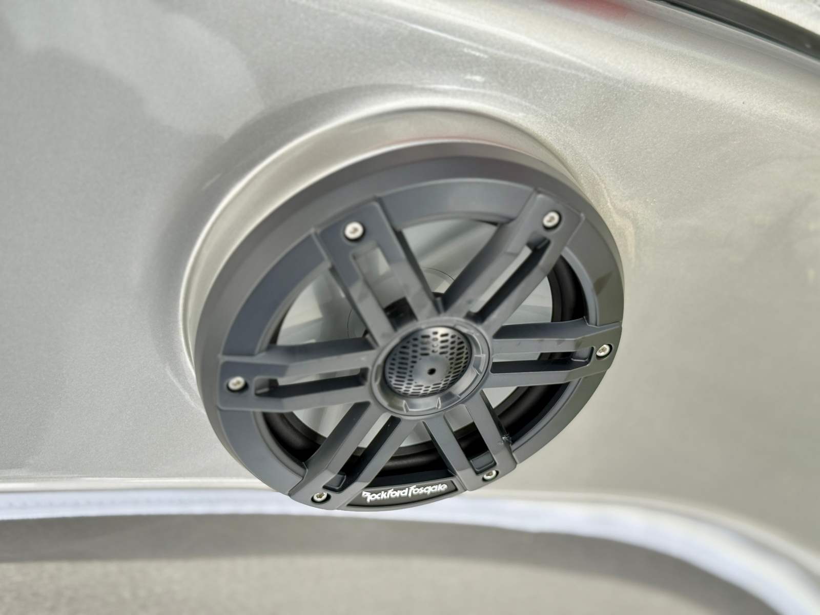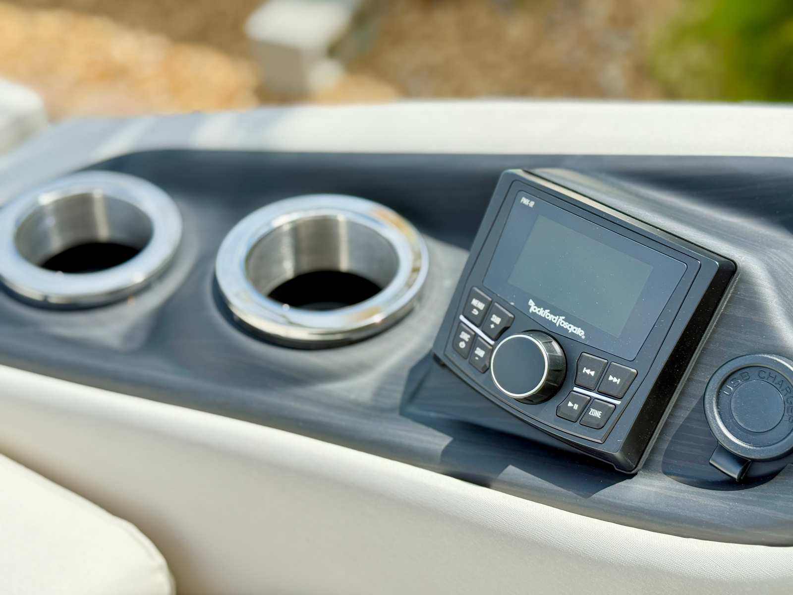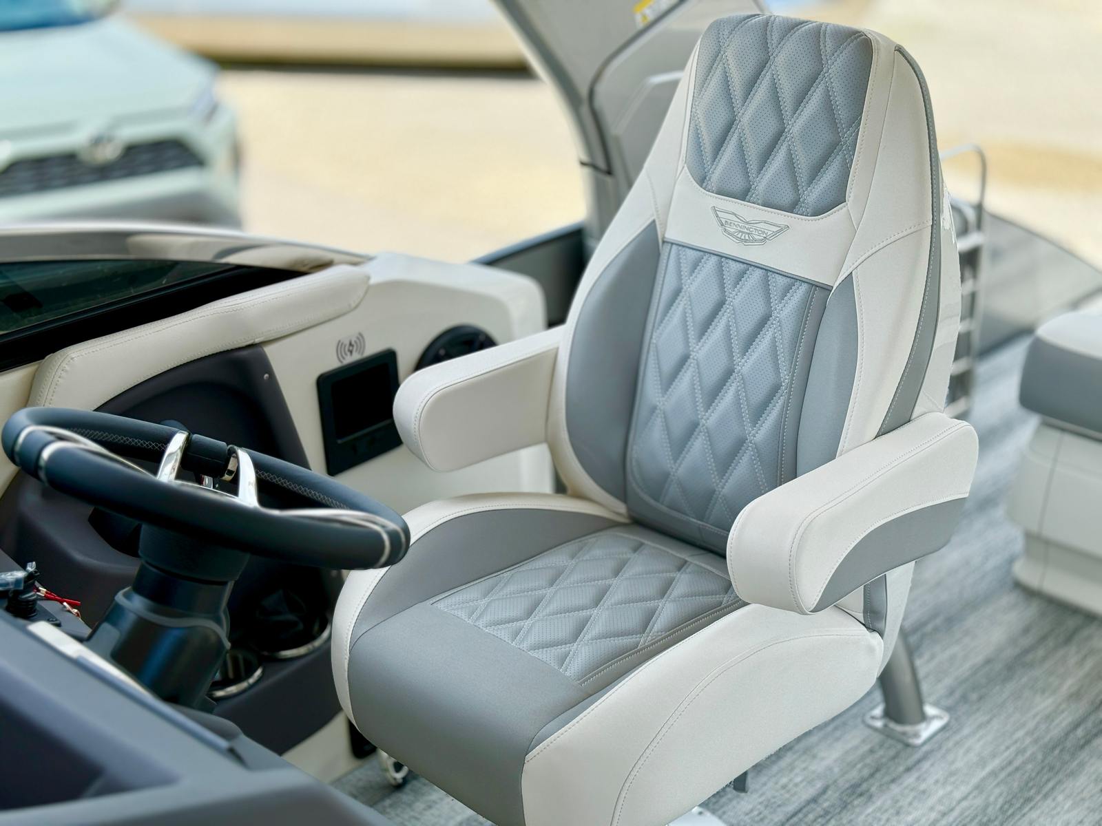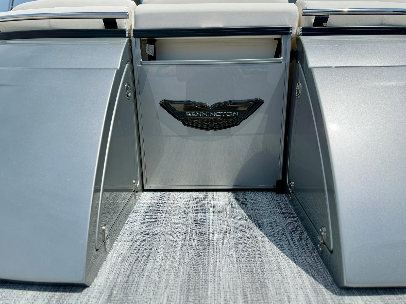 Step aboard and discover a host of premium features designed to enhance every moment on the water. The Bennington 25 Qxsbwa ESP boasts RGB toe kick lighting, creating a vibrant and customizable atmosphere for evening cruises. Seven illuminated cupholders add a touch of elegance and convenience, ensuring your favorite beverages are always within reach. Exterior side lighting and underwater lighting not only enhance the boat’s visual appeal but also improve safety and visibility during nighttime outings.The interior is adorned with perforated silver accents, complementing the Arctic Ice White color scheme and Metallic Silver panels for a sophisticated, contemporary look. Blackout logos add a bold finishing touch, while every detail reflects Bennington’s commitment to quality and craftsmanship. Whether you’re hosting a lively gathering or enjoying a peaceful sunset, these features set the stage for memorable experiences.