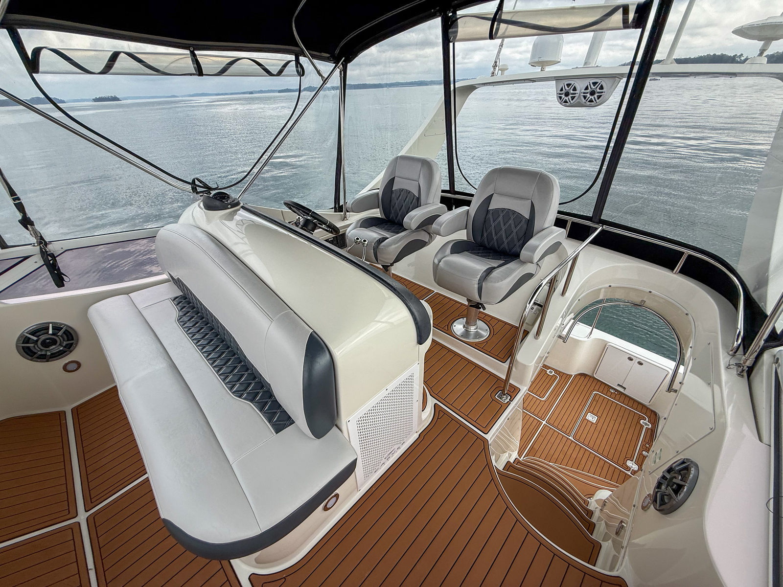 This particular boat has received several upgrades that improve both appearance and functionality. The cockpit features SeaDeck flooring throughout, providing a clean look while adding comfort and traction underfoot. A newer canvas and Isinglass enclosure helps extend the boating season and keeps the cockpit protected from the elements. The helm seating and forward helm bench have been reupholstered, giving the helm area a refreshed, modern feel.