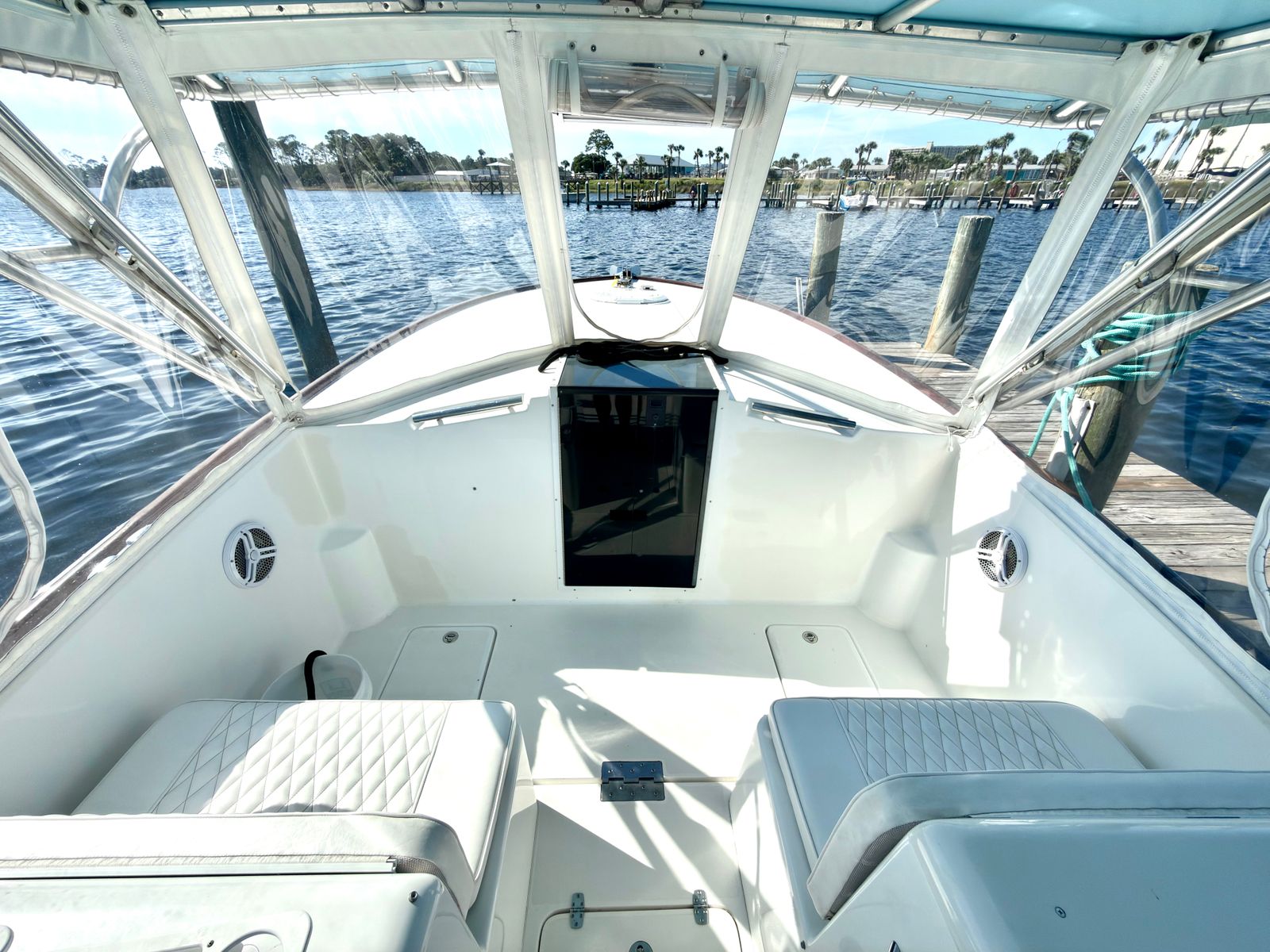 The Deno Express Cuddy is designed with a focus on comfort, convenience, and versatility. Its Cuddy Cabin layout offers a cozy and private space for relaxation, allowing you to escape the sun or enjoy a peaceful nap during your adventures. The spacious deck provides plenty of room for socializing, fishing, or simply soaking up the scenery. The 32-foot length ensures that there’s enough space for all your activities, while the thoughtful design makes every inch of the boat functional and inviting.Special features of the Deno Express Cuddy include its twin-engine setup, which not only boosts performance but also adds a layer of safety and reliability. The cabin area is perfect for storing gear, preparing snacks, or taking a break from the action. The overall build quality reflects Deno’s commitment to craftsmanship, ensuring that this used boat remains a dependable companion for years to come.