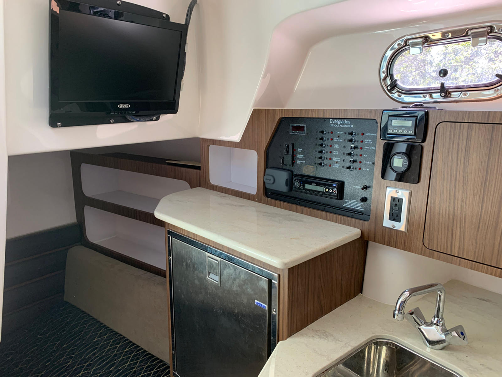 This 2015 Everglades 320EX is powered by Yamaha 350s. Port engine has 128 hours with a new powerhead and 874 hours on starboard engine. Engines have transferable third party warranty good through 2/28/2027. This boat is loaded with all the options you would expect. Ready for an overnight weekend trip or a hardcore fishing trip. The boat was professionally detailed including a buff and wax 2/1/2026.