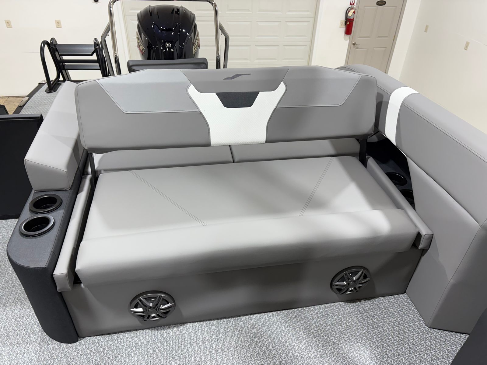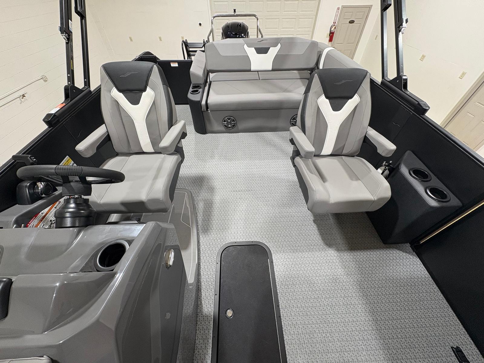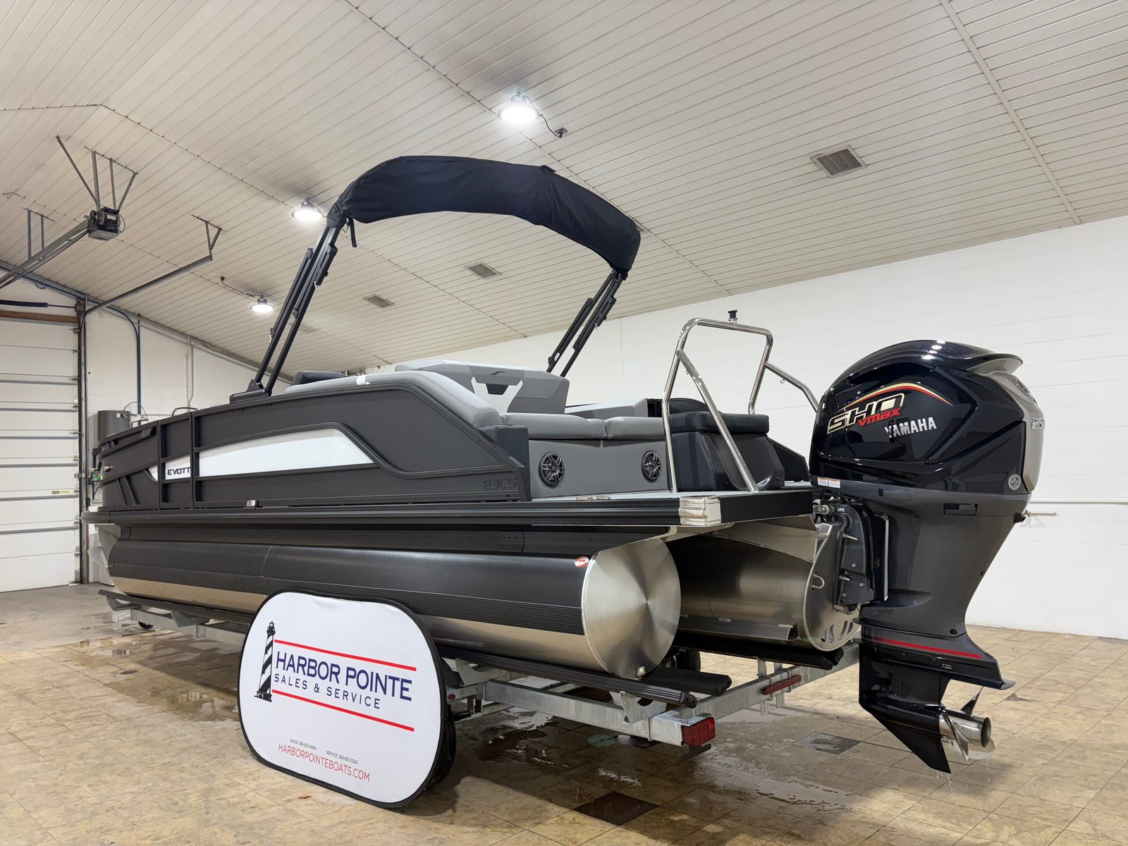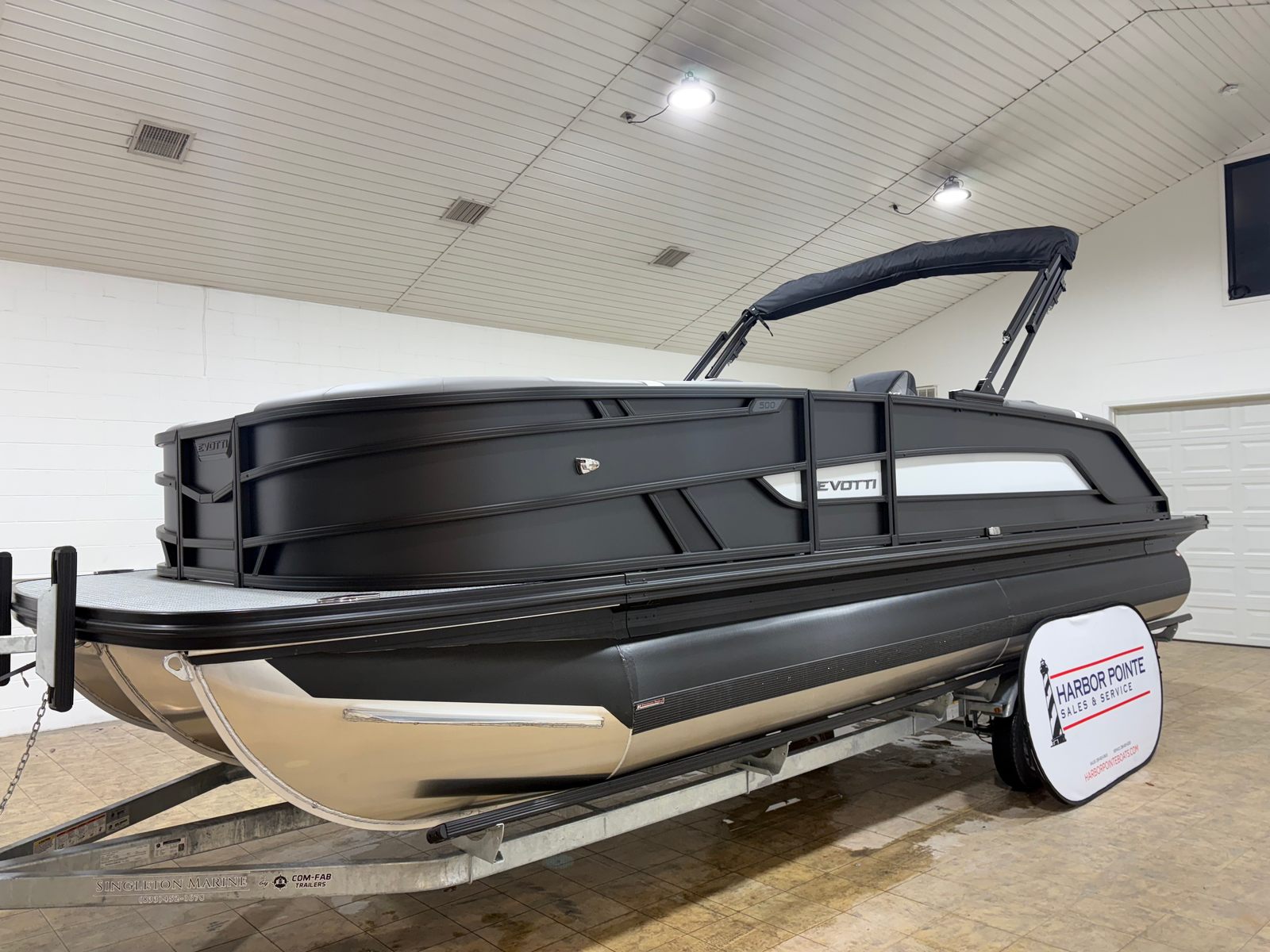 The 2026 Evotti 523 CS Pontoon is a testament to modern craftsmanship and innovation. Measuring an impressive 25.5 feet in length, this pontoon offers ample space for relaxation, entertainment, and adventure. The contemporary design is highlighted by the Panel Diamond Black Satin exterior, accented with a striking Panel Accent Pearl White Gloss, creating a sophisticated and eye-catching profile that stands out at any marina or lakeside gathering. The new condition ensures that every detail, from the flooring to the upholstery, is pristine and ready for immediate enjoyment.