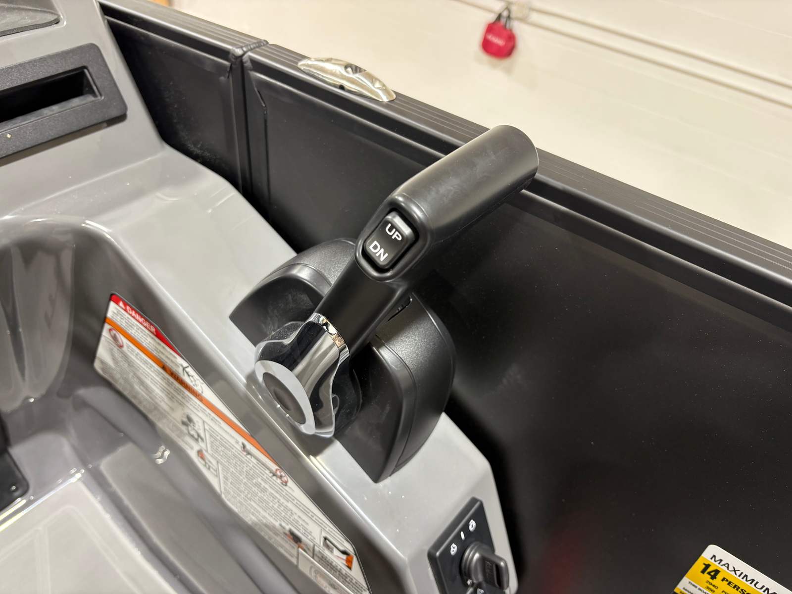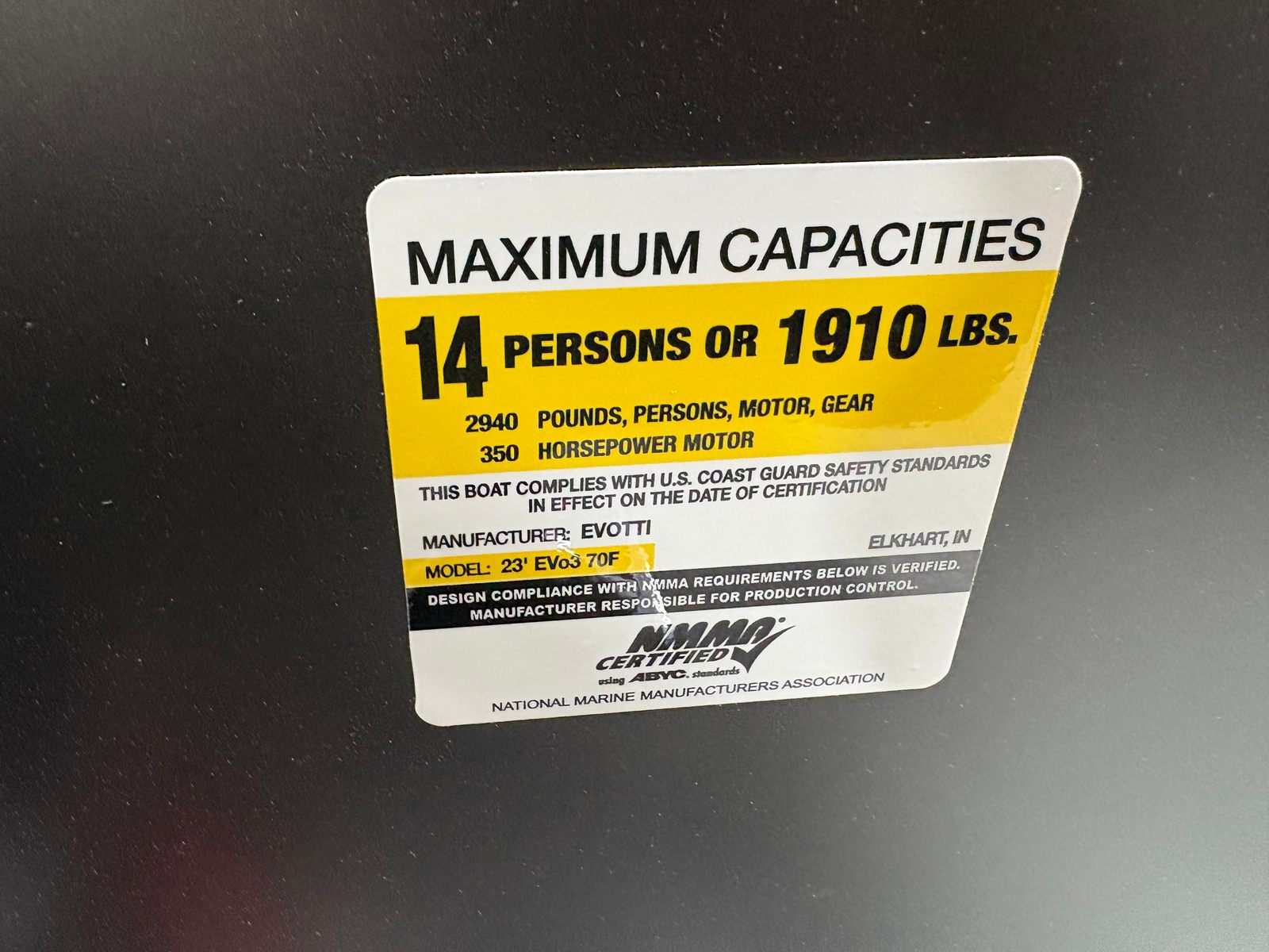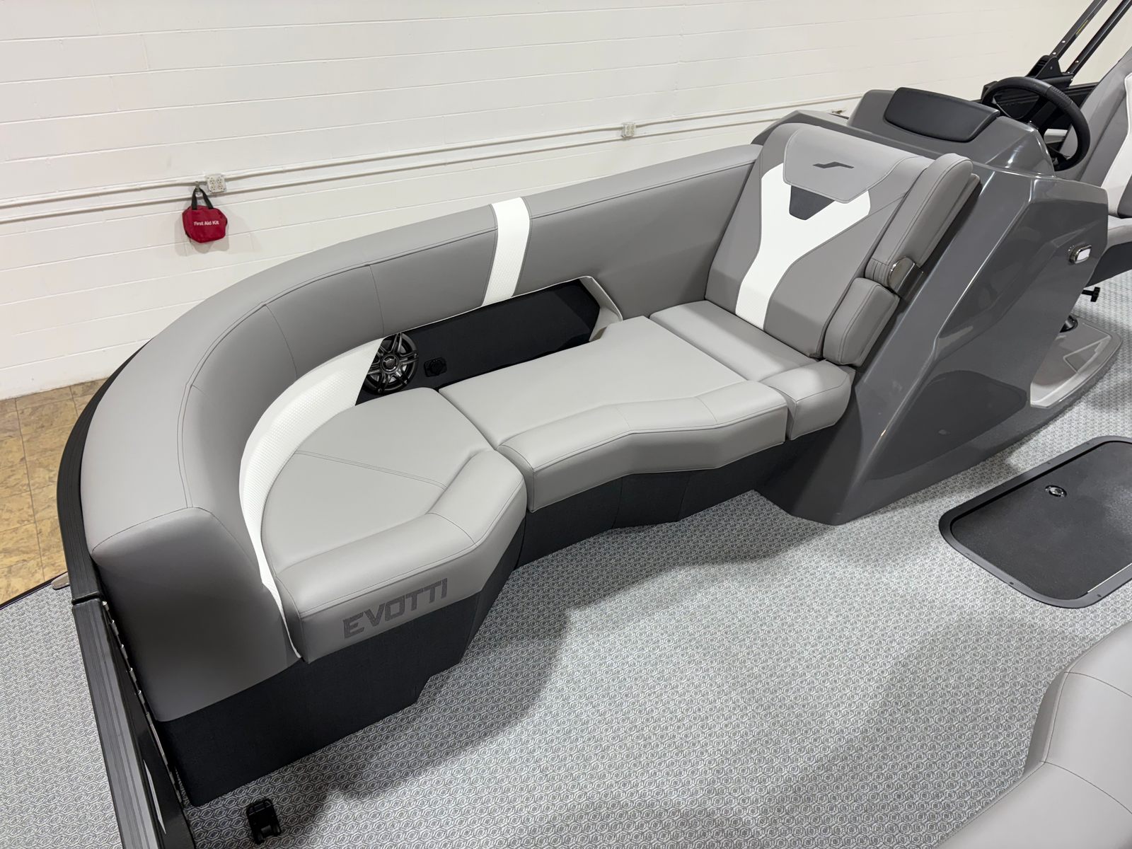 The Evotti 523 CS is thoughtfully equipped with a range of premium features designed to enhance comfort, convenience, and style. The Canvas Black canopy offers shade and protection from the elements, allowing you to enjoy the outdoors in any weather. Inside, the Base Vinyl Steel Gray upholstery provides a modern and inviting atmosphere, perfectly complemented by the Steel Gray Evolution Flooring, which is both durable and easy to maintain. The Battery Dual system ensures reliable power for all your onboard electronics and accessories, giving you peace of mind during extended outings. Every detail, from the color accents to the advanced rigging, reflects Evotti’s commitment to quality and innovation.