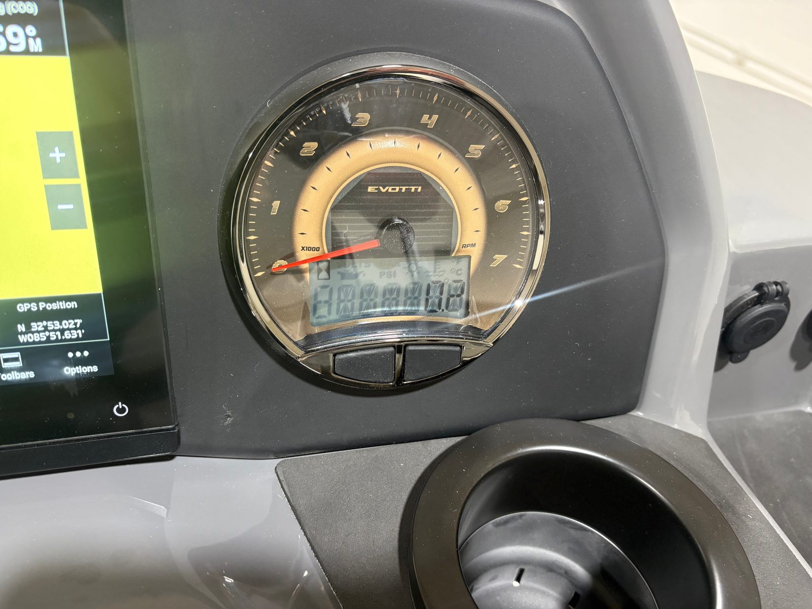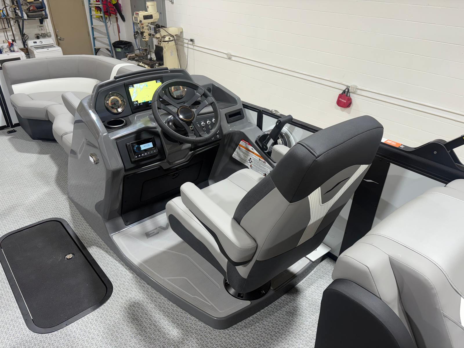 The 2026 Evotti 523 QL is packed with features that enhance both its aesthetic appeal and its functionality. The Base Vinyl Ghost White and Base Vinyl Steel Gray upholstery create a sophisticated and inviting atmosphere, while the Panel Pearl White Gloss and Panel Accent Platinum Blue Satin add a touch of modern elegance. The Steel Gray Evolution Flooring is not only stylish but also durable and easy to maintain, ensuring your pontoon remains pristine trip after trip.For those who appreciate high-quality sound, the Clarion Head Unit & Speakers provide crystal-clear audio, perfect for setting the mood or entertaining guests. Navigating your favorite waterways is a breeze with the Garmin 943 featuring 5" gauges, offering advanced navigation and easy-to-read information at your fingertips. The Canvas Black provides shade and protection from the elements, allowing you to enjoy your time on the water in comfort.