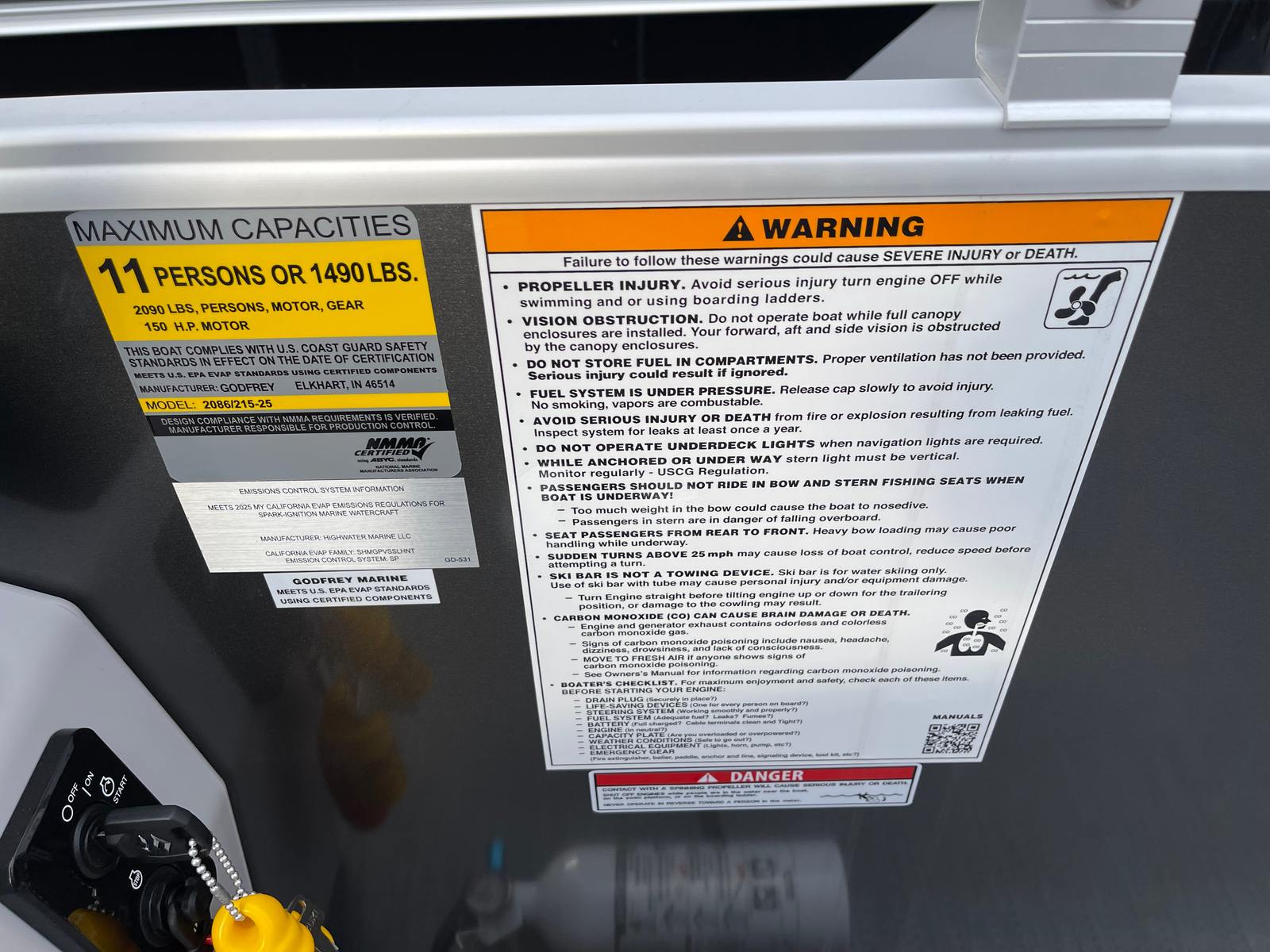 Step aboard the Godfrey EX 2086 CXP and discover a world of premium features designed to enhance your boating experience. The boat’s exterior boasts Graphics - Low Band Silver Matte Pearl, giving it a sophisticated and modern look that turns heads wherever you go. The Rail Frame Color - Anodized Silver and Rail Skin Color - Charcoal add to its sleek aesthetic, while the Rub Rail; Aluminum - Silver provides durability and protection against bumps and scrapes.The flooring is finished in Platinum Weave, offering both style and comfort underfoot. Inside, the Base Vinyl Color - Warm Gray Interior creates a welcoming atmosphere, complemented by the Vinyl Accent Color - Glacier for a touch of elegance. The upgraded captain’s chair is a standout feature, equipped with swivel, slider, reclining, and fold-down arms on a 10" fixed pedestal, ensuring maximum comfort and versatility for the captain.For easy access to the water, the Silver EZ Climb Stern Ladder is a practical addition, making swimming and boarding effortless for everyone on board. Every detail of the Godfrey EX 2086 CXP has been thoughtfully designed to provide a luxurious and enjoyable boating experience.