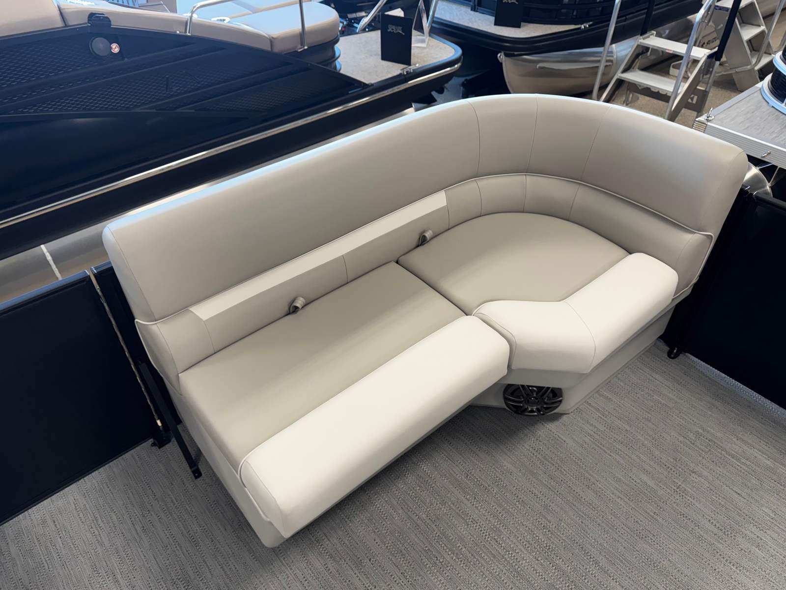 The Godfrey EX 2086 SBX is designed with real-world boating in mind. The extended deck and thoughtful layout make storage of coolers, water toys, and fishing gear a breeze. The sturdy 25-inch transom and anodized black rail frame provide peace of mind, knowing your pontoon is built to last. The additional battery extension means you can power your electronics, lights, and accessories without worry, even on longer trips.Docking is simplified with the LED docking lights, providing clear visibility in low-light conditions. The Black EZ Climb Stern Ladder ensures that swimmers and guests of all ages can easily get back on board after a refreshing dip. The snapless playpen cover offers quick and easy protection for your boat, keeping it clean and ready for your next adventure.