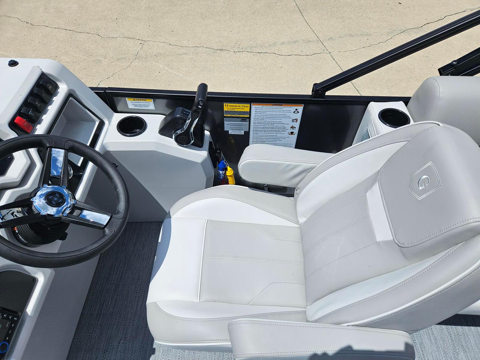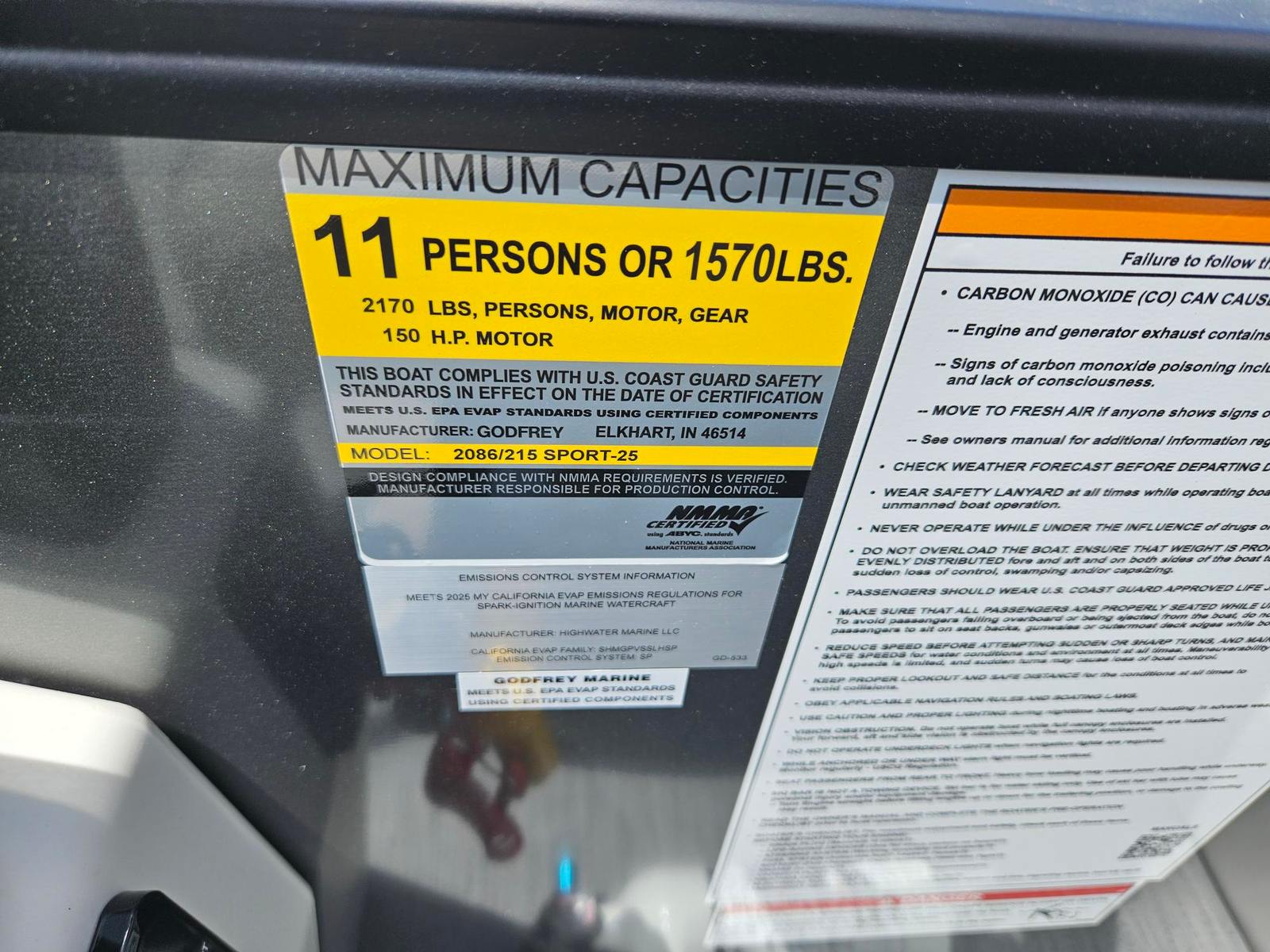 The 2025 Godfrey EX 2086 SBX is loaded with features designed to maximize comfort, convenience, and enjoyment. The Xperience Extended Deck provides additional space for lounging, entertaining, or simply soaking up the sun. The under deck skin with inside skirting not only enhances the pontoon’s appearance but also contributes to a smoother, quieter ride by reducing water resistance and minimizing spray.For those who value easy access to the water, the Silver EZ Climb Stern Ladder is a game-changer, making it simple for everyone to board after a swim or water sports session. The snapless black playpen cover offers quick and secure protection for your seating area, ensuring your pontoon stays clean and ready for your next adventure.When it comes to visibility and safety, the LED docking lights provide brilliant illumination for evening arrivals and departures, while the aluminum silver rub rail adds both style and protection to the boat’s exterior. Every detail, from the anodized black rail frame to the charcoal rail skin, is thoughtfully designed to create a modern, cohesive look that stands out in any setting.