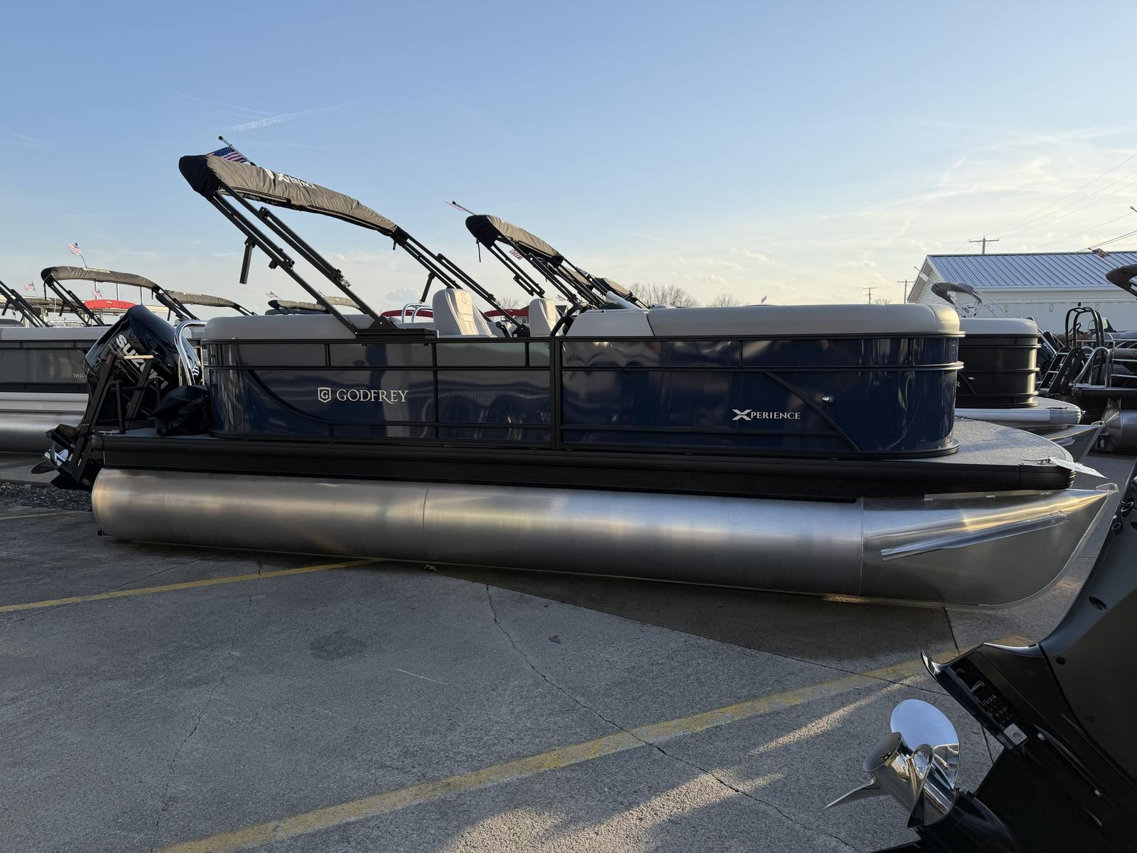 The 2026 Godfrey EX 2086 SBX stands out in the world of pontoon boats with its sleek lines and contemporary features. Measuring just over 21 feet in length, this pontoon offers ample space for relaxation and recreation while maintaining a manageable size for easy handling and storage. The striking navy rail skin color, complemented by an anodized black rail frame, gives the boat a sophisticated and sporty appearance that will turn heads at any marina or lakeside dock. As a new model, it promises the latest in design innovation and reliability, making it a top contender for anyone looking for a Godfrey boat for sale.