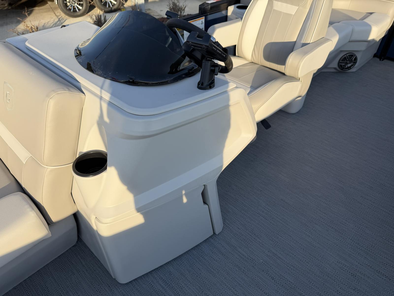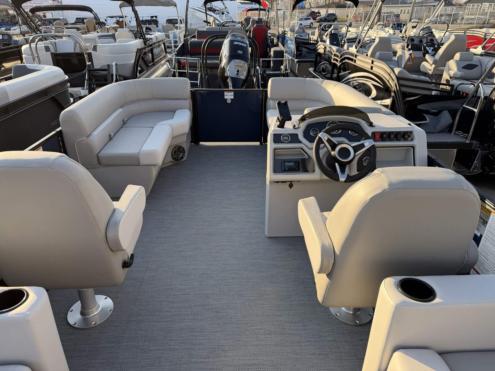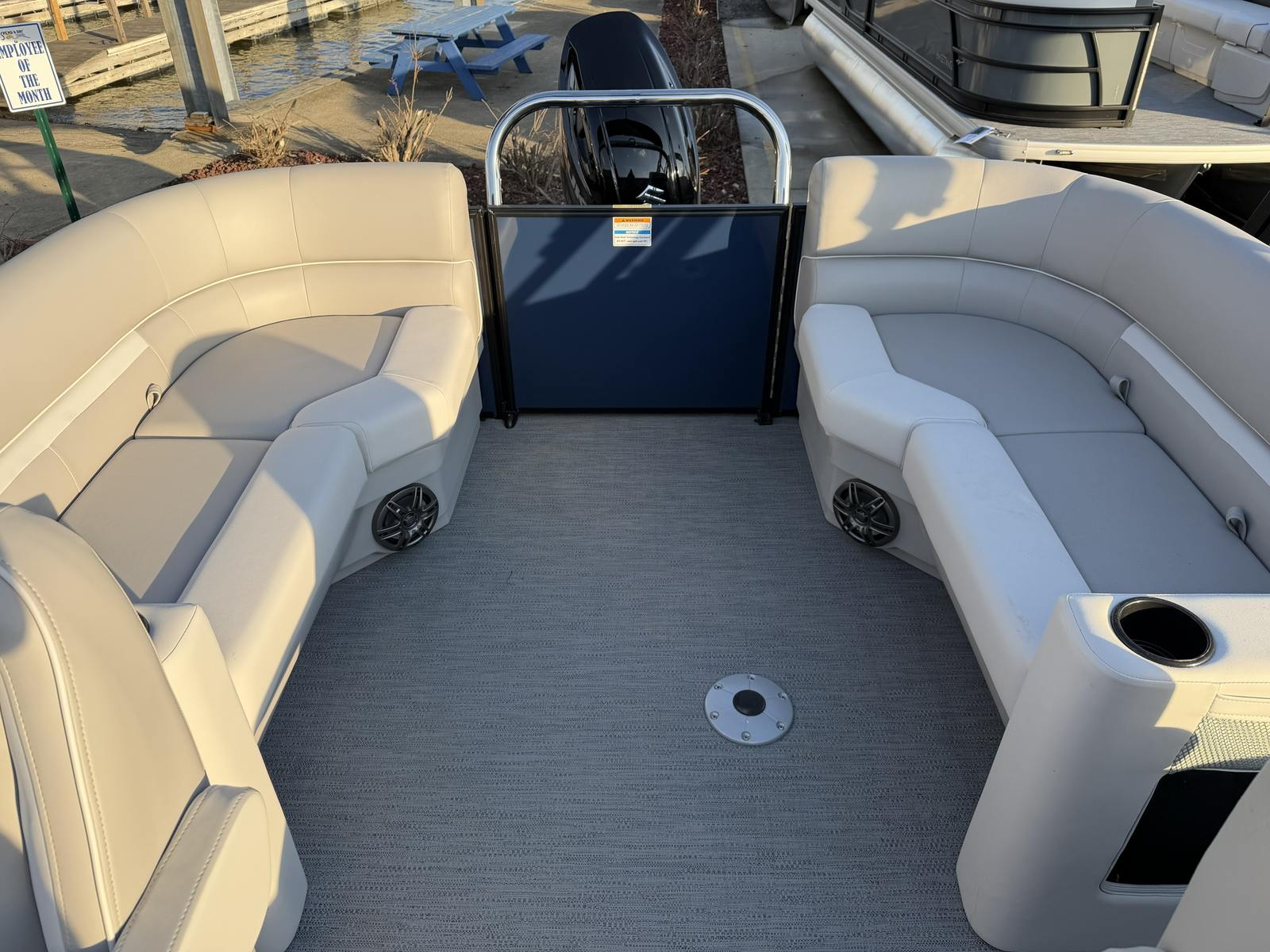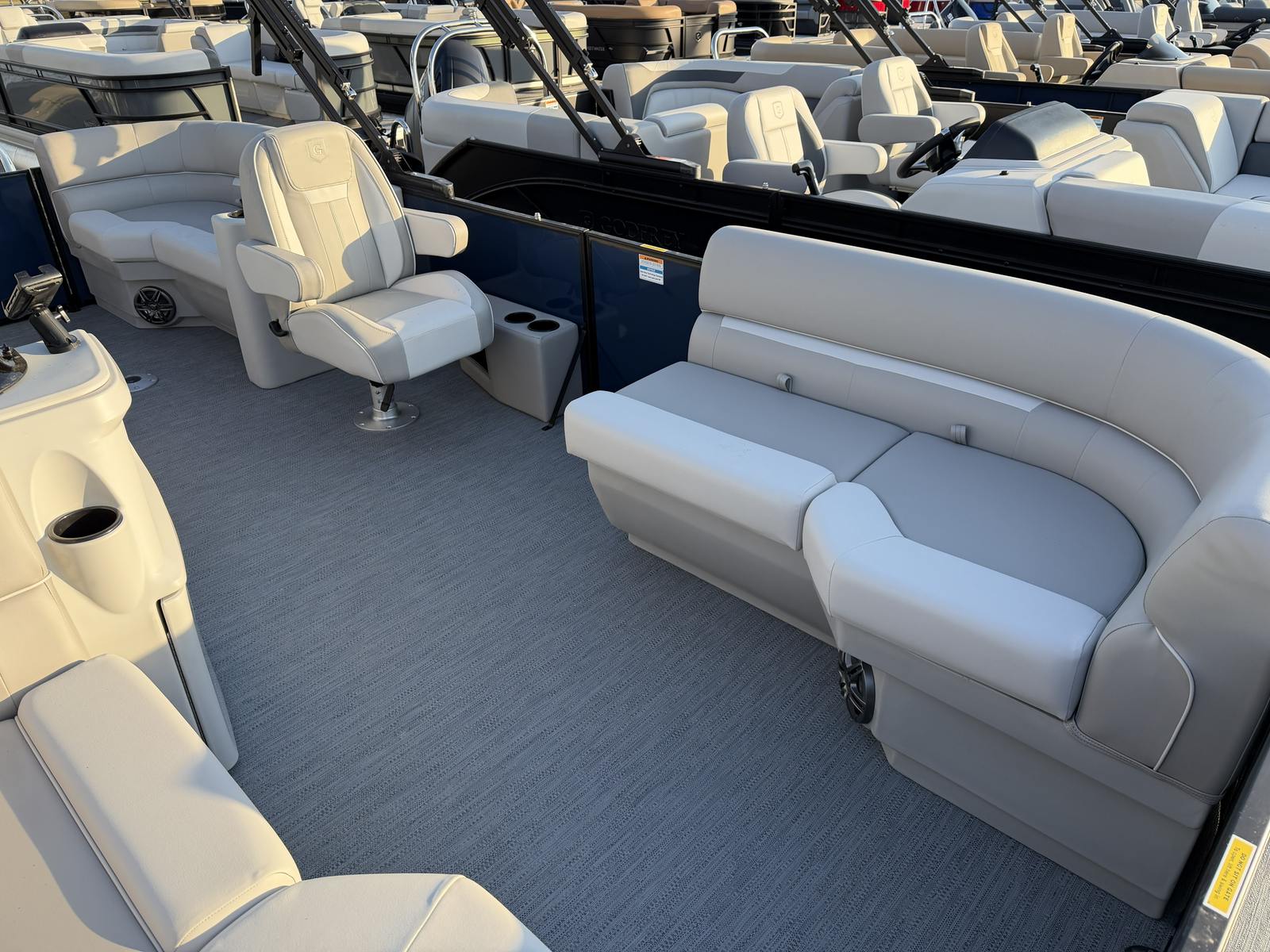 The Godfrey EX 2086 SBX is loaded with features designed to maximize your enjoyment and convenience on the water. The black canopy, equipped with a protective boot and dome light, offers essential shade and shelter, allowing you to relax comfortably even during the sunniest days. The snapless playpen cover in black not only protects your pontoon’s interior but also adds a sleek, streamlined look when the boat is not in use.Boarding and disembarking are made effortless with the Black EZ Climb Stern ladder, ensuring safe and easy access for all passengers. LED docking lights provide enhanced visibility during evening arrivals or departures, adding both safety and style to your boating experience. The black rub rail with a black vinyl insert and black skirting offers additional protection and a cohesive, modern aesthetic.For those who love water sports, the ski tow cage is a standout feature, making it simple to attach tow ropes for skiing, tubing, or wakeboarding. Every detail, from the anodized black rail frame to the navy rail skin color, has been thoughtfully chosen to create a pontoon that is as visually appealing as it is functional.