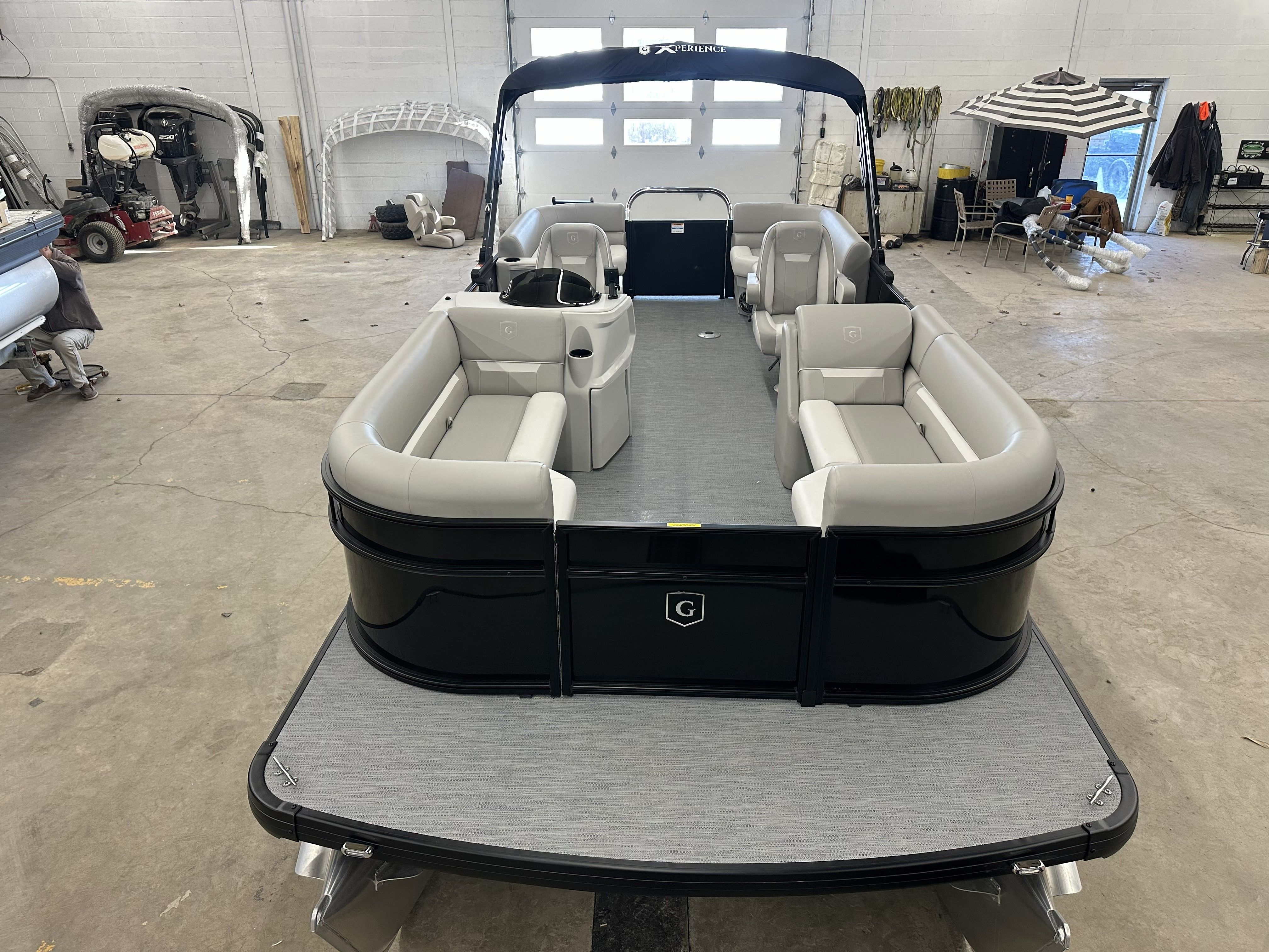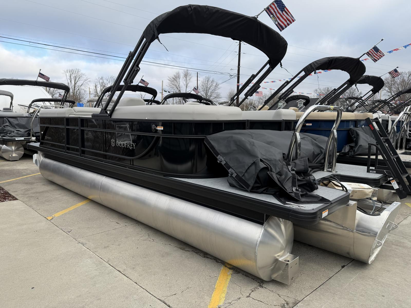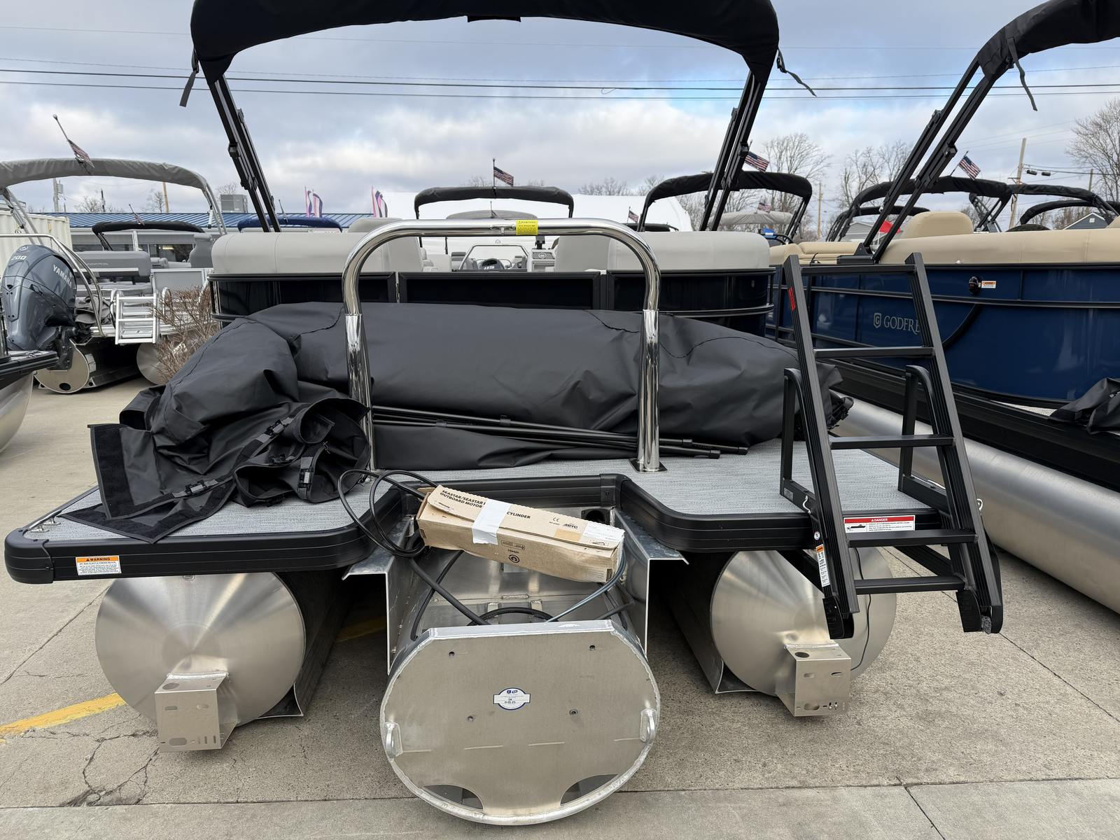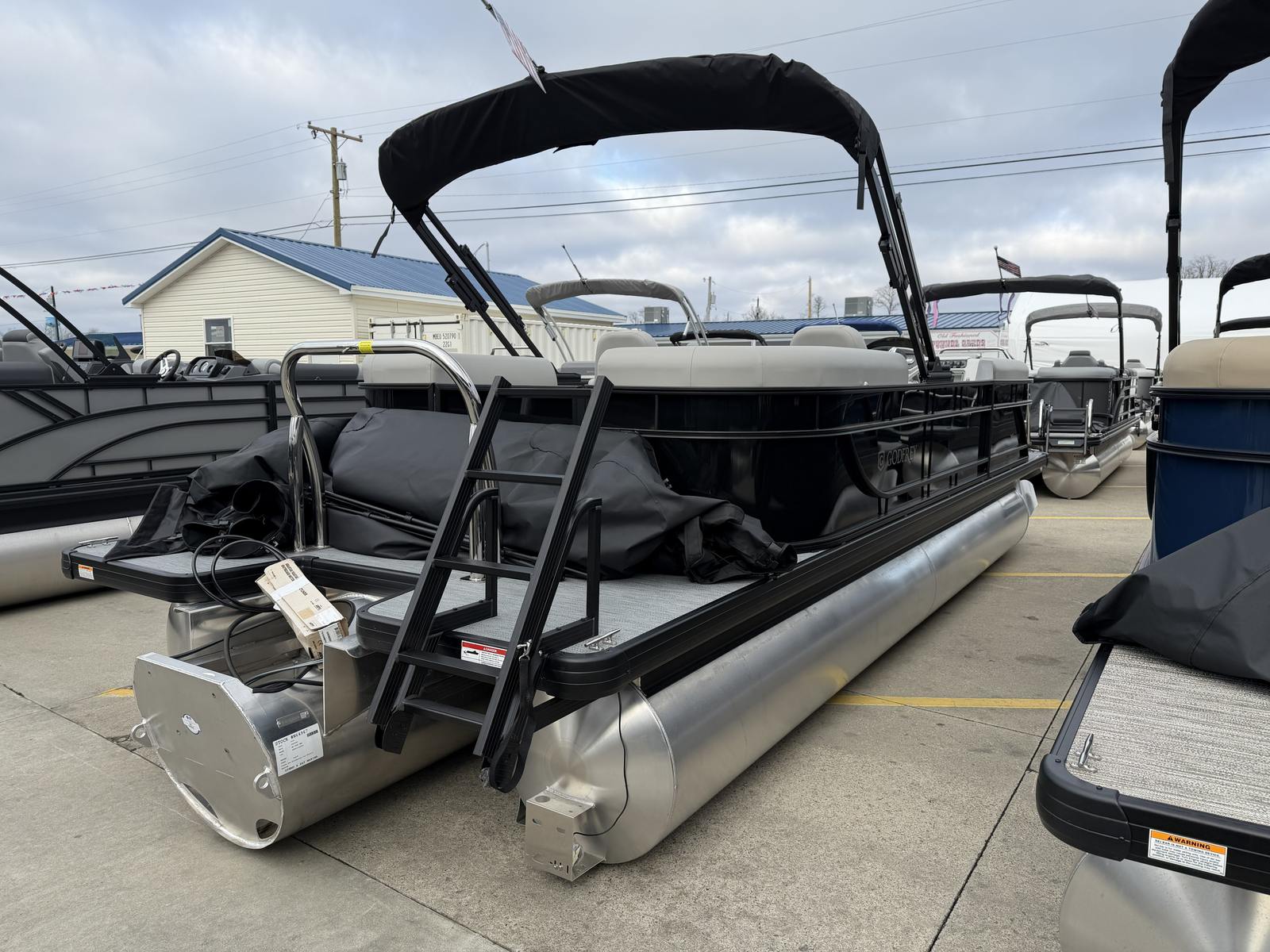 The Godfrey EX 2286 SBX is loaded with features designed to elevate your boating experience. The black canopy with a protective boot and dome light provides shade and shelter, ensuring comfort during sunny days or unexpected weather. The snapless playpen cover in black offers quick and easy protection for your pontoon, keeping it in pristine condition when not in use.The Xperience Extended Deck layout maximizes usable space, perfect for hosting gatherings or stretching out in the sun. The additional battery extension ensures you have the power needed for longer adventures, while the Black EZ Climb Stern ladder makes boarding and disembarking effortless for all ages. LED docking lights illuminate your way during evening returns, adding both safety and a touch of elegance.Aesthetically, the anodized black rail frame and black rail skin create a striking, modern look that turns heads at every marina. The black rub rail with vinyl insert and black skirting not only enhances the boat’s appearance but also provides added protection against bumps and scrapes.