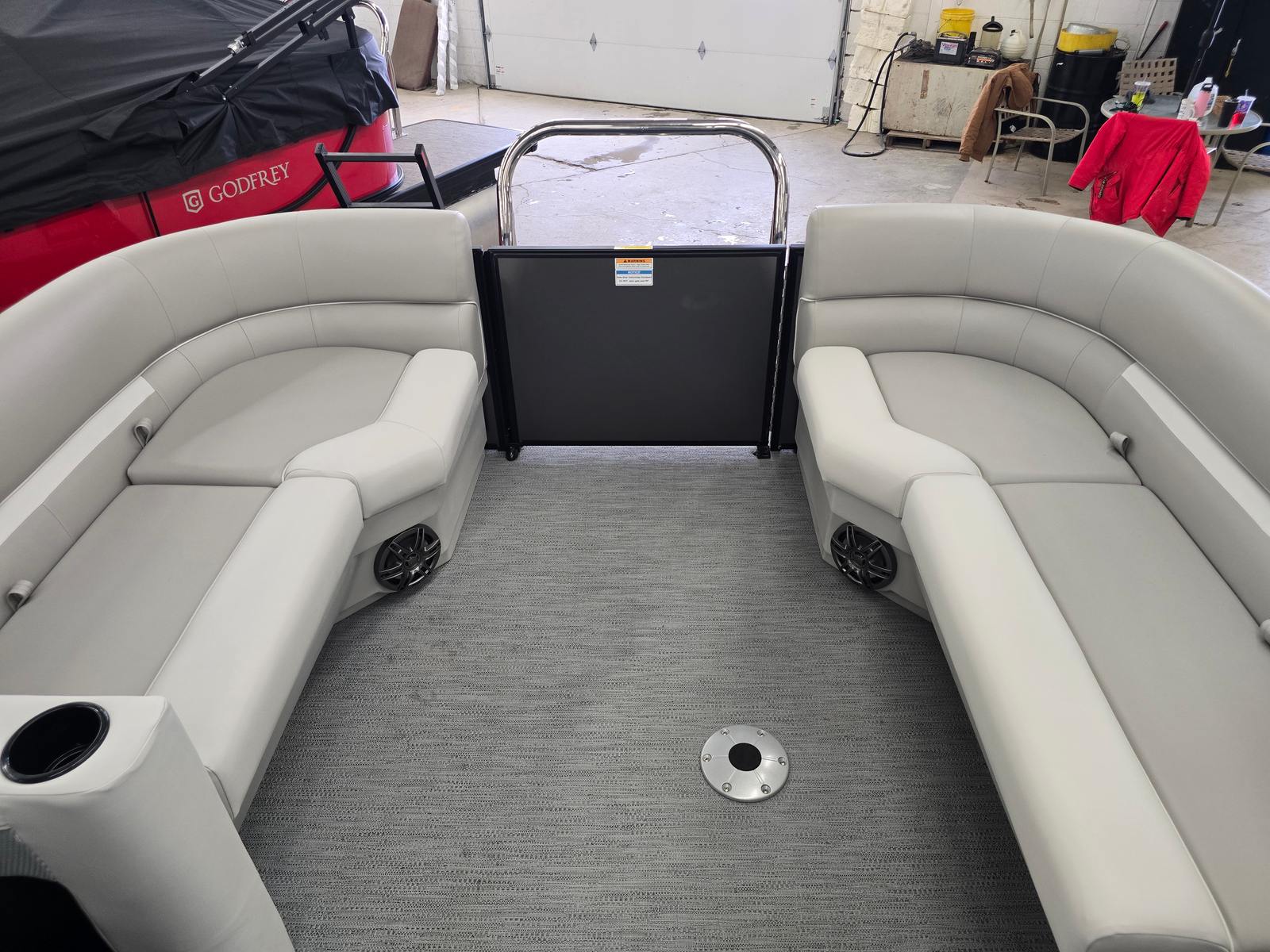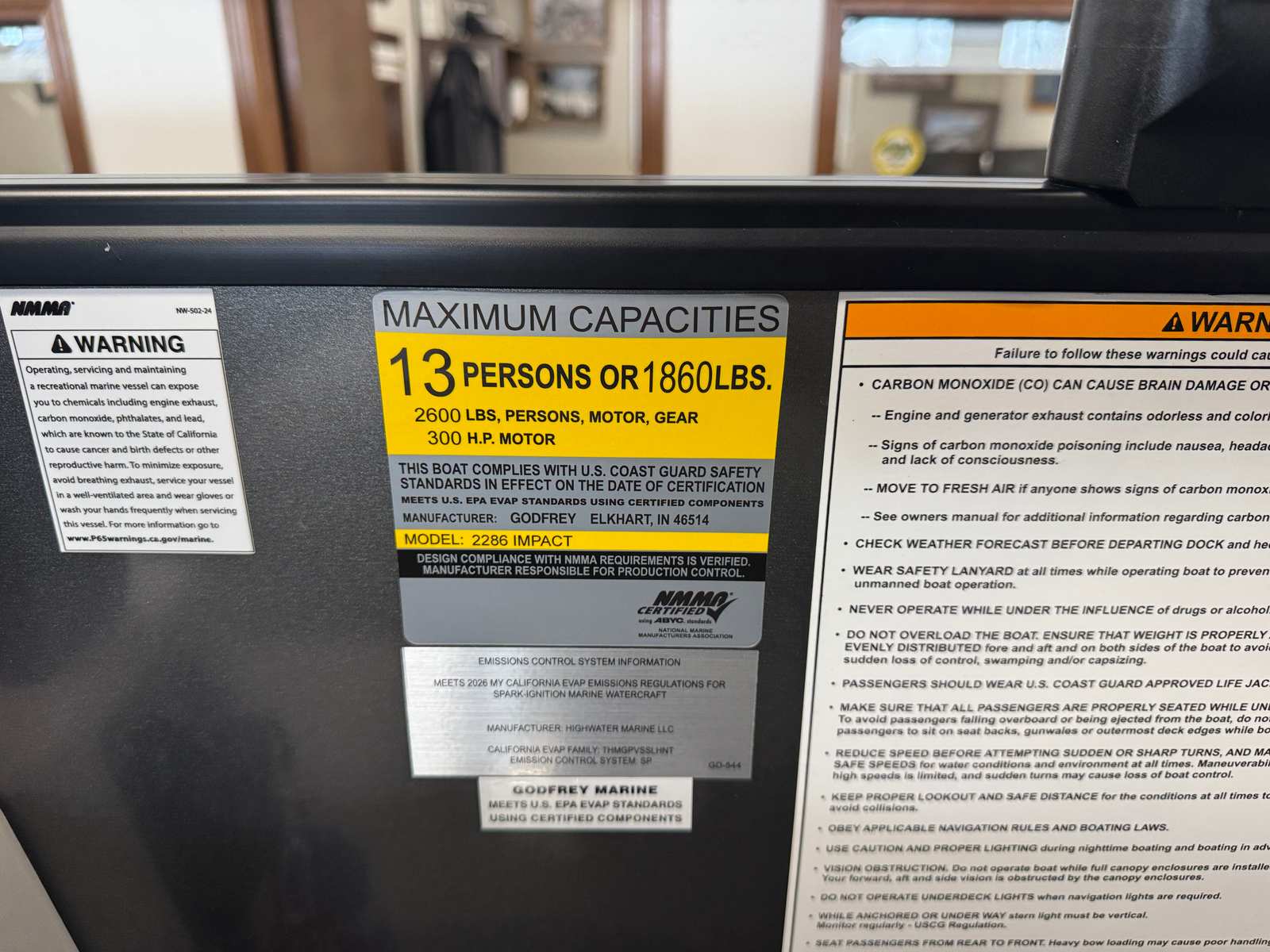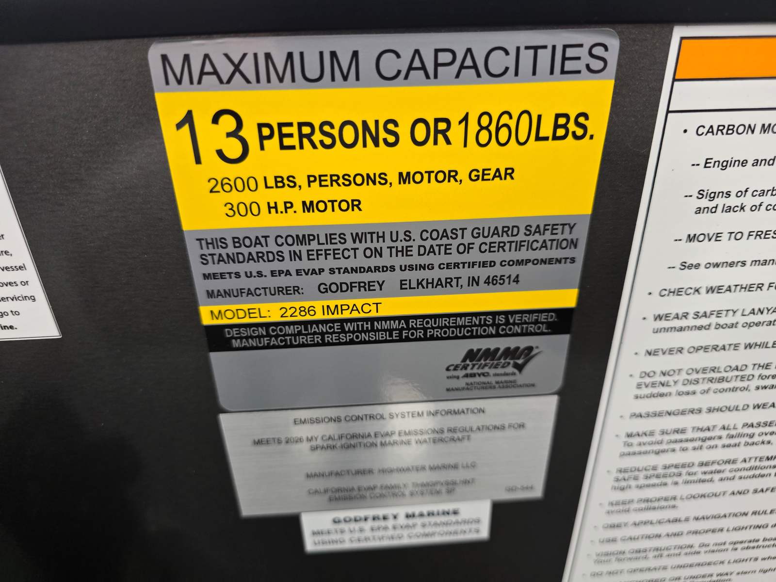 The Godfrey EX 2286 SBX is loaded with special features that elevate your boating experience. The power canopy, finished in sleek black and equipped with a protective boot and dome light, offers convenient shade and shelter at the touch of a button, ensuring comfort during sunny afternoons or unexpected showers. The snapless playpen cover in matching black provides quick and secure protection for your boat when not in use, keeping your investment safe from the elements.The Xperience Extended Deck, complete with an additional battery extension, expands your usable space and enhances onboard functionality, making it easier to accommodate guests and gear. The Black EZ Climb Stern ladder ensures easy and safe access to and from the water, perfect for swimmers and water sports enthusiasts. LED docking lights not only add a touch of modern style but also improve visibility and safety during evening arrivals and departures.Aesthetically, the anodized black rail frame, charcoal rail skin color, and black rub rail with black vinyl insert and black skirting create a cohesive and striking appearance that is sure to turn heads at the marina. Every detail is thoughtfully designed to provide both visual appeal and practical benefits.