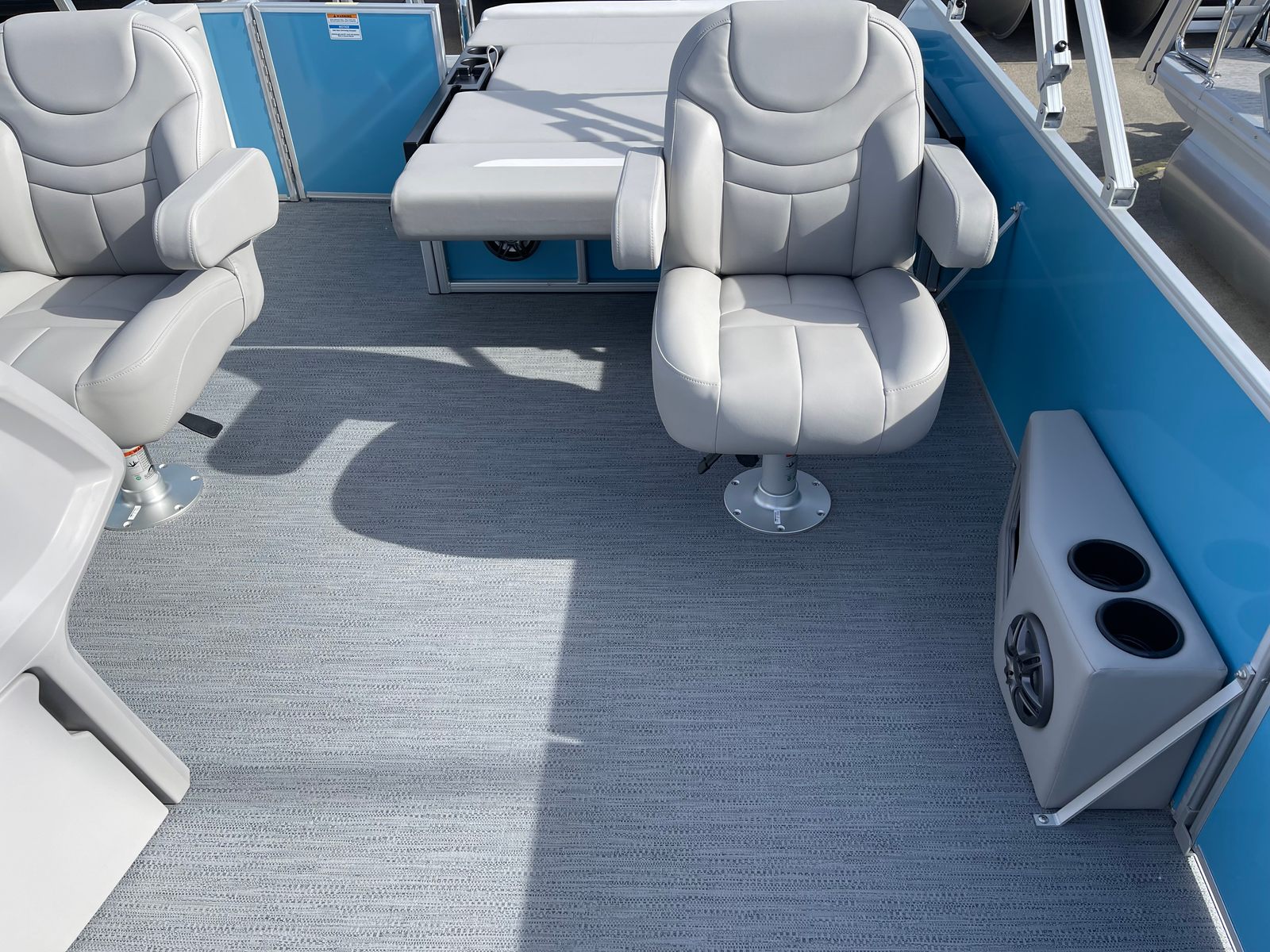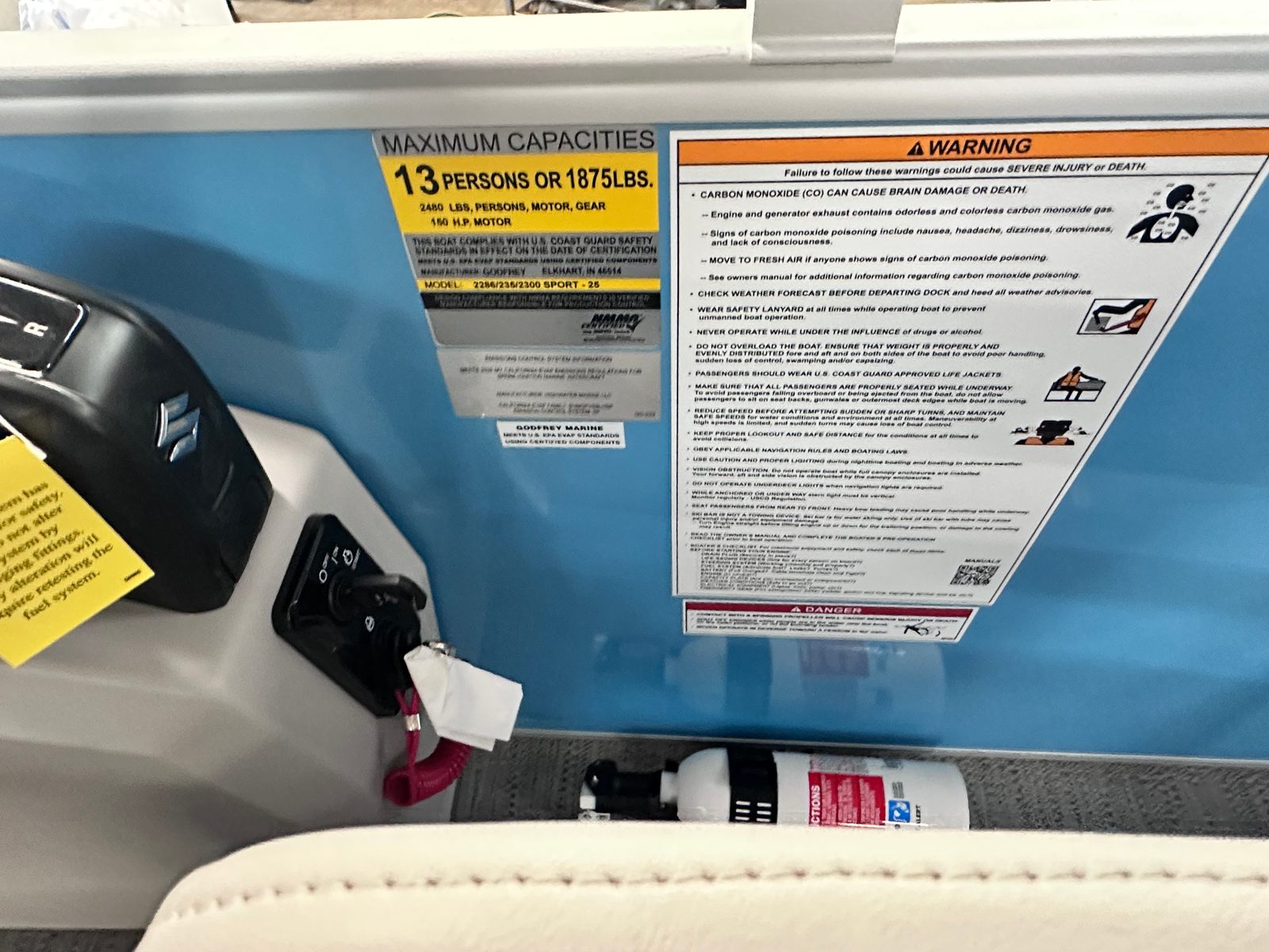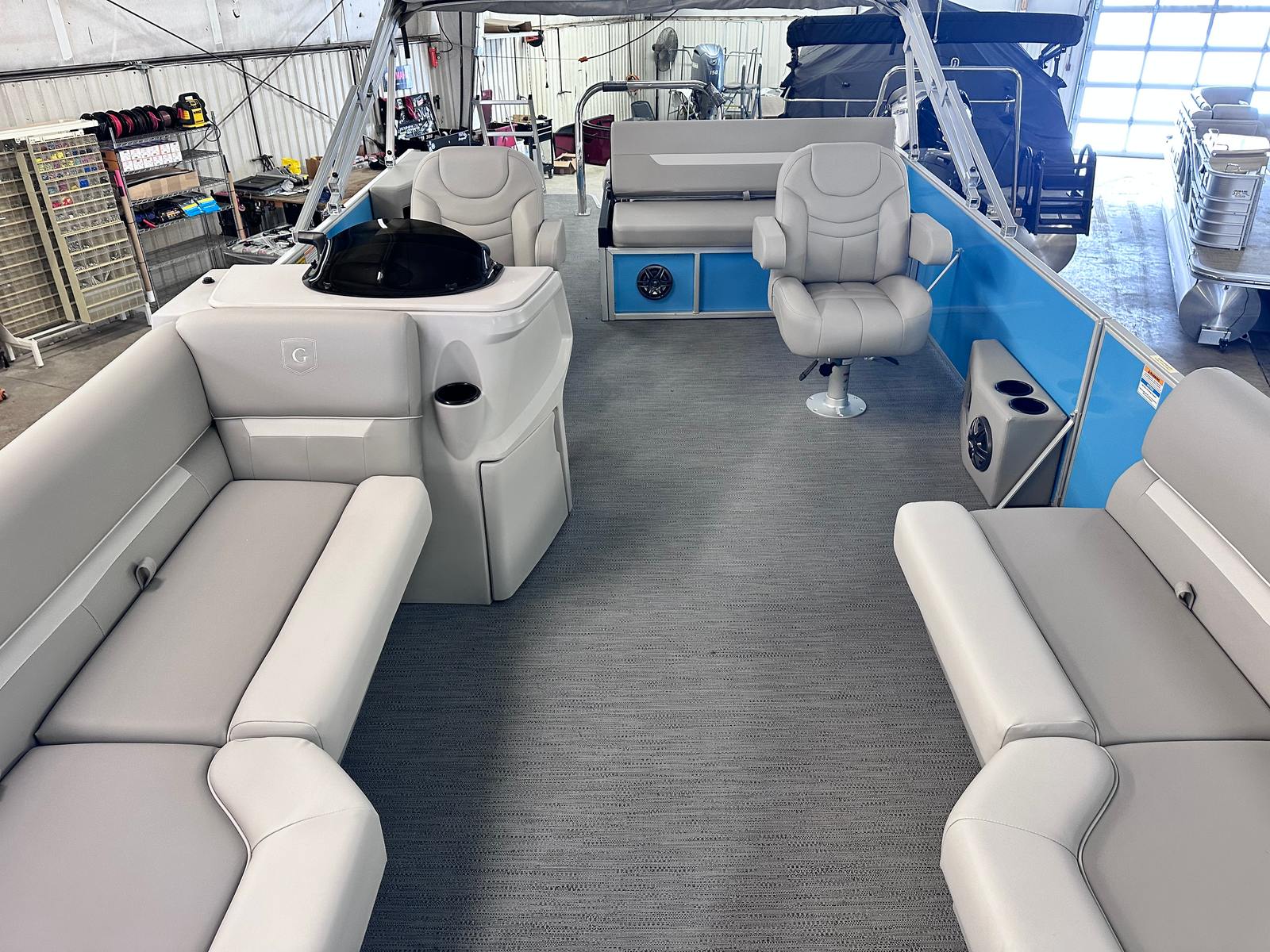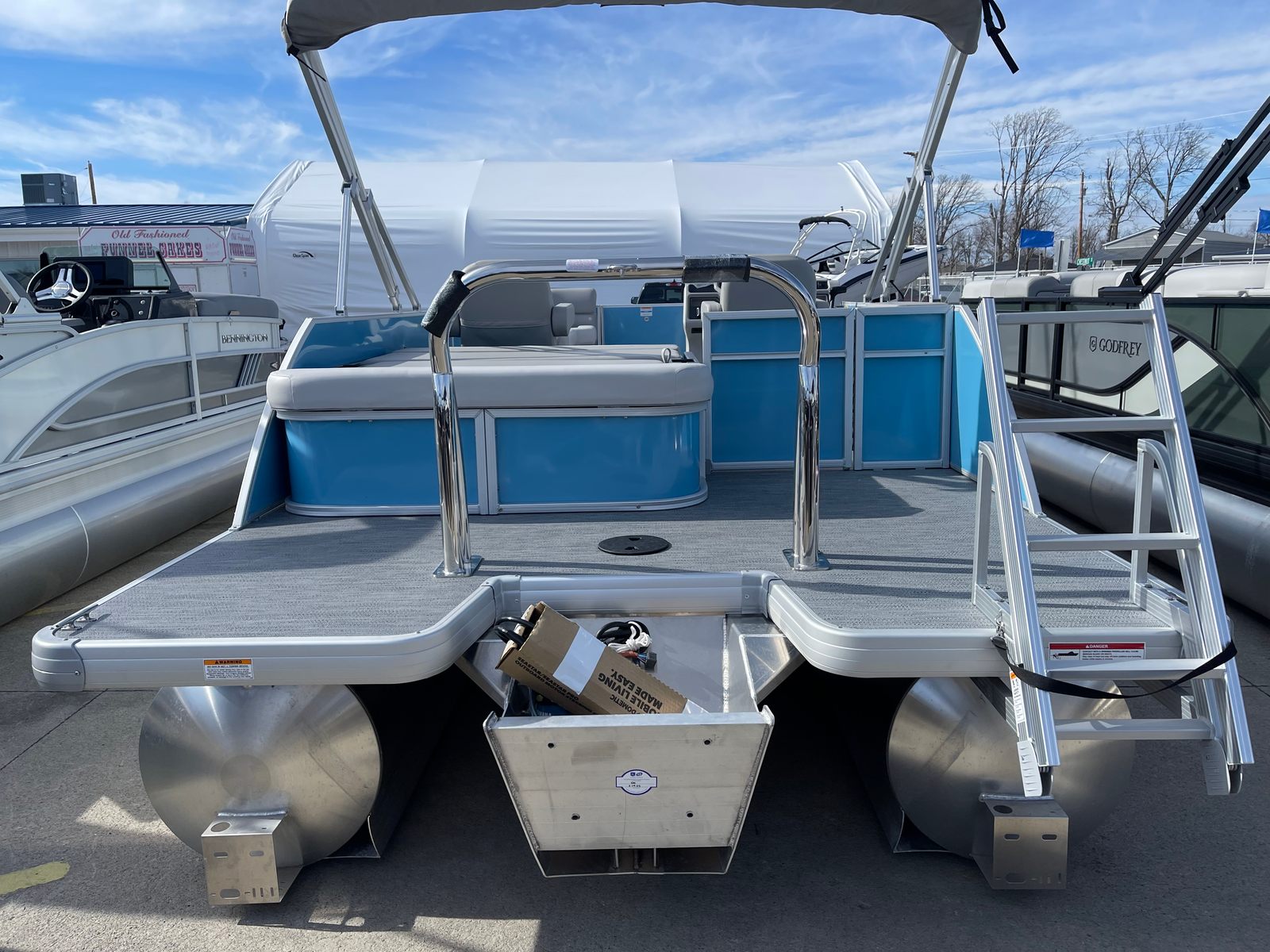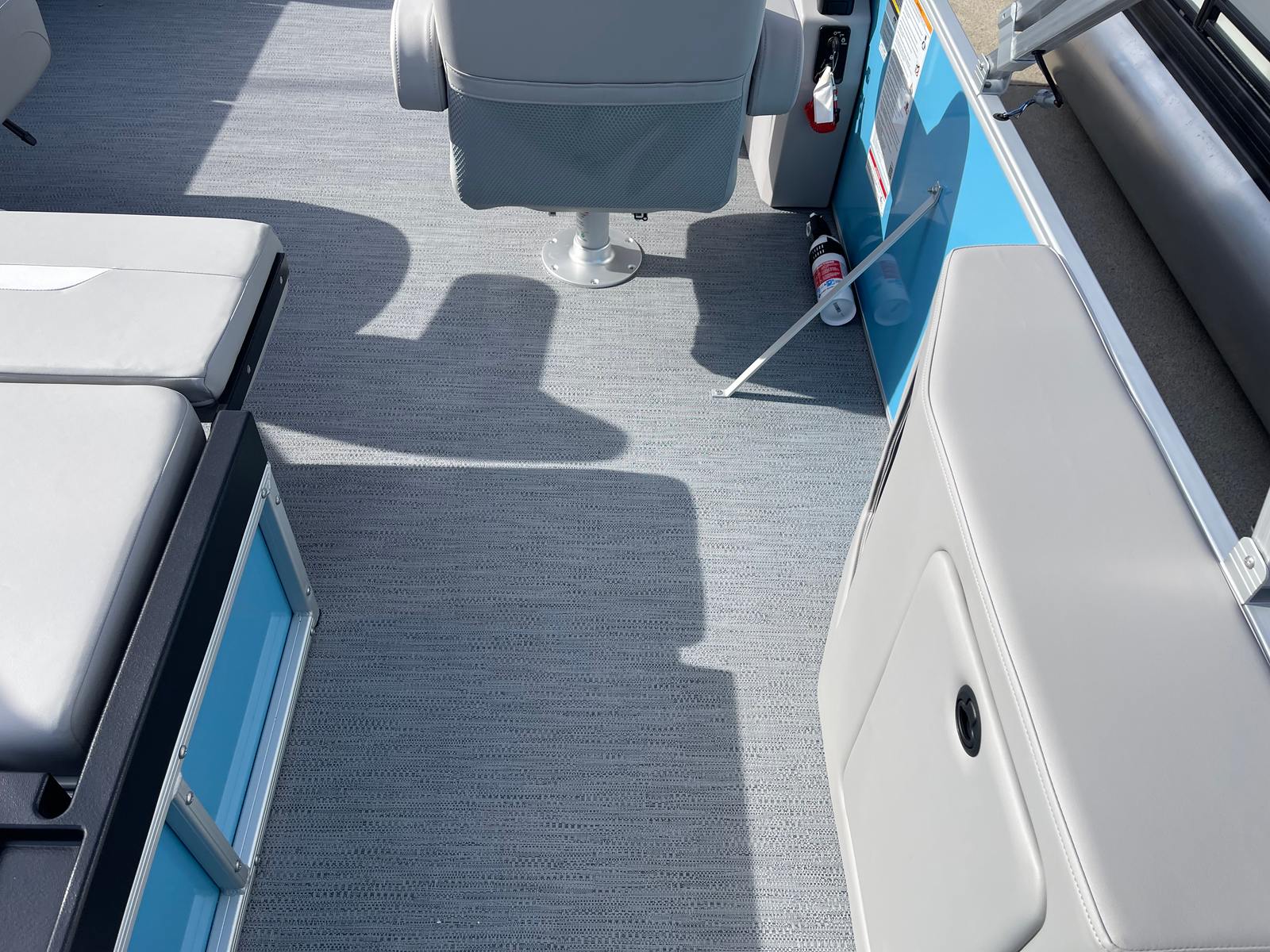 This Godfrey pontoon boat is loaded with special features designed to enhance your time on the water. The under deck skin with inside skirting not only adds to the boat’s sleek appearance but also improves durability and reduces drag for a smoother ride. The Xperience Extended Deck provides additional space for lounging, entertaining, or fishing, making it easy to accommodate family and friends. The snapless gray playpen cover offers quick and convenient protection from the elements, while the silver EZ Climb stern ladder ensures safe and easy access to and from the water.LED docking lights illuminate your path during evening outings, adding both safety and style to your boating experience. The anodized silver rail frame and Lagoon Smooth rail skin color create a modern, sophisticated look that sets this pontoon apart from the crowd. For added peace of mind, a fire extinguisher is included, ensuring you are prepared for any situation.