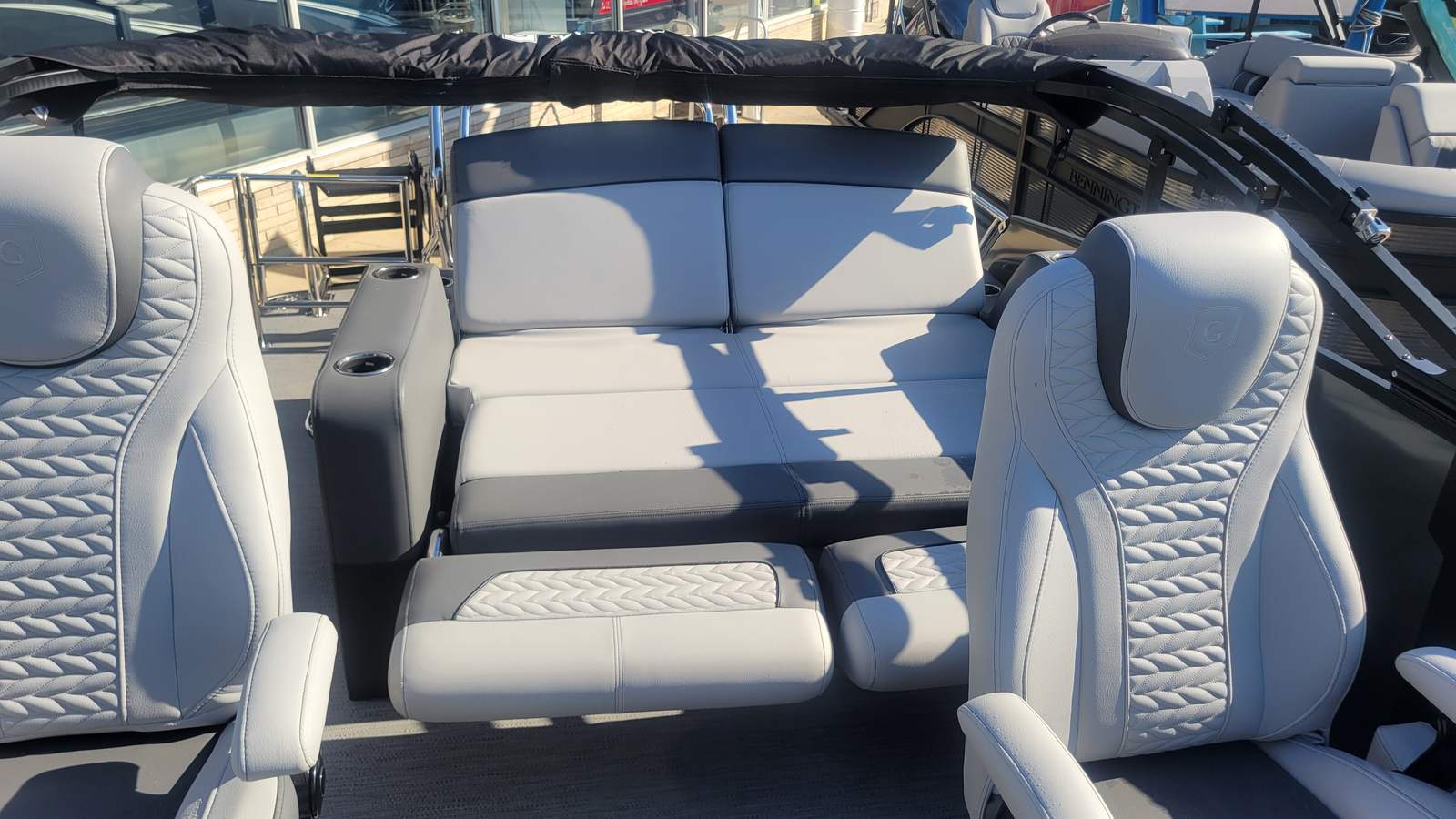 The Godfrey MC 235 DFL is packed with special features that enhance both functionality and enjoyment. The additional rectangle table with bases creates a perfect setting for meals, games, or socializing, while the dual battery switch with trays ensures reliable power management for extended outings. Storage is a breeze thanks to the in-floor charcoal storage mat and dedicated in-floor storage compartments, keeping your gear organized and accessible. The transom is designed with a 25-inch platform for added stability and convenience.A standout feature is the ScanStrut ATMOS Integrated Air Station, offering advanced air management for inflatables and water toys. The corner castings are crafted from bright polished stainless steel and feature LED lights with integrated pull-up cleats, exclusive to the extended deck. The carbon fiber top stripe graphics add a sleek, modern touch to the boat’s exterior, while the Lillipad ladder provides easy access for swimming and boarding.