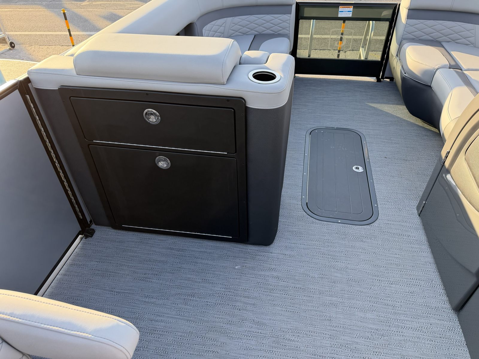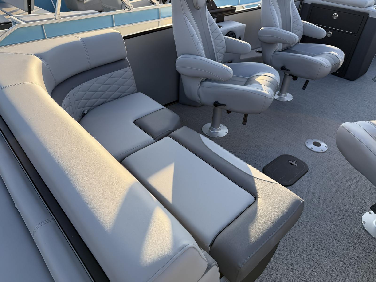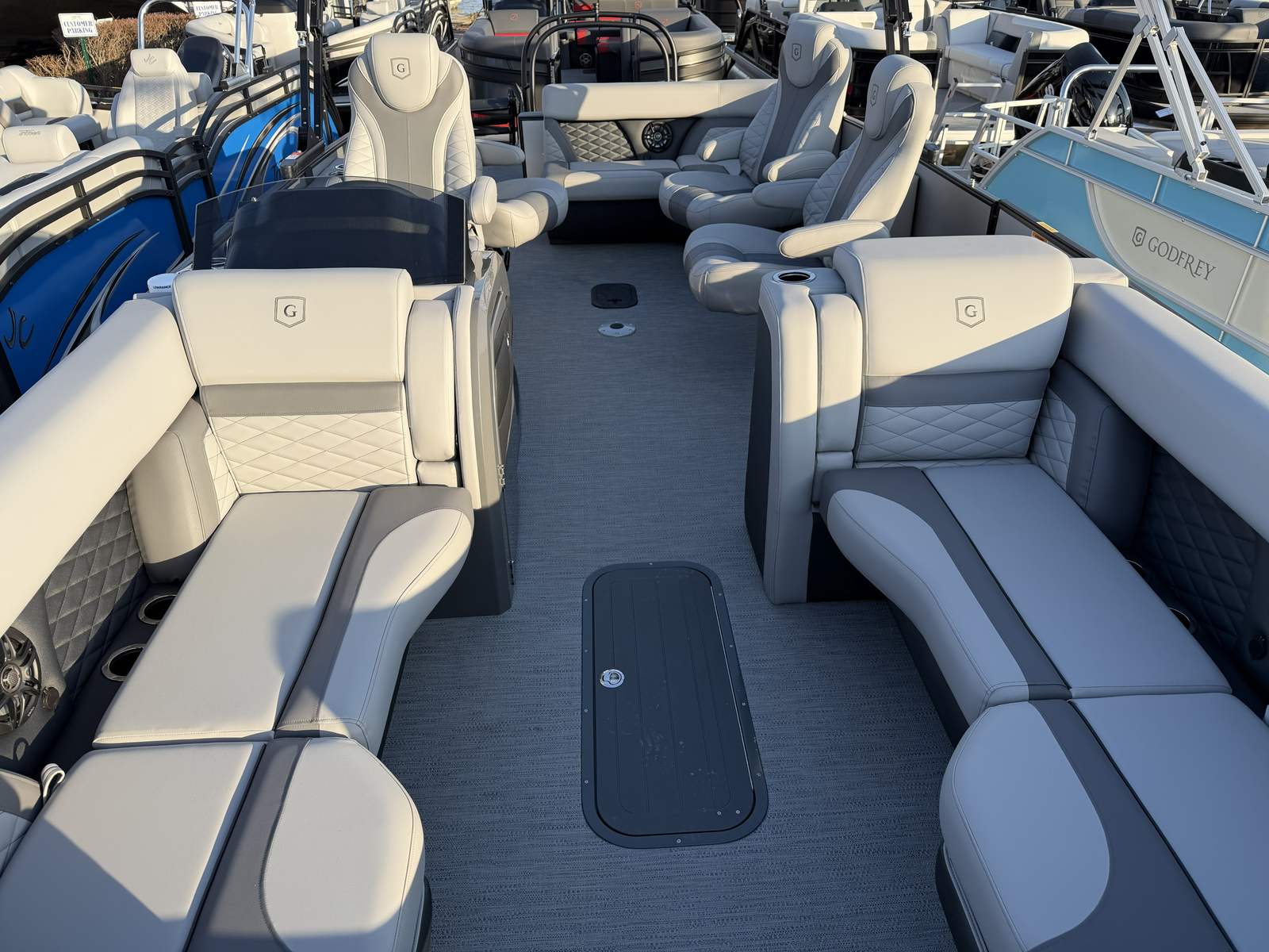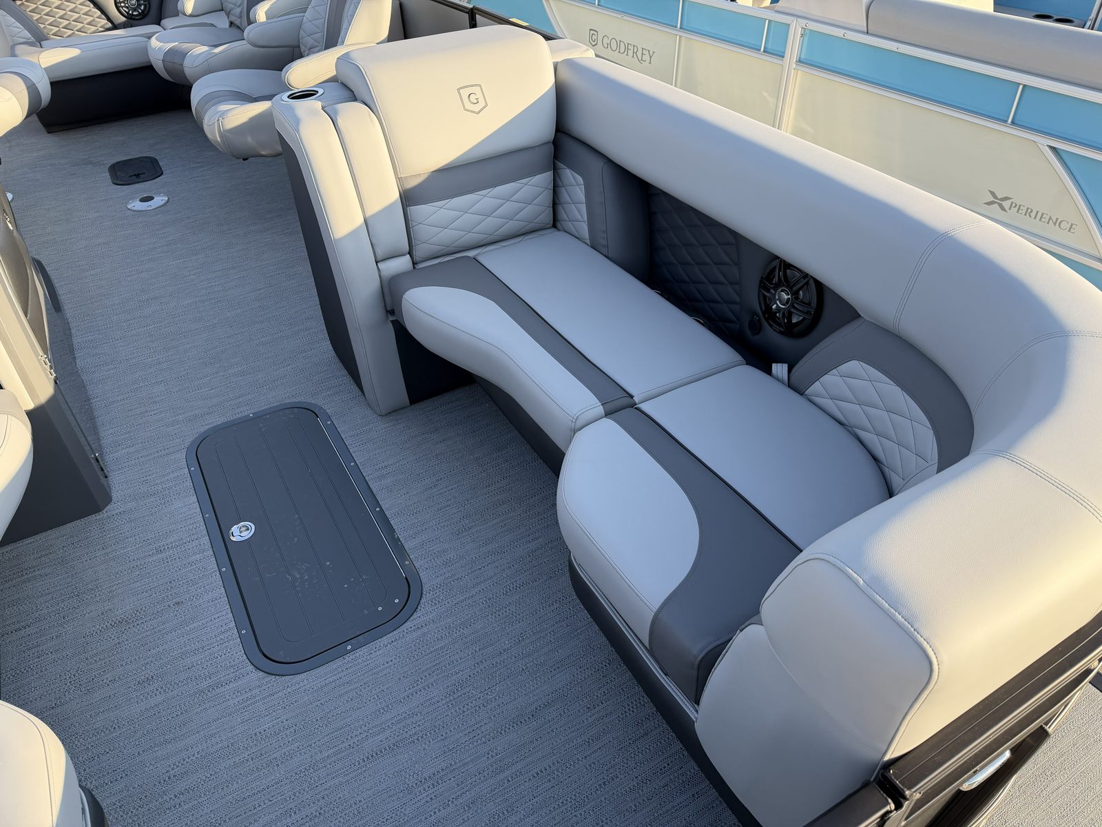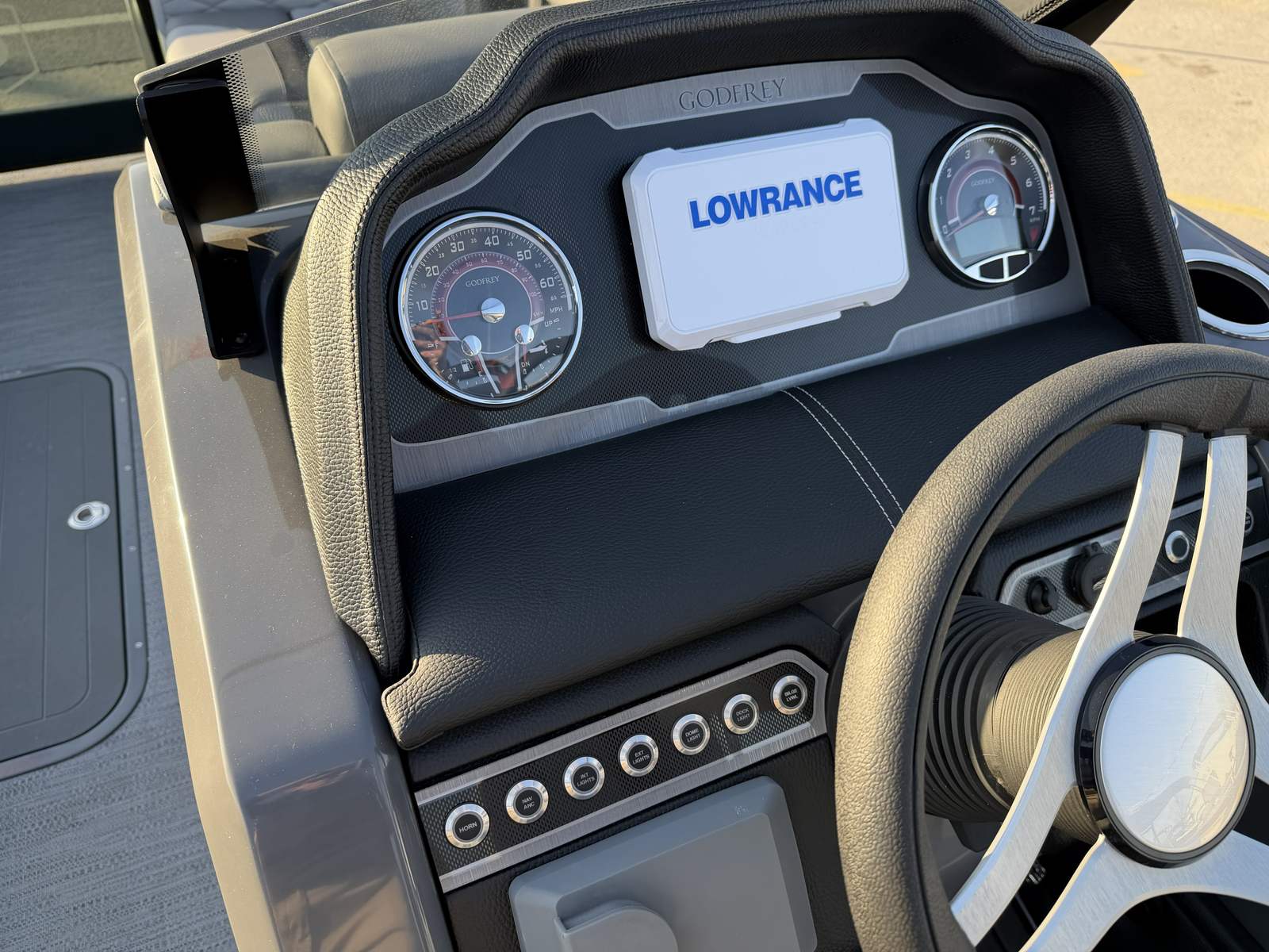 The Godfrey MC 235 QSB is loaded with special features designed to enhance your time on the water. The Silver Matte Smooth rail skin gives the boat a modern, eye-catching appearance, while the Granite Soft Touch base vinyl provides a luxurious and comfortable seating experience. Coordinating accents and wrapped seat boxes add a touch of elegance and durability to the interior, ensuring that every passenger enjoys both style and comfort.For those who value convenience and organization, the MC 235 QSB includes an anchor bracket mounted inside the in-floor storage, allowing for safe and easily accessible storage of your box anchor. The dual battery switch with trays ensures reliable power management, so you can enjoy longer outings without worry. The helm features a lockable glovebox for secure storage, while the tip-out design adds an extra layer of practicality.Additional storage solutions include a slate storage mat in the in-floor compartment and a spacious in-floor storage area, perfect for stowing away gear, water toys, or personal items. The 25-inch transom provides added stability and support, enhancing the boat's overall performance and safety. One of the standout features is the ScanStrut ATMOS Integrated Air Station, offering convenient access to air for inflating water toys, floaties, or other recreational equipment.