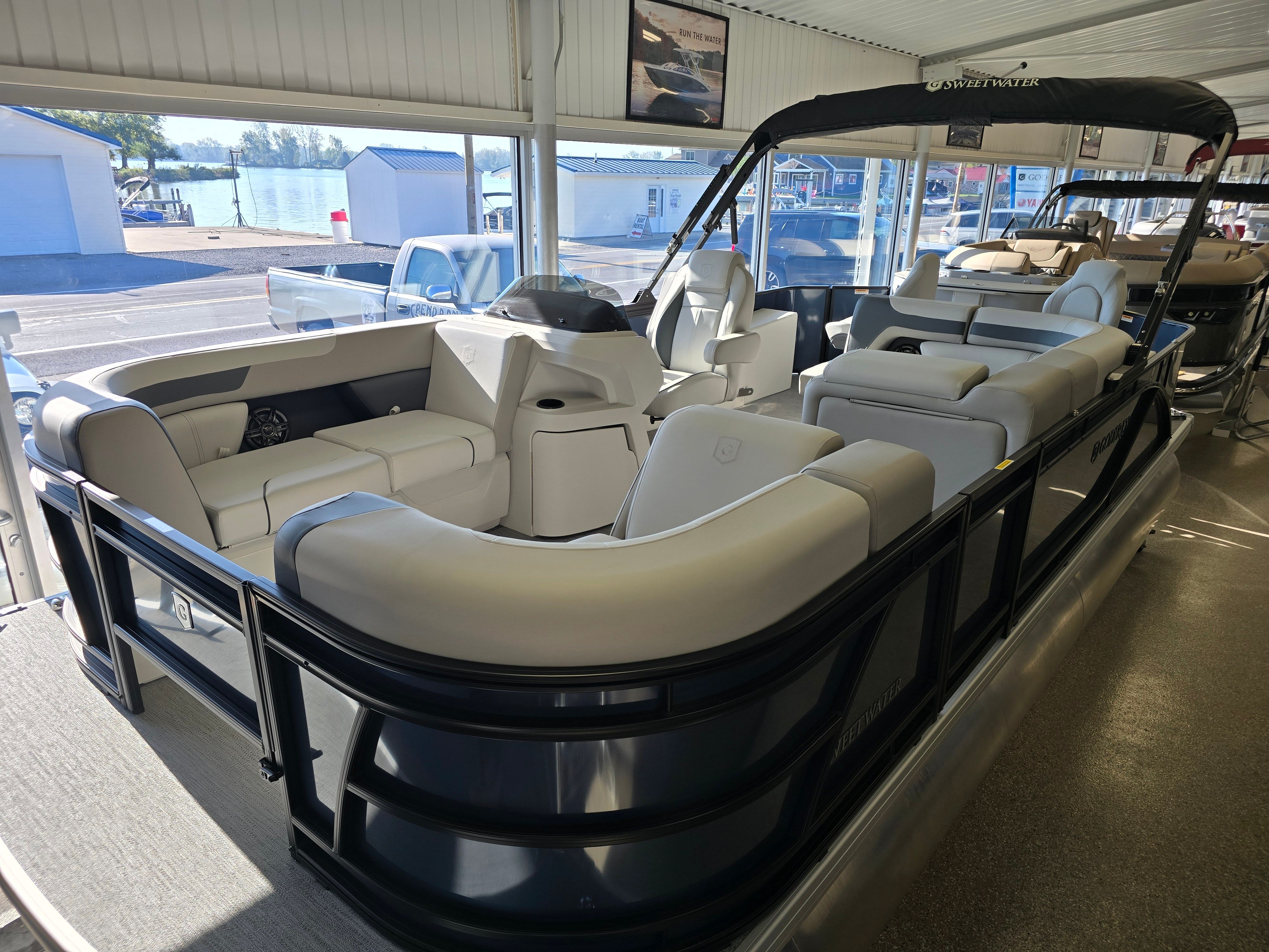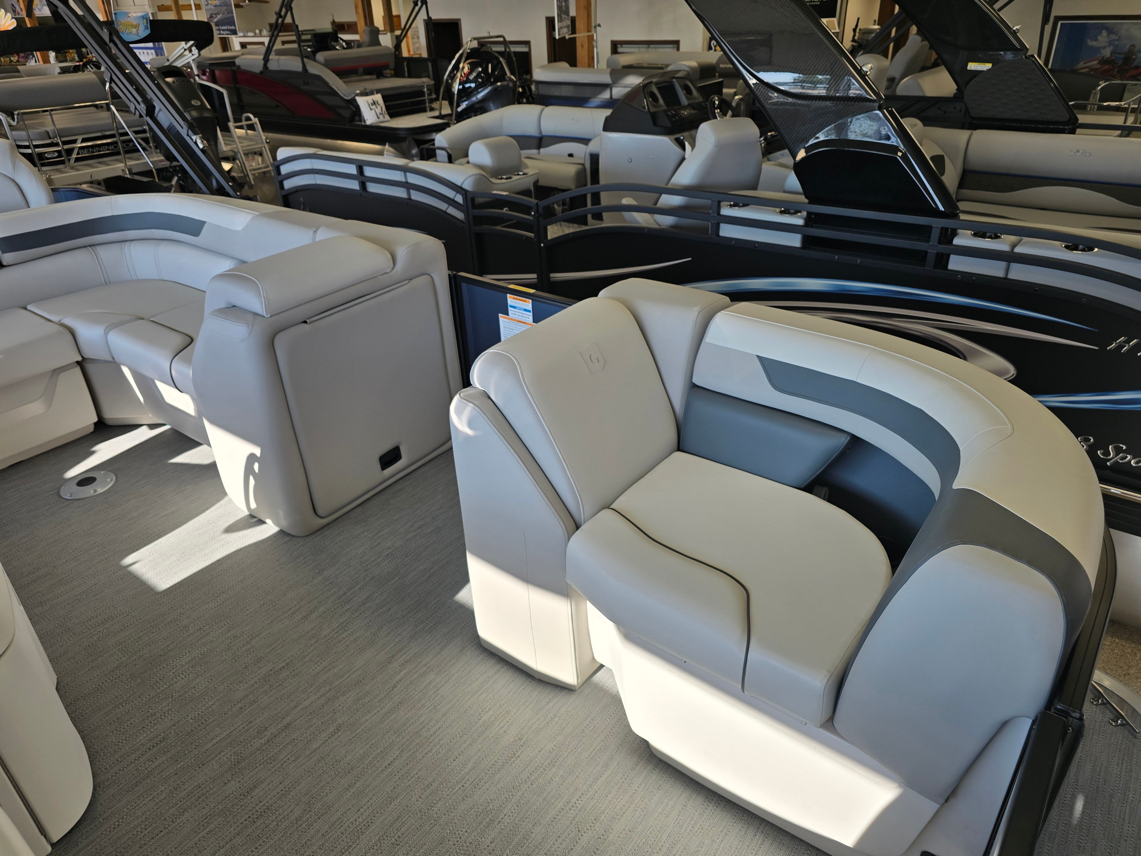The Godfrey SW 2086 Fsse Pontoon is packed with special features that elevate your boating experience. The inclusion of a trolling motor harness kit with plug and half gate provides versatility for fishing enthusiasts, allowing for easy installation and operation of a trolling motor. The Silver EZ Climb Stern Ladder ensures safe and convenient access to and from the water, making swimming and water sports more enjoyable for everyone on board.The upgraded aluminum rub rail with skirting not only protects the boat but also adds a sleek, modern look. The ski tow bar opens up a world of watersports possibilities, from tubing to wakeboarding, ensuring endless fun for thrill-seekers. The flooring is finished in Platinum Weave, offering both durability and a luxurious feel underfoot, while the Select Gray Interior base vinyl color creates a sophisticated and inviting atmosphere.One of the standout features is the captain’s chair upgrade, which includes a swivel, slider, reclining function, fold-down arms, and a 10-inch fixed pedestal. This ensures maximum comfort and adjustability for the captain, making long days on the water a pleasure. The anodized black rail frame and Pacific rail skin smooth finish further enhance the boat’s contemporary aesthetic, setting it apart from other pontoon boats for sale.