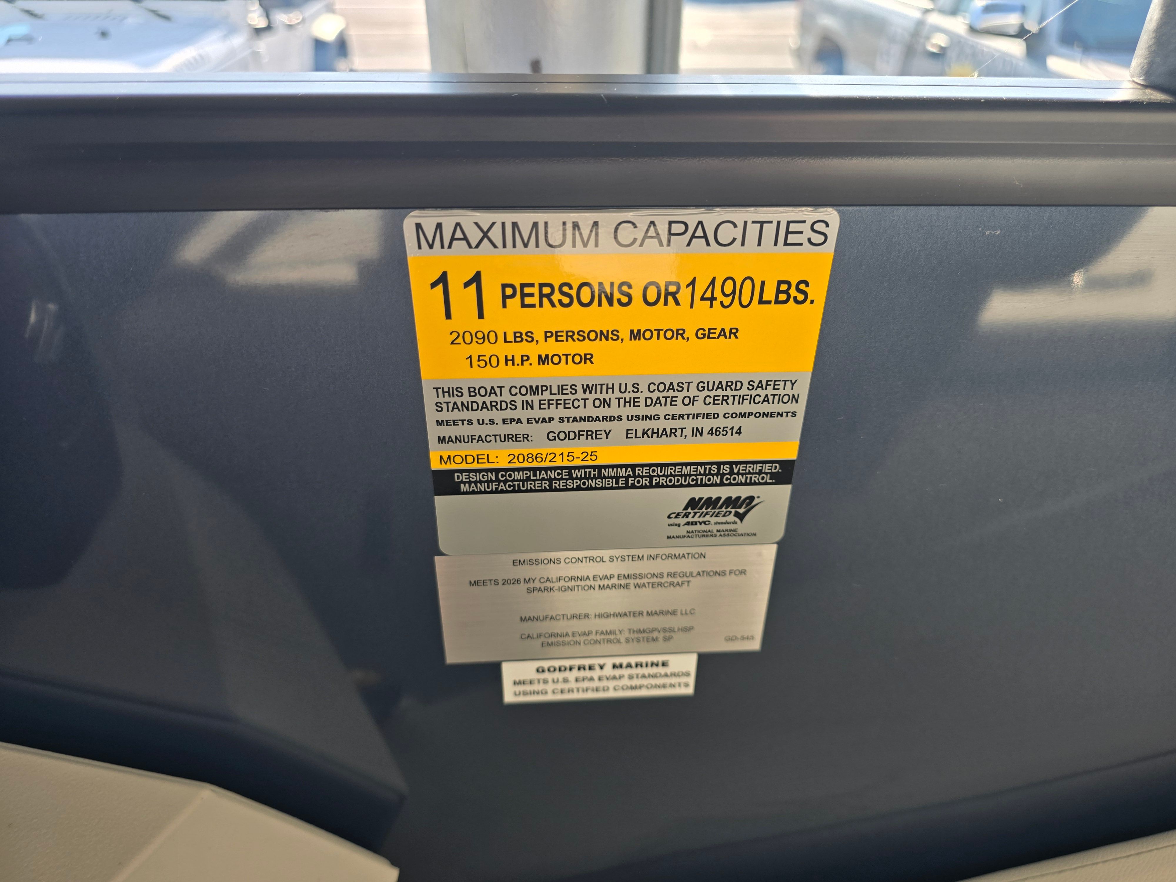 The 2026 Godfrey SW 2086 Fsse Pontoon is a brand-new model, measuring just over 20 feet in length (20.33 feet). This spacious pontoon offers ample room for passengers to relax, socialize, and enjoy the scenery. Its modern profile, highlighted by the Pacific Rail Skin Smooth and Anodized Black Rail Frame Color, ensures you’ll turn heads at every dock and marina. Whether you’re planning a day of cruising, watersports, or simply soaking up the sun, this Godfrey pontoon boat is engineered to provide the ultimate on-water experience.