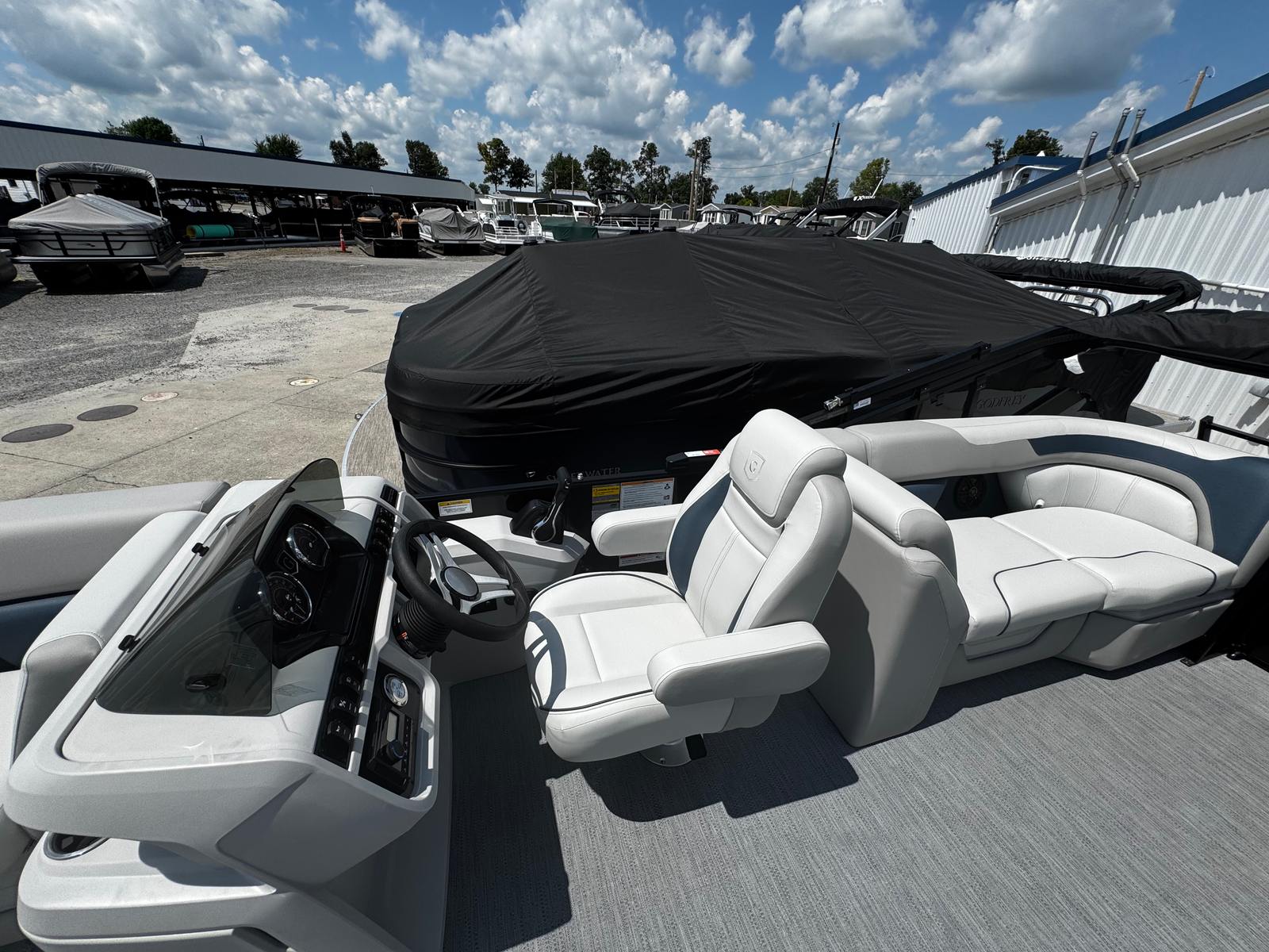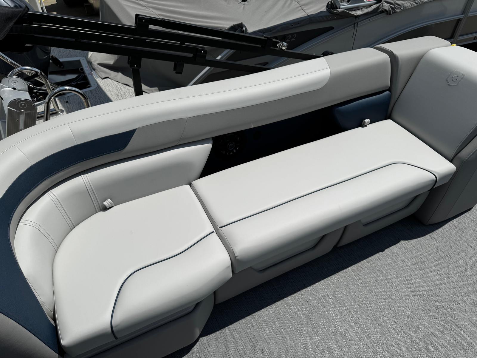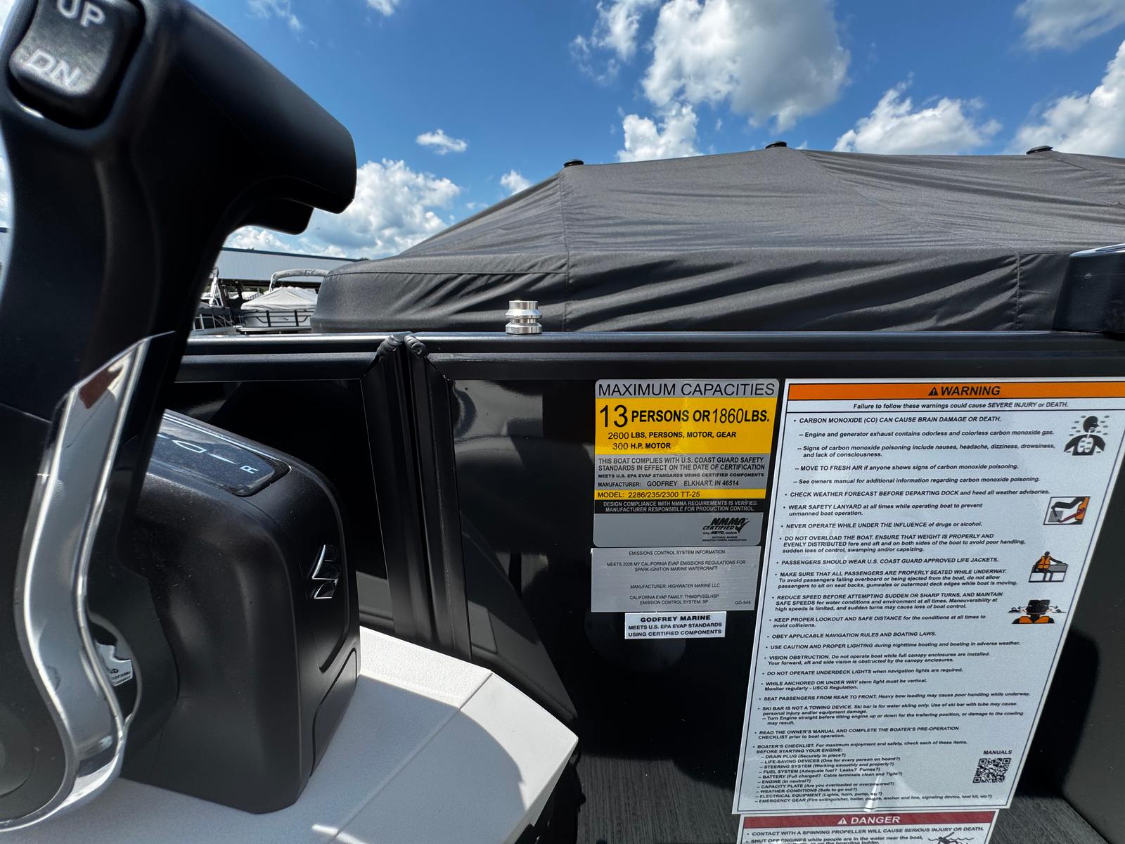 The Godfrey SW 2286 SB is loaded with features designed to enhance your boating experience. The striking Mid Body Pacific graphics and anodized black rail frame create a contemporary look, while the smooth black rail skin and Fastback rails contribute to both aesthetics and durability. The full Platinum Weave flooring not only looks elegant but is also easy to maintain, ensuring your pontoon remains pristine trip after trip.Step aboard and you’ll immediately notice the Select Gray interior, offering a modern and inviting atmosphere. The upgraded captain’s chair is a standout feature, boasting swivel, slider, reclining, and fold-down arms, all mounted on a 10-inch fixed pedestal. This ensures the captain enjoys maximum comfort and control, whether navigating open waters or docking at your favorite marina.For added convenience, additional USB-C charging ports are thoughtfully placed throughout the layout, allowing everyone on board to keep their devices powered up and ready for action. The Black EZ Climb Stern ladder provides easy access to and from the water, making swimming and water sports a breeze for guests of all ages.