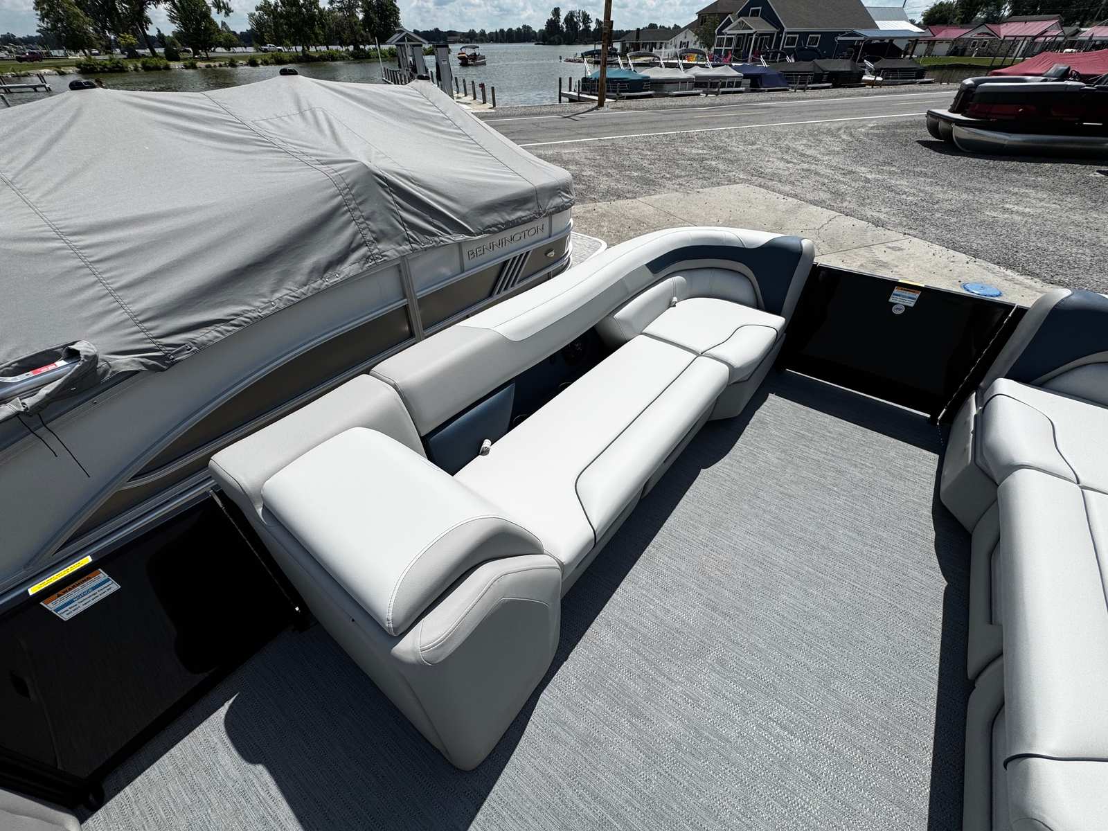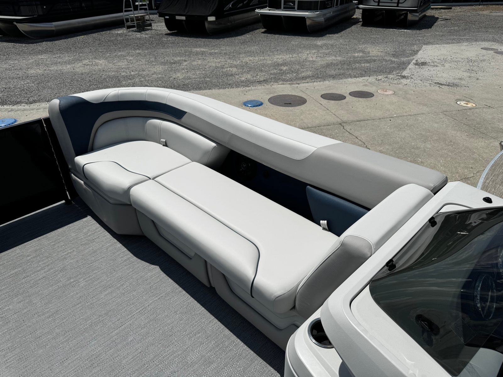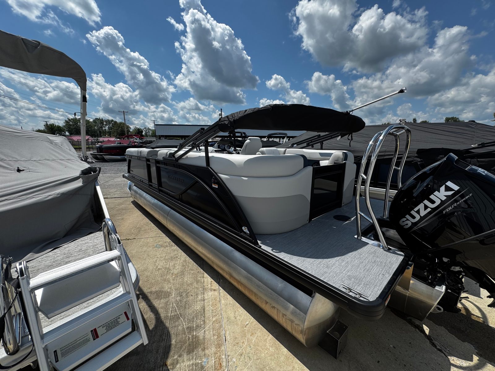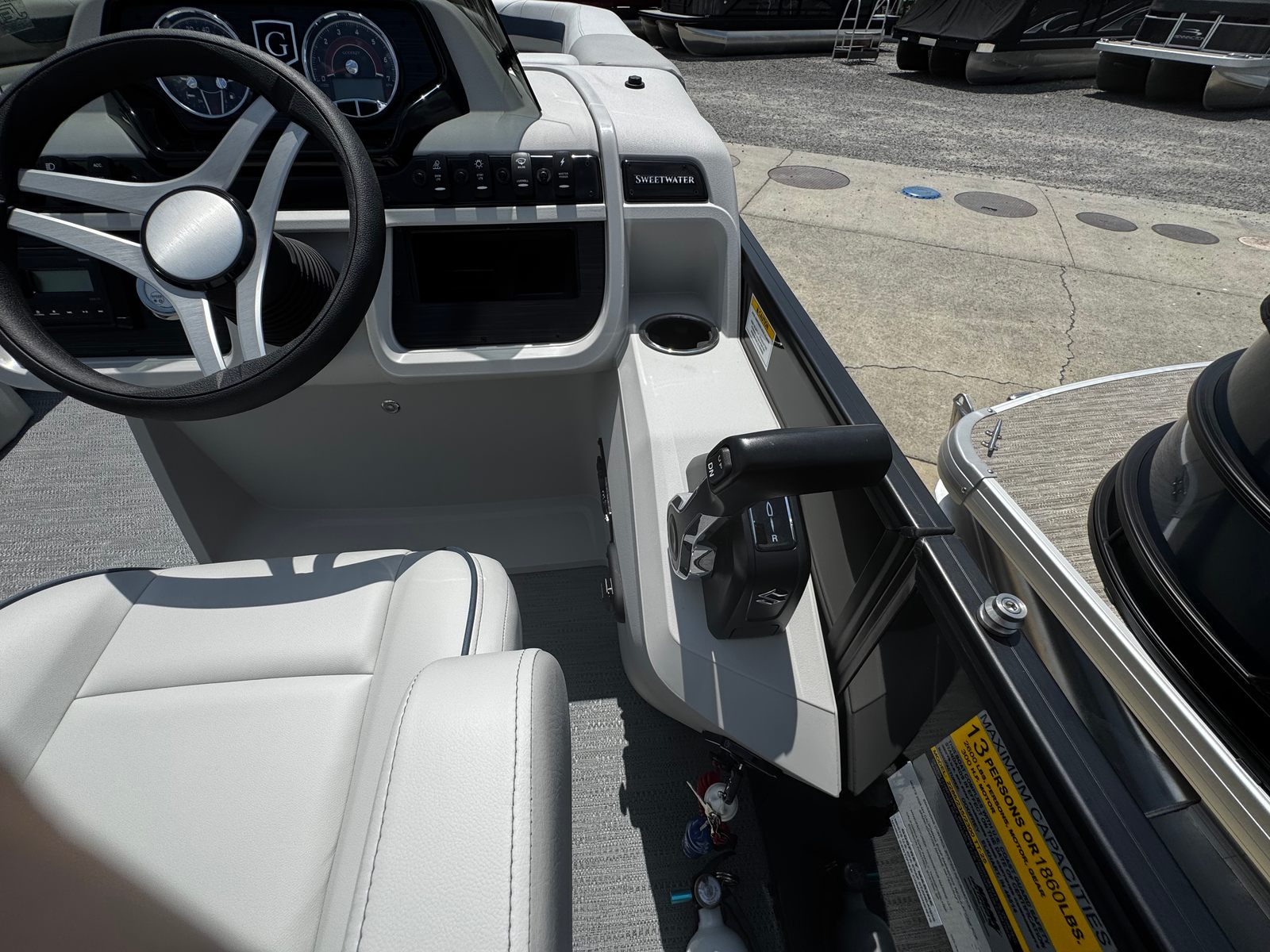 The Godfrey SW 2286 SB is loaded with features designed to enhance your boating experience. The striking Mid Body Pacific graphics and anodized black rail frame create a contemporary look, while the smooth black rail skin and Fastback rails contribute to both aesthetics and durability. The full Platinum Weave flooring not only looks elegant but is also easy to maintain, ensuring your pontoon remains pristine trip after trip.Step aboard and you’ll immediately notice the Select Gray interior, offering a modern and inviting atmosphere. The upgraded captain’s chair is a standout feature, boasting swivel, slider, reclining, and fold-down arms, all mounted on a 10-inch fixed pedestal. This ensures the captain enjoys maximum comfort and control, whether navigating open waters or docking at your favorite marina.For added convenience, additional USB-C charging ports are thoughtfully placed throughout the layout, allowing everyone on board to keep their devices powered up and ready for action. The Black EZ Climb Stern ladder provides easy access to and from the water, making swimming and water sports a breeze for guests of all ages.