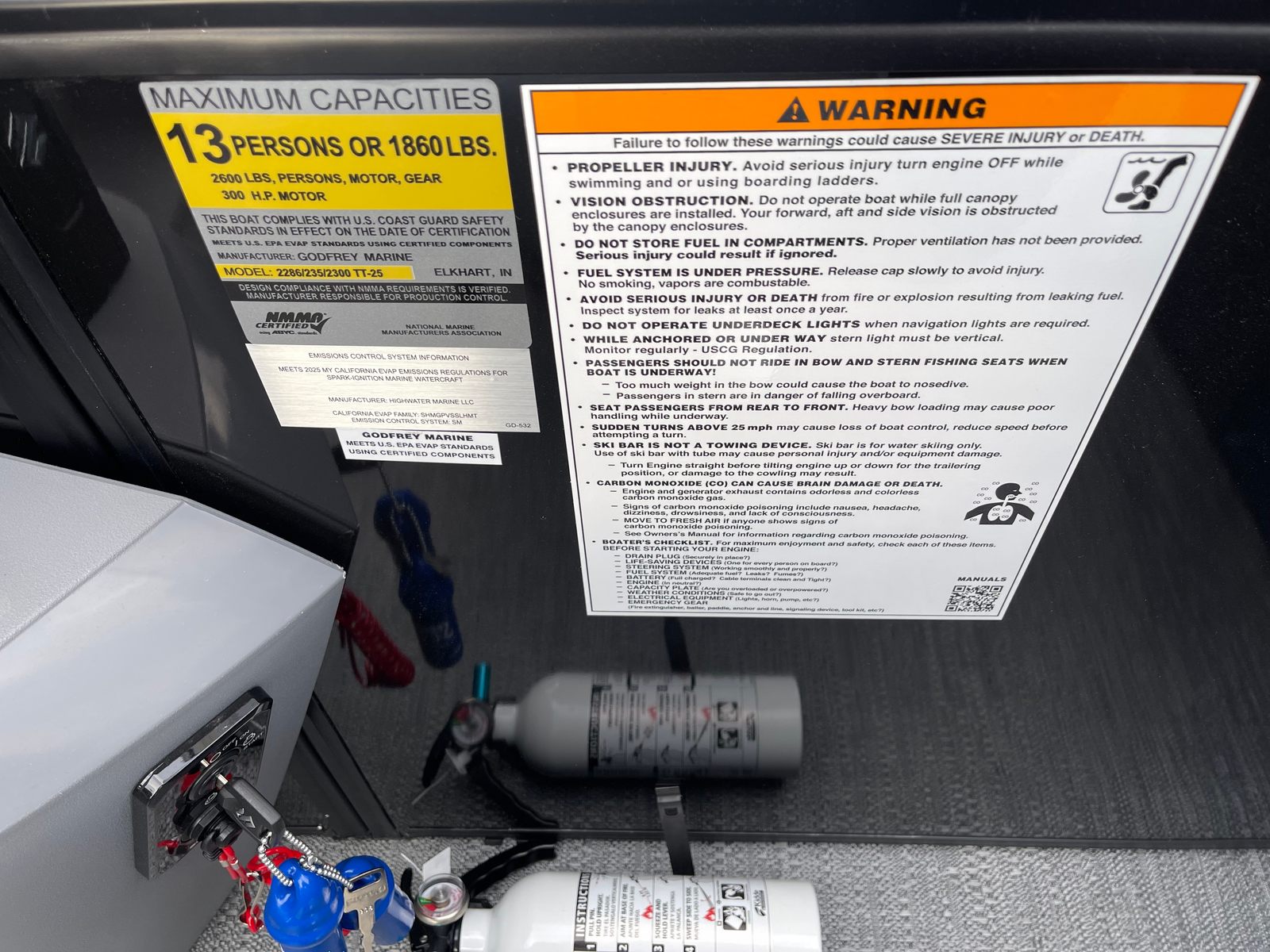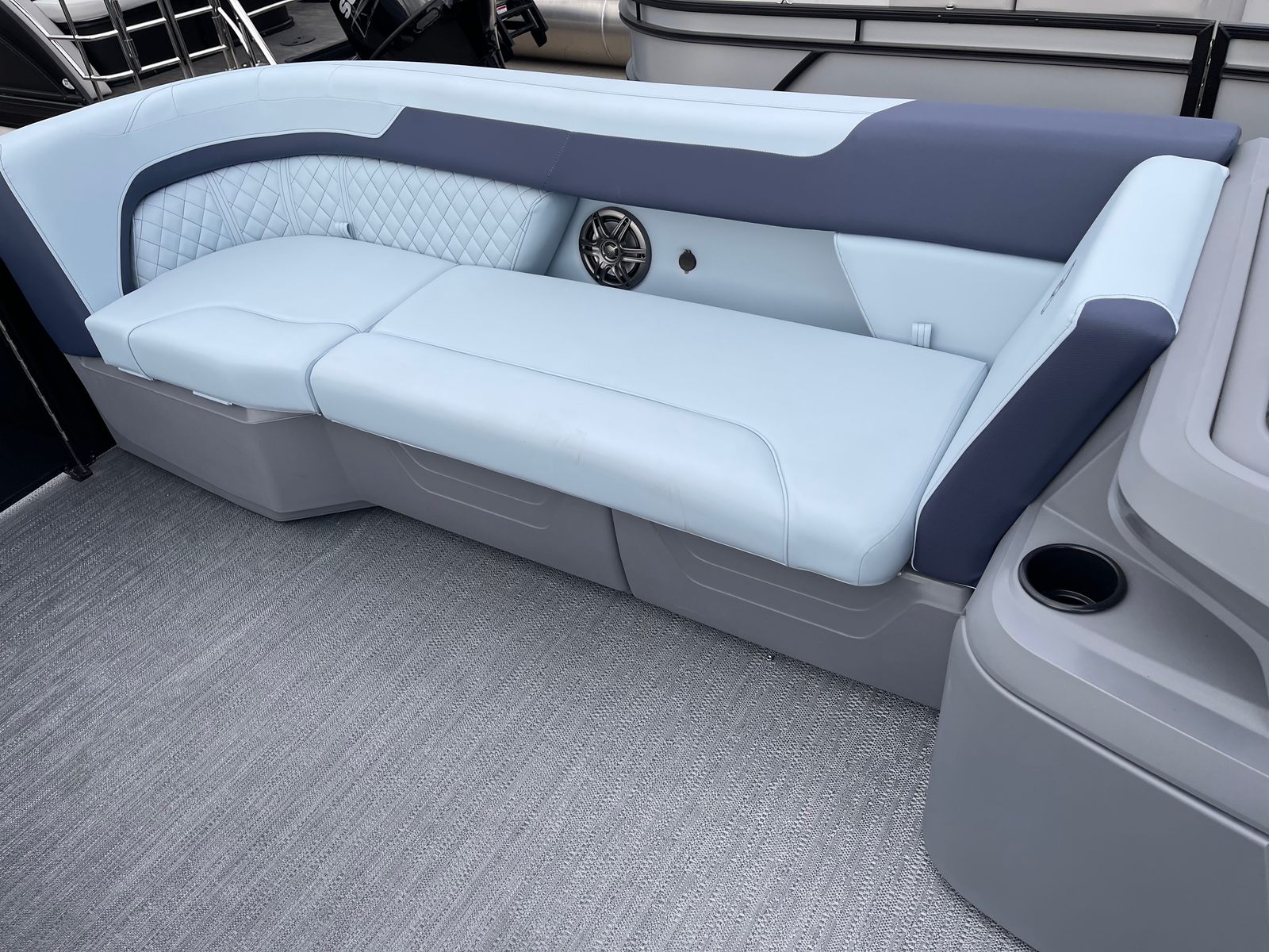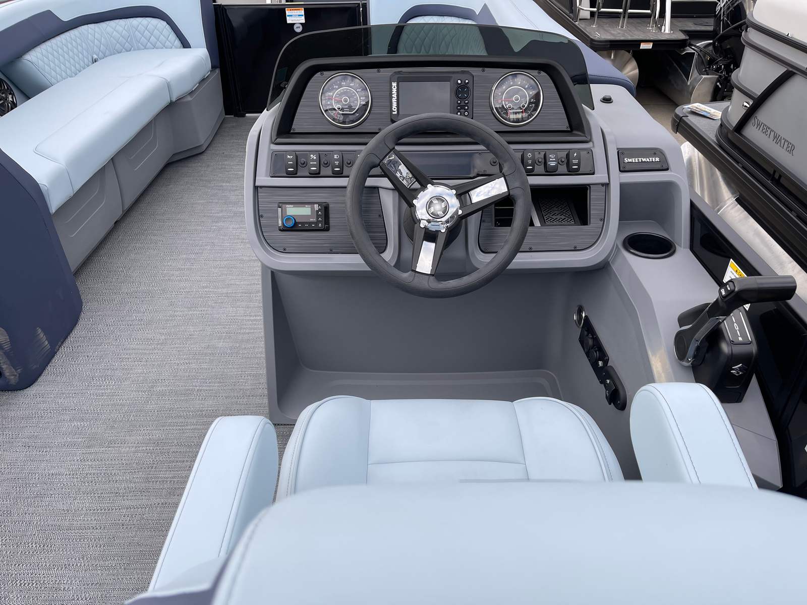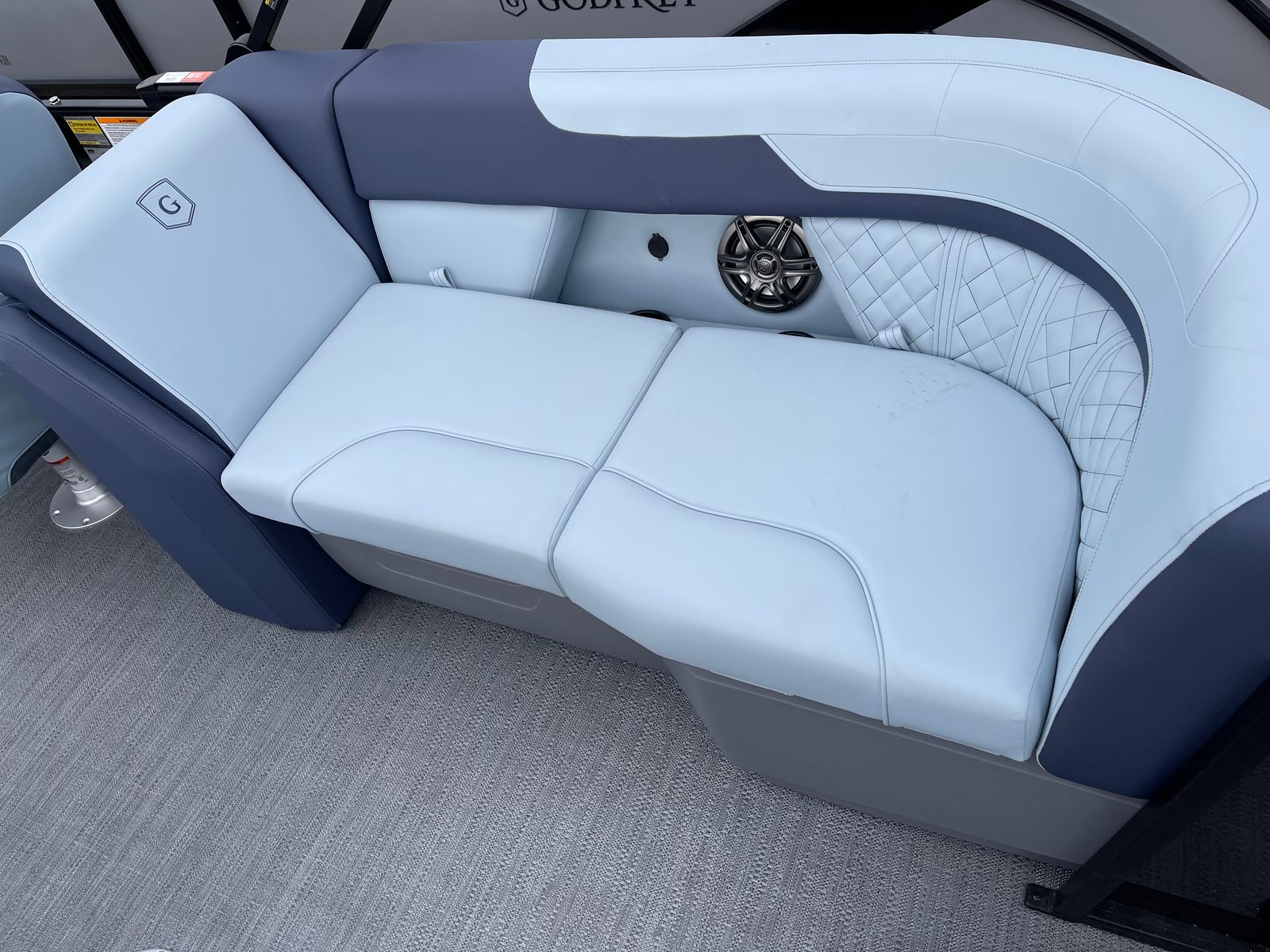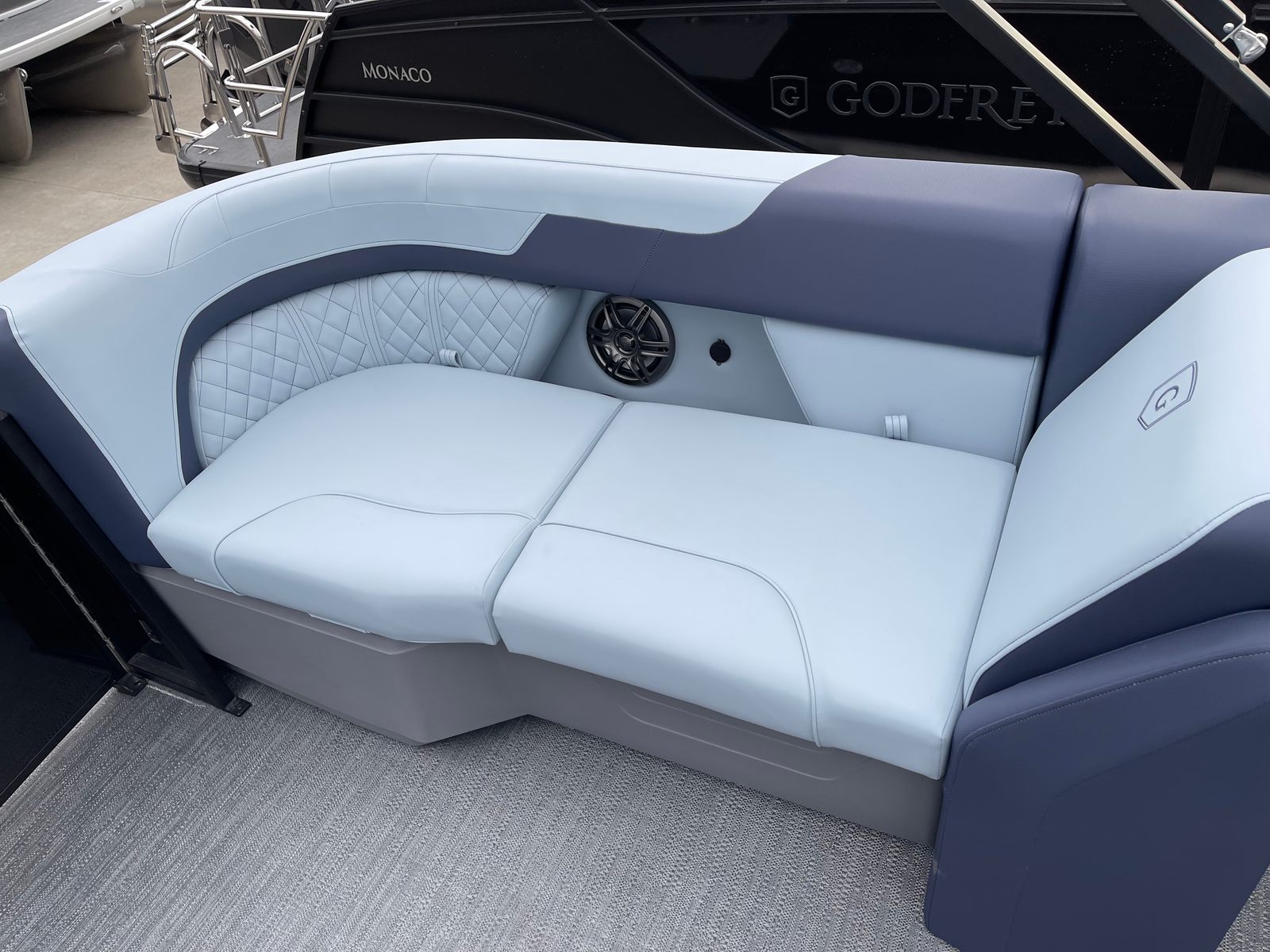 The Godfrey SW 2286 SB is packed with premium features designed to enhance your comfort, convenience, and enjoyment. The full-length Platinum Weave flooring offers a stylish and slip-resistant surface, perfect for barefoot relaxation or energetic gatherings. The Riviera Cool Touch base vinyl color not only looks sophisticated but also stays cool under the sun, ensuring maximum comfort even on the hottest days.The boat’s rail system is a true standout, featuring anodized black frames, smooth black rail skins, and Fastback rails for a modern, sporty appearance. The sport-polished ski tow bar adds a touch of excitement, making it easy to enjoy watersports with family and friends. LED docking lights provide excellent visibility for safe and easy docking, even after the sun goes down. The Low Band Carbon Fiber graphics give the pontoon a contemporary edge, ensuring it looks as good as it performs.
