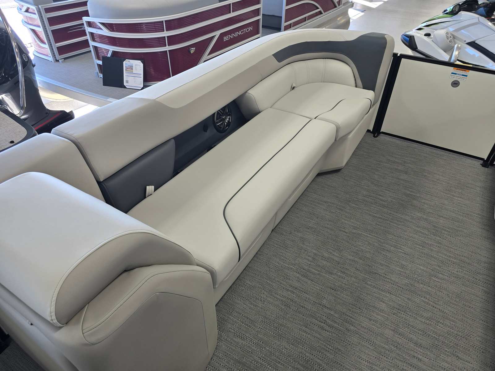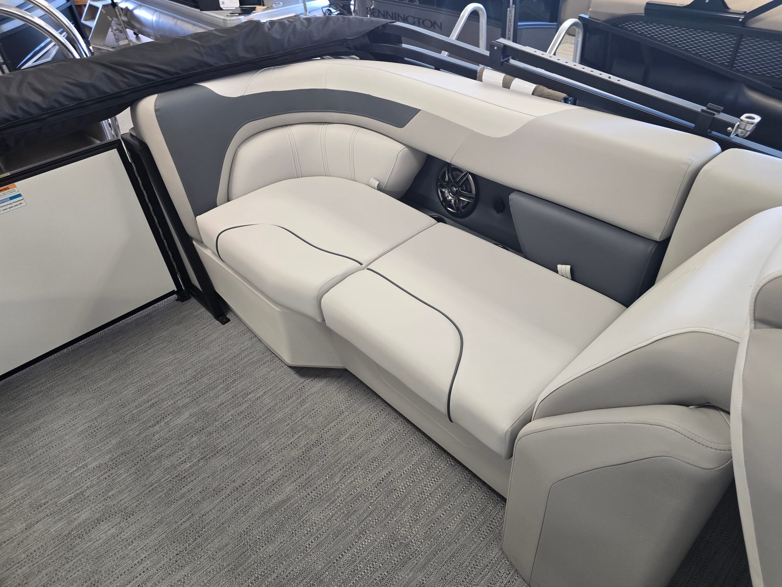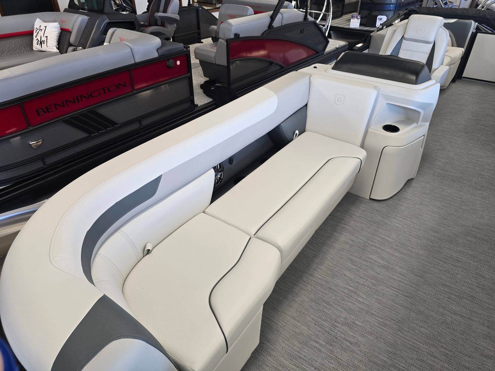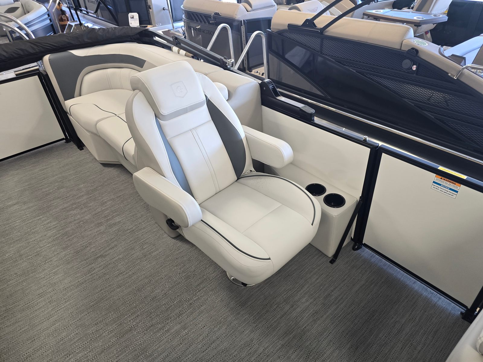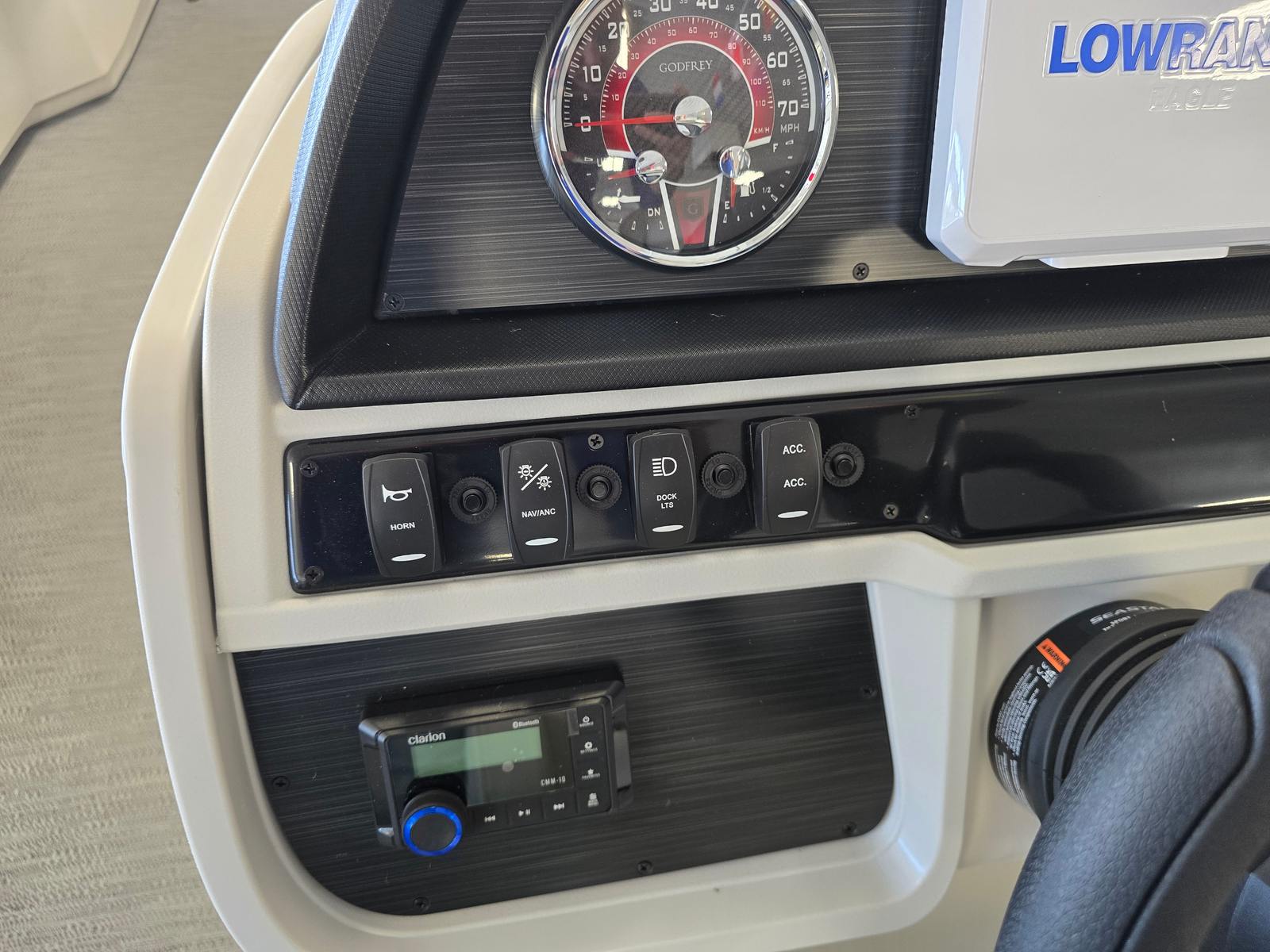 The Godfrey SW 2286 SBC is packed with premium features that set it apart from other pontoon boats for sale. Its graphics feature a low band carbon fiber design, adding a touch of modern sophistication to its exterior. The anodized black rail frame and smooth pearl white rail skin create a striking visual contrast, while the fastback rails enhance both style and safety.For those who love water sports, the ultimate ski tow in polished finish provides a sturdy and stylish anchor for skiing and tubing adventures. The flooring is finished in platinum weave, offering both durability and comfort underfoot. Boarding and swimming are made effortless with the Lillipad ladder, while LED docking lights ensure safe and easy navigation during evening outings.