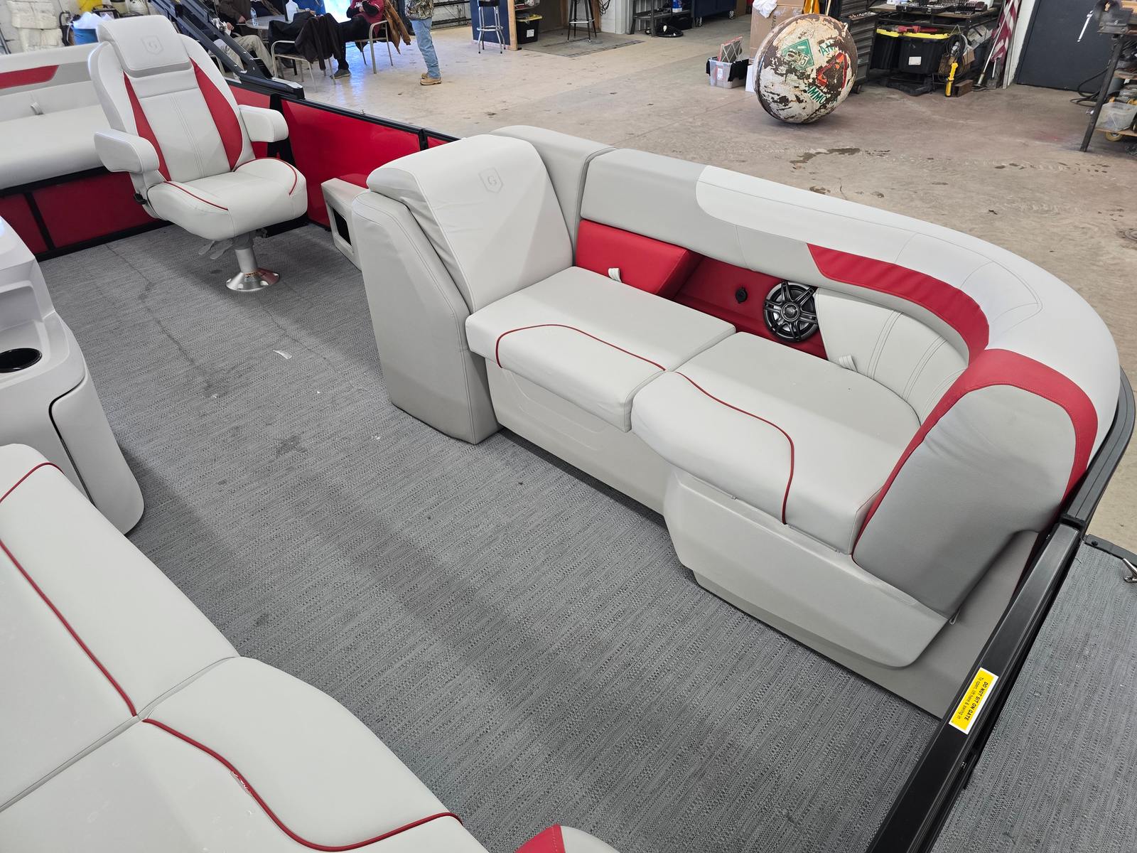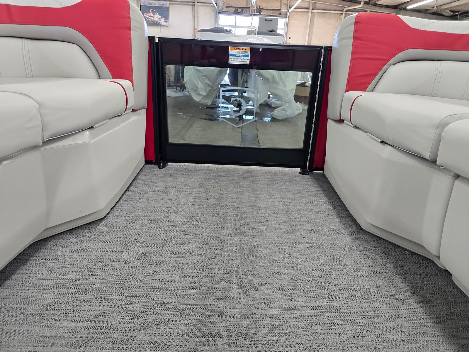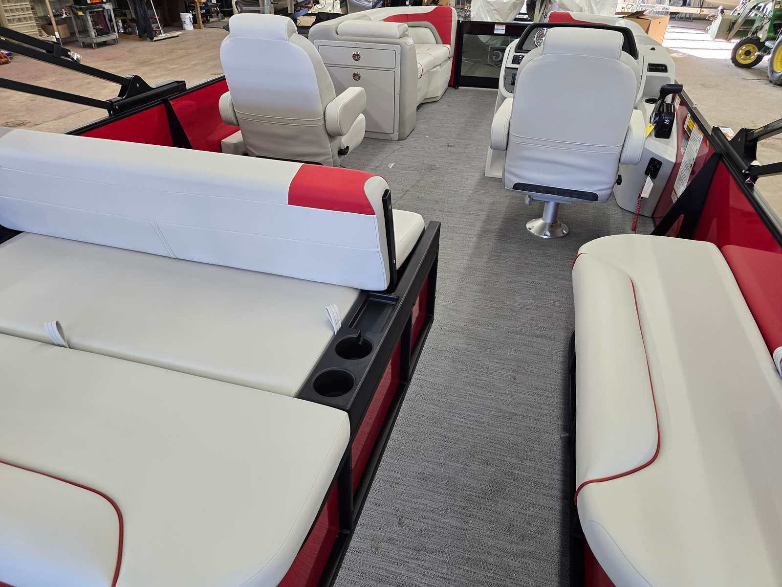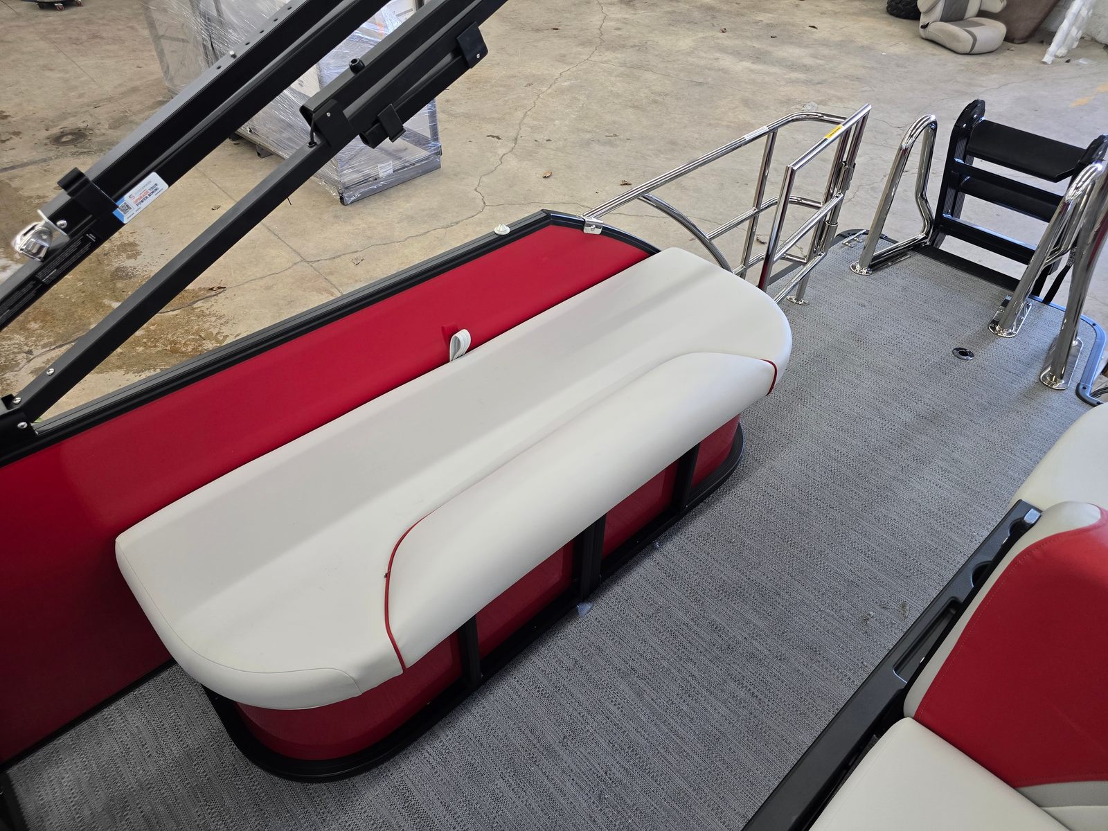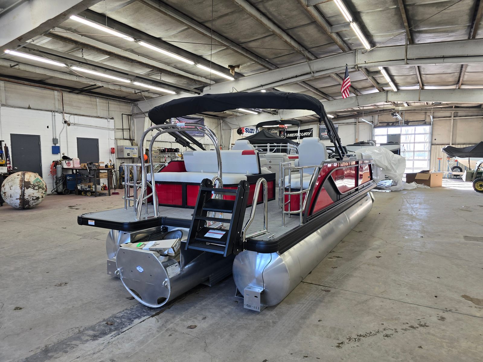This new pontoon boat is loaded with features designed to elevate your boating experience. The Suzuki DF200ATX engine is renowned for its efficiency and quiet operation, allowing you to enjoy the sounds of nature or your favorite tunes without distraction. The Click & Cruise Tethers (set of 2) offer added convenience and safety, making it easy to secure gear or assist passengers.The boat’s exterior is a visual masterpiece, featuring Graphics - Low Band Carbon Fiber for a modern, sporty look. The Anodized Black Rail Frame and Crimson Smooth Rail Skin create a bold, contemporary aesthetic, while the Fastback Rails add both style and structural integrity. The SeaView Bow Gate not only enhances the boat’s appearance but also provides clear sightlines and easy access to the bow area.For those who love to swim or enjoy water sports, the Lillipad Ladder is a game-changer, offering sturdy and convenient access in and out of the water. LED Docking Lights ensure safe and stylish arrivals and departures, even after the sun goes down, adding both functionality and flair to your boating adventures.