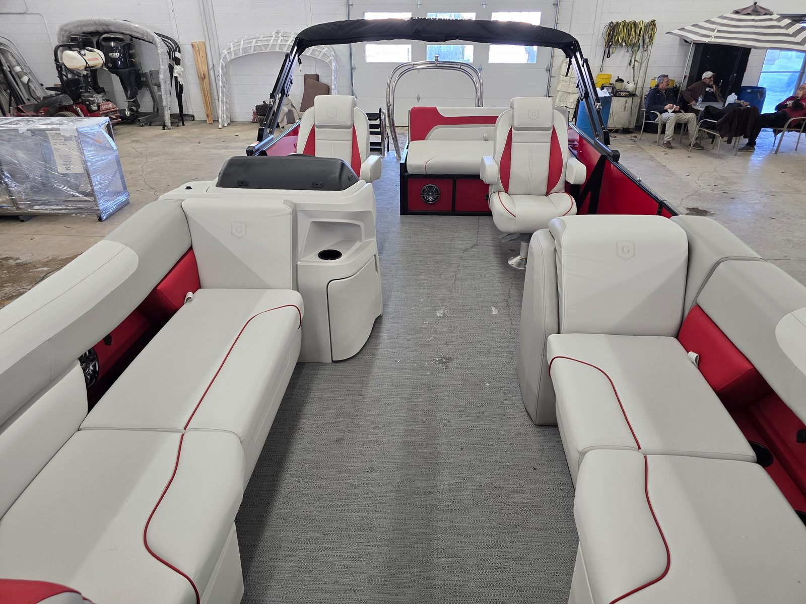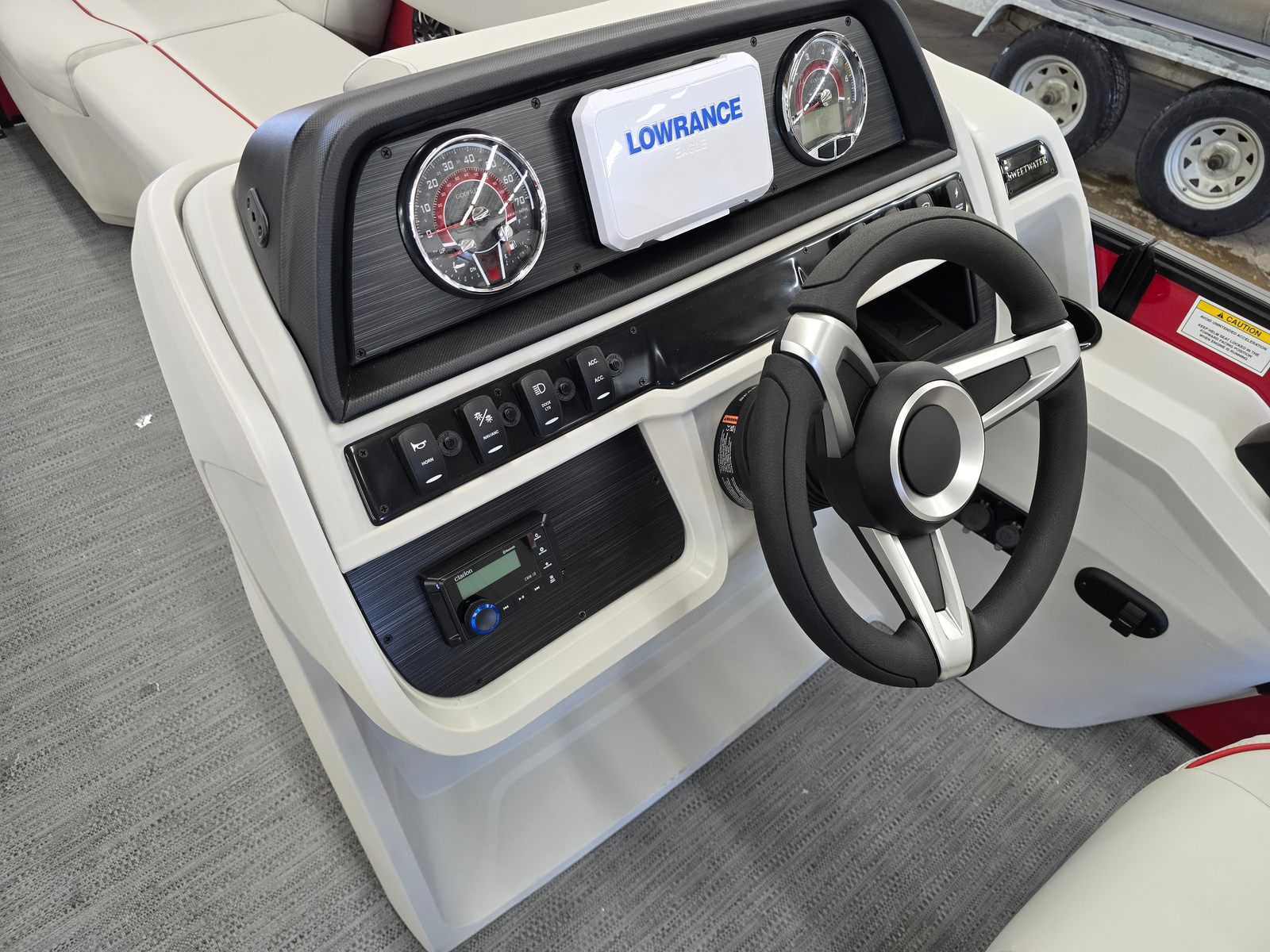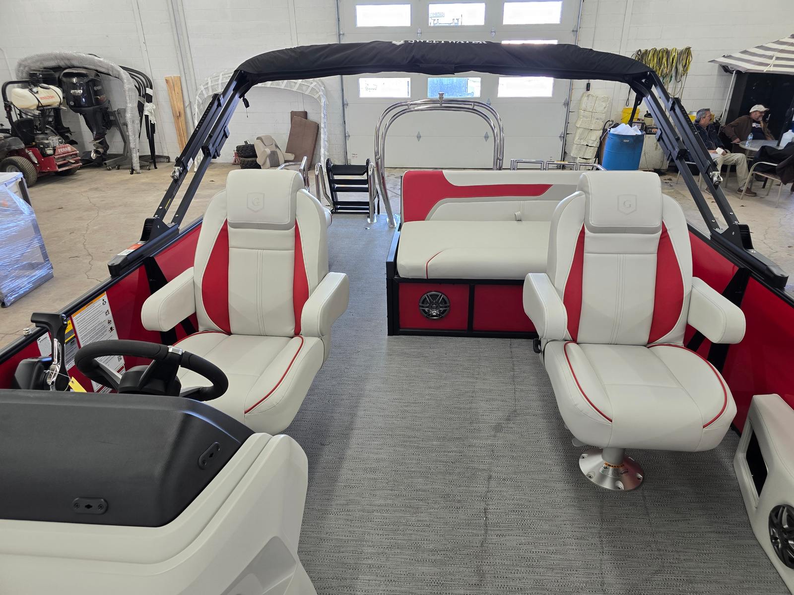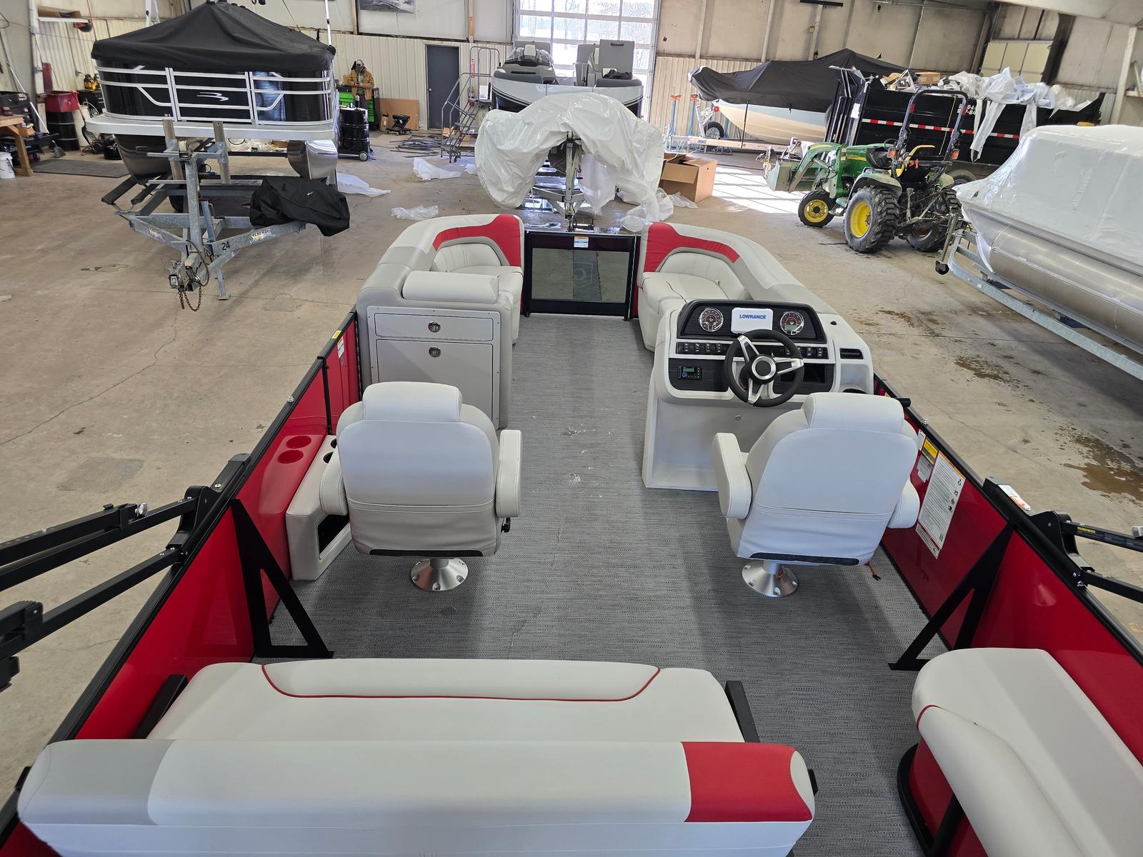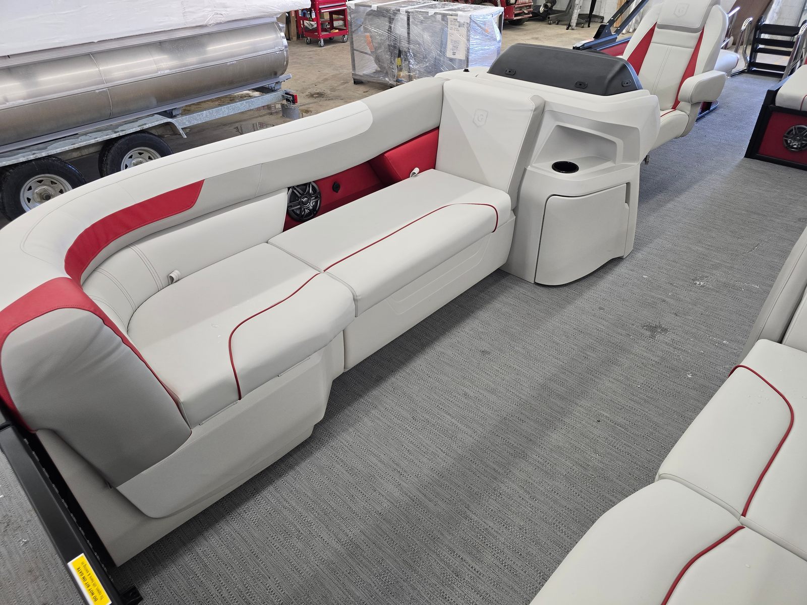 This new pontoon boat is loaded with features designed to elevate your boating experience. The Suzuki DF200ATX engine is renowned for its efficiency and quiet operation, allowing you to enjoy the sounds of nature or your favorite tunes without distraction. The Click & Cruise Tethers (set of 2) offer added convenience and safety, making it easy to secure gear or assist passengers.The boat’s exterior is a visual masterpiece, featuring Graphics - Low Band Carbon Fiber for a modern, sporty look. The Anodized Black Rail Frame and Crimson Smooth Rail Skin create a bold, contemporary aesthetic, while the Fastback Rails add both style and structural integrity. The SeaView Bow Gate not only enhances the boat’s appearance but also provides clear sightlines and easy access to the bow area.For those who love to swim or enjoy water sports, the Lillipad Ladder is a game-changer, offering sturdy and convenient access in and out of the water. LED Docking Lights ensure safe and stylish arrivals and departures, even after the sun goes down, adding both functionality and flair to your boating adventures.
