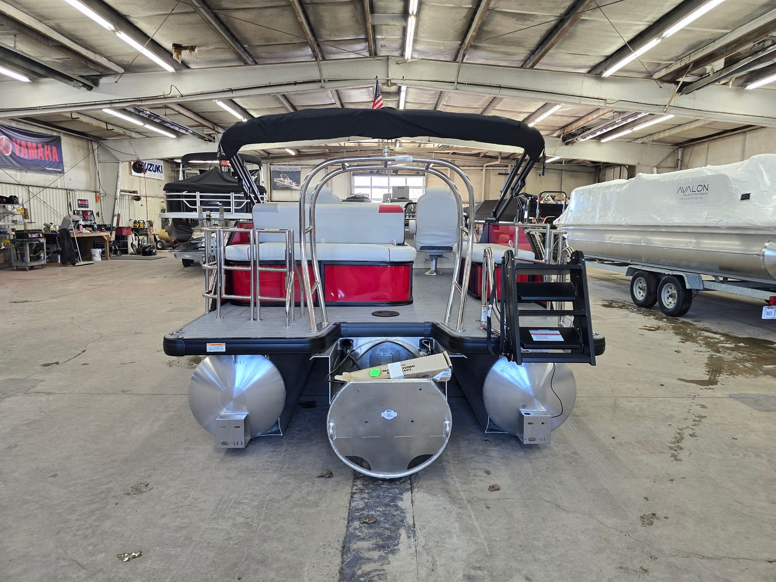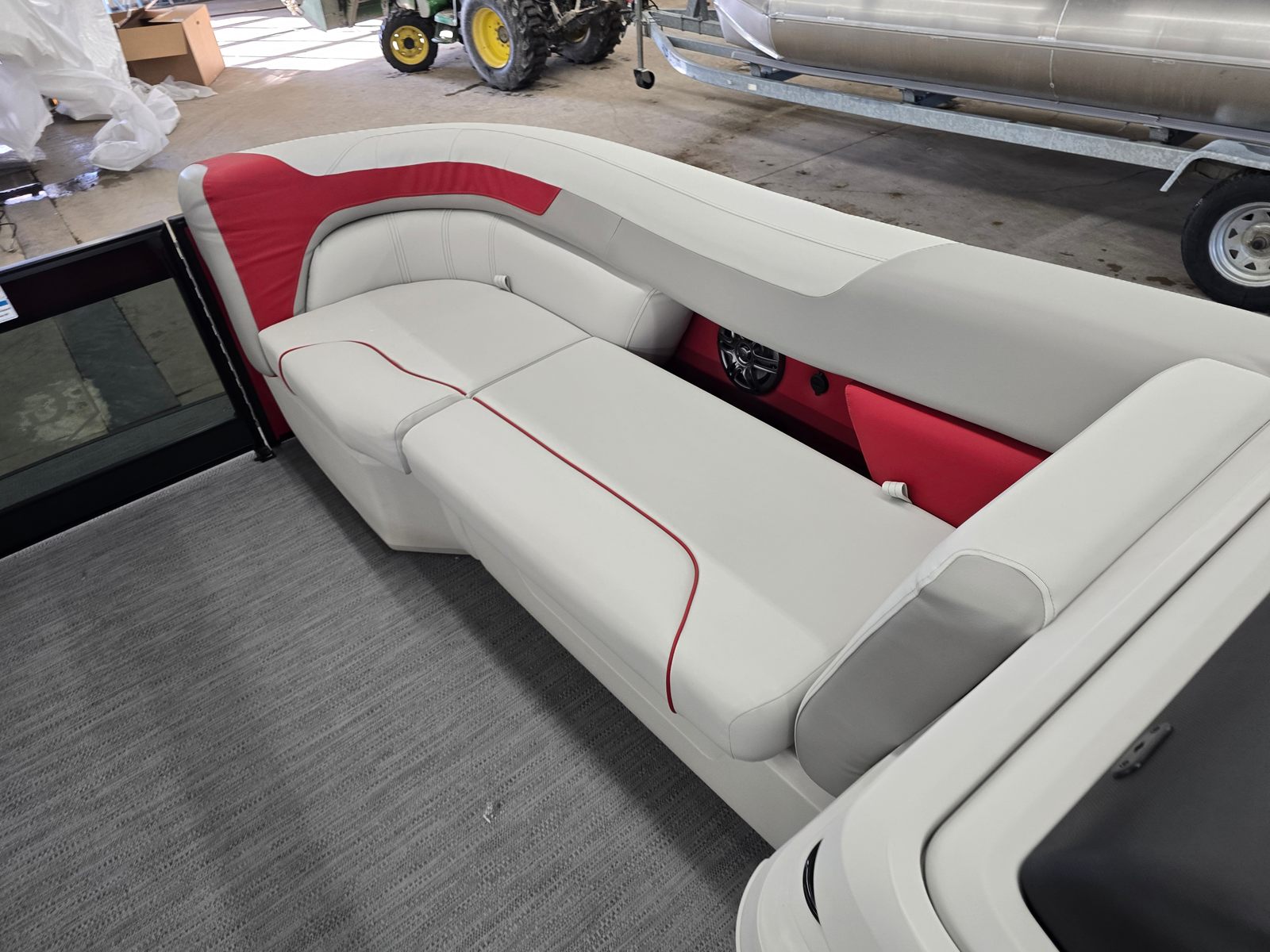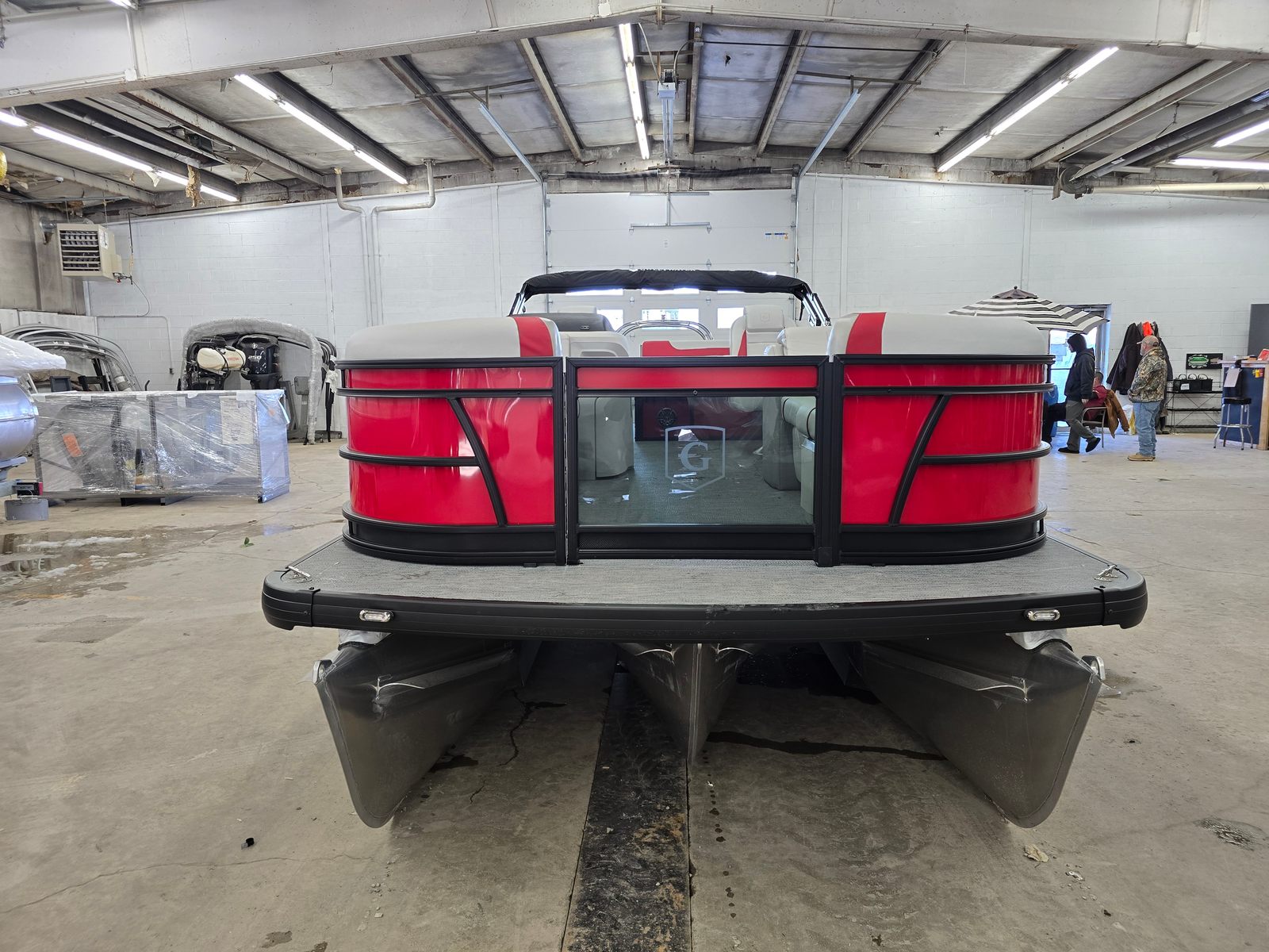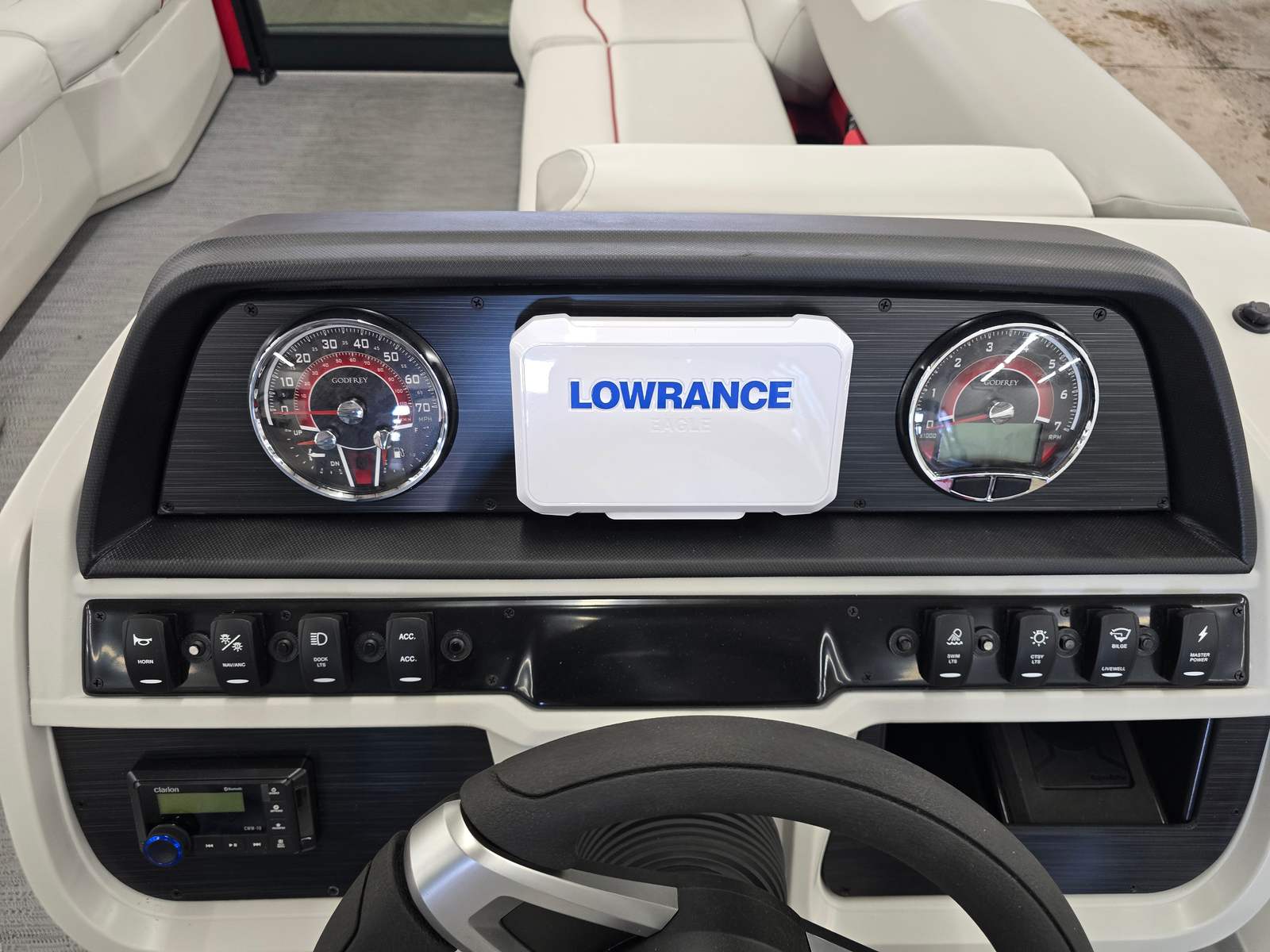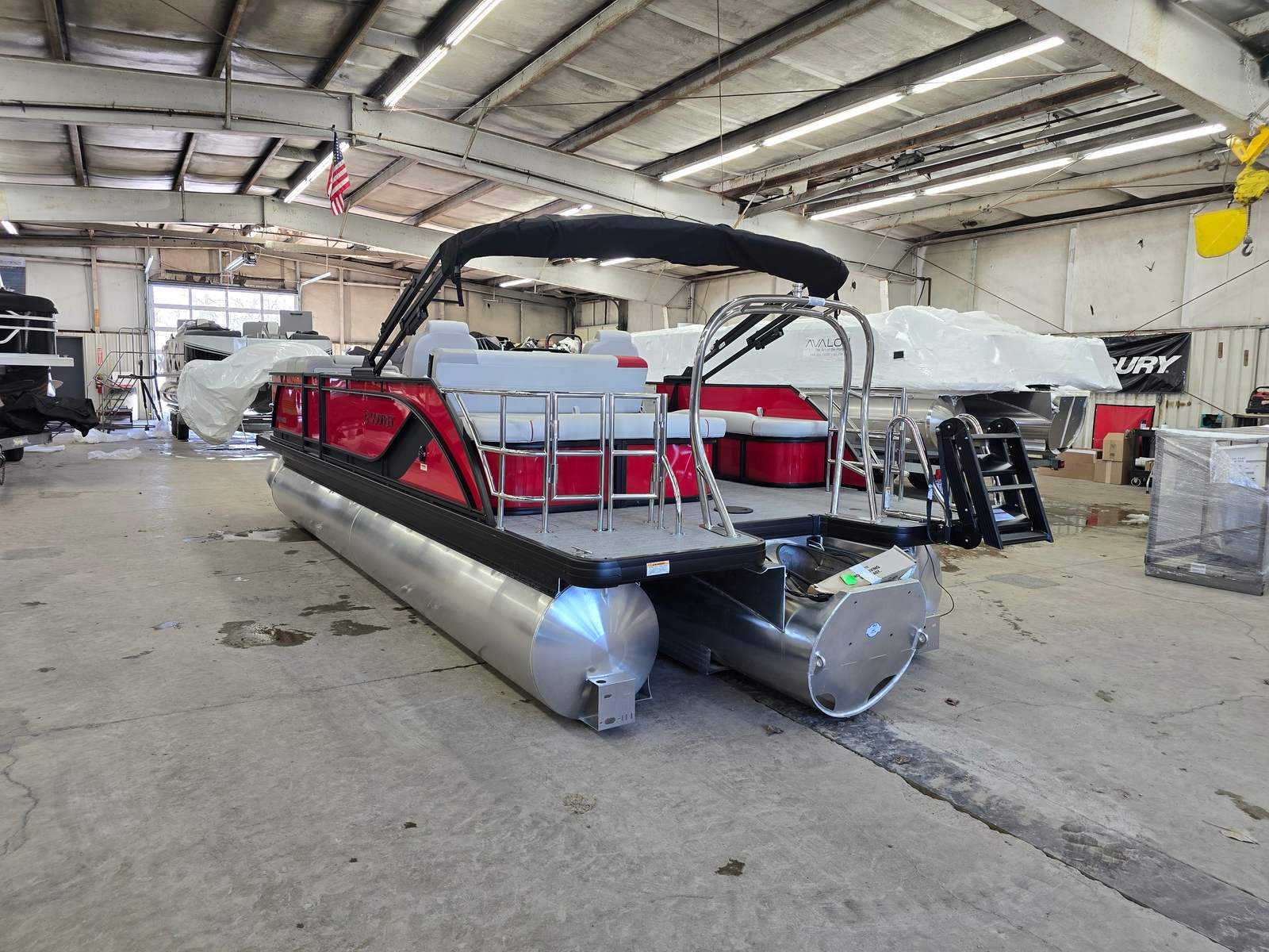 This new pontoon boat is loaded with features designed to elevate your boating experience. The Suzuki DF200ATX engine is renowned for its efficiency and quiet operation, allowing you to enjoy the sounds of nature or your favorite tunes without distraction. The Click & Cruise Tethers (set of 2) offer added convenience and safety, making it easy to secure gear or assist passengers.The boat’s exterior is a visual masterpiece, featuring Graphics - Low Band Carbon Fiber for a modern, sporty look. The Anodized Black Rail Frame and Crimson Smooth Rail Skin create a bold, contemporary aesthetic, while the Fastback Rails add both style and structural integrity. The SeaView Bow Gate not only enhances the boat’s appearance but also provides clear sightlines and easy access to the bow area.For those who love to swim or enjoy water sports, the Lillipad Ladder is a game-changer, offering sturdy and convenient access in and out of the water. LED Docking Lights ensure safe and stylish arrivals and departures, even after the sun goes down, adding both functionality and flair to your boating adventures.