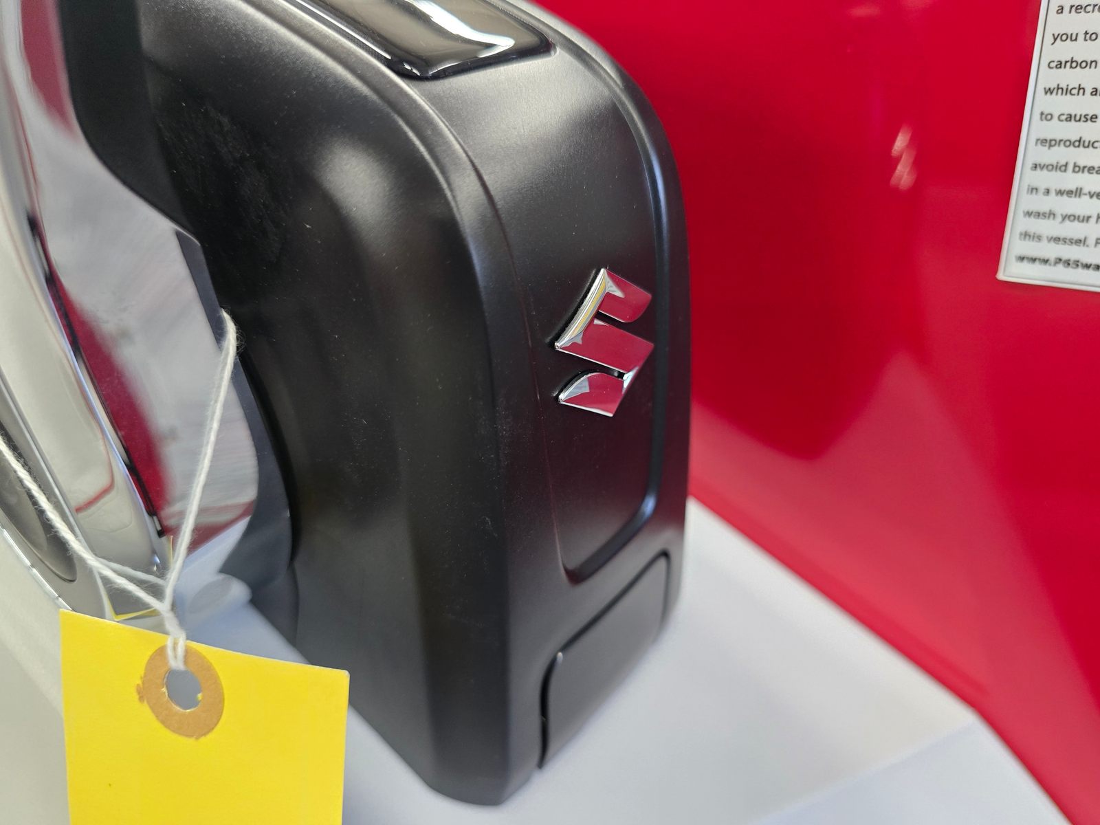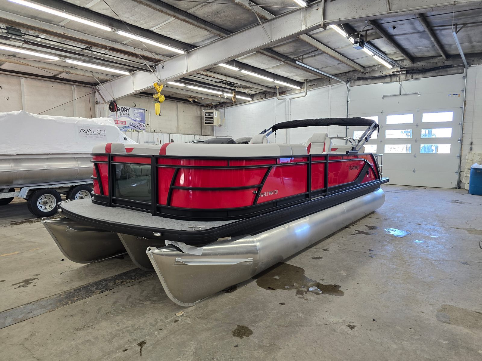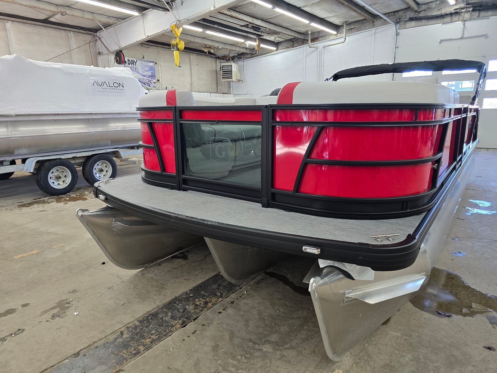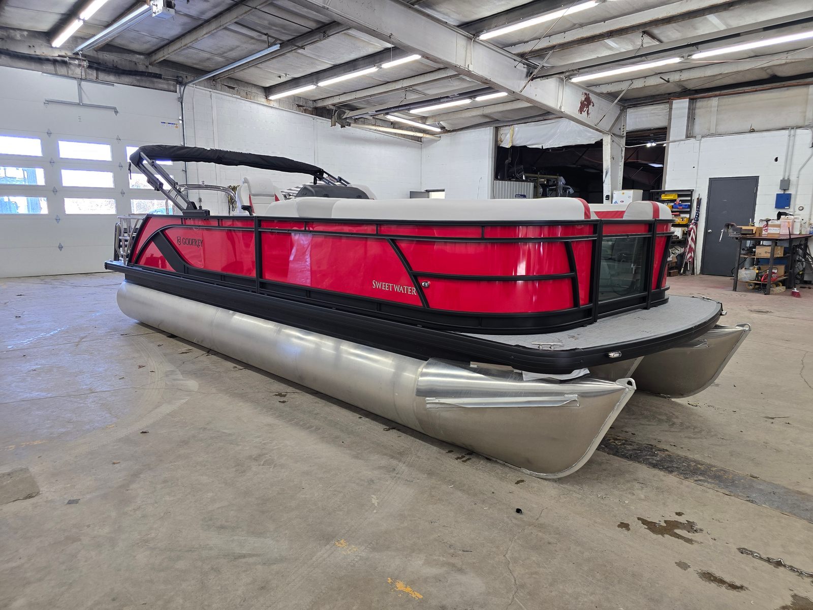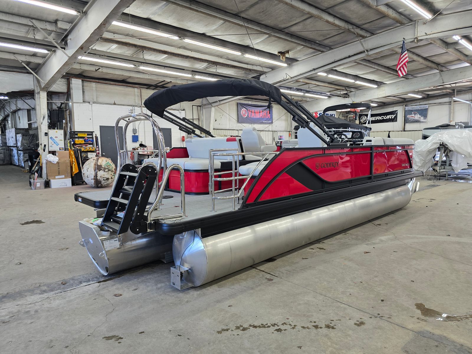 This new pontoon boat is loaded with features designed to elevate your boating experience. The Suzuki DF200ATX engine is renowned for its efficiency and quiet operation, allowing you to enjoy the sounds of nature or your favorite tunes without distraction. The Click & Cruise Tethers (set of 2) offer added convenience and safety, making it easy to secure gear or assist passengers.The boat’s exterior is a visual masterpiece, featuring Graphics - Low Band Carbon Fiber for a modern, sporty look. The Anodized Black Rail Frame and Crimson Smooth Rail Skin create a bold, contemporary aesthetic, while the Fastback Rails add both style and structural integrity. The SeaView Bow Gate not only enhances the boat’s appearance but also provides clear sightlines and easy access to the bow area.For those who love to swim or enjoy water sports, the Lillipad Ladder is a game-changer, offering sturdy and convenient access in and out of the water. LED Docking Lights ensure safe and stylish arrivals and departures, even after the sun goes down, adding both functionality and flair to your boating adventures.