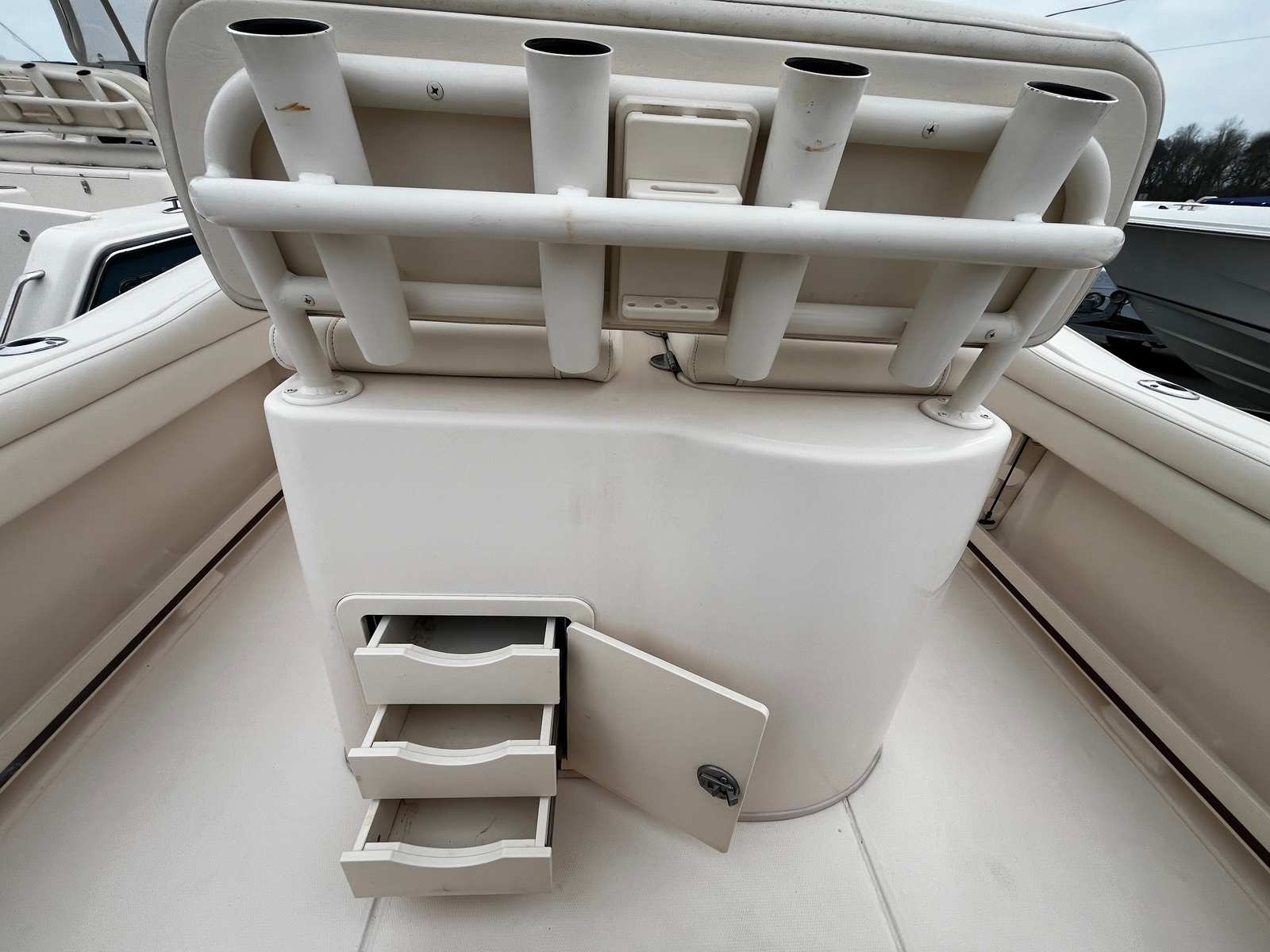 • Deluxe Lean Bar w/ Livewell – Comfortable helm seating with an integrated livewell perfect for keeping bait fresh.