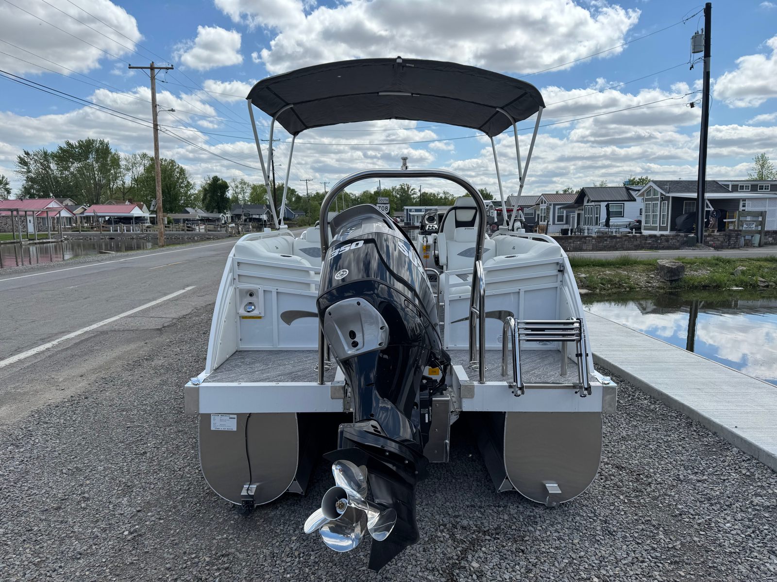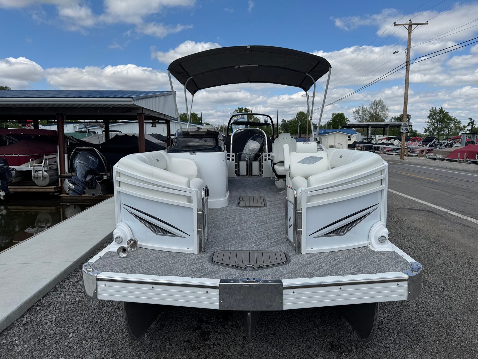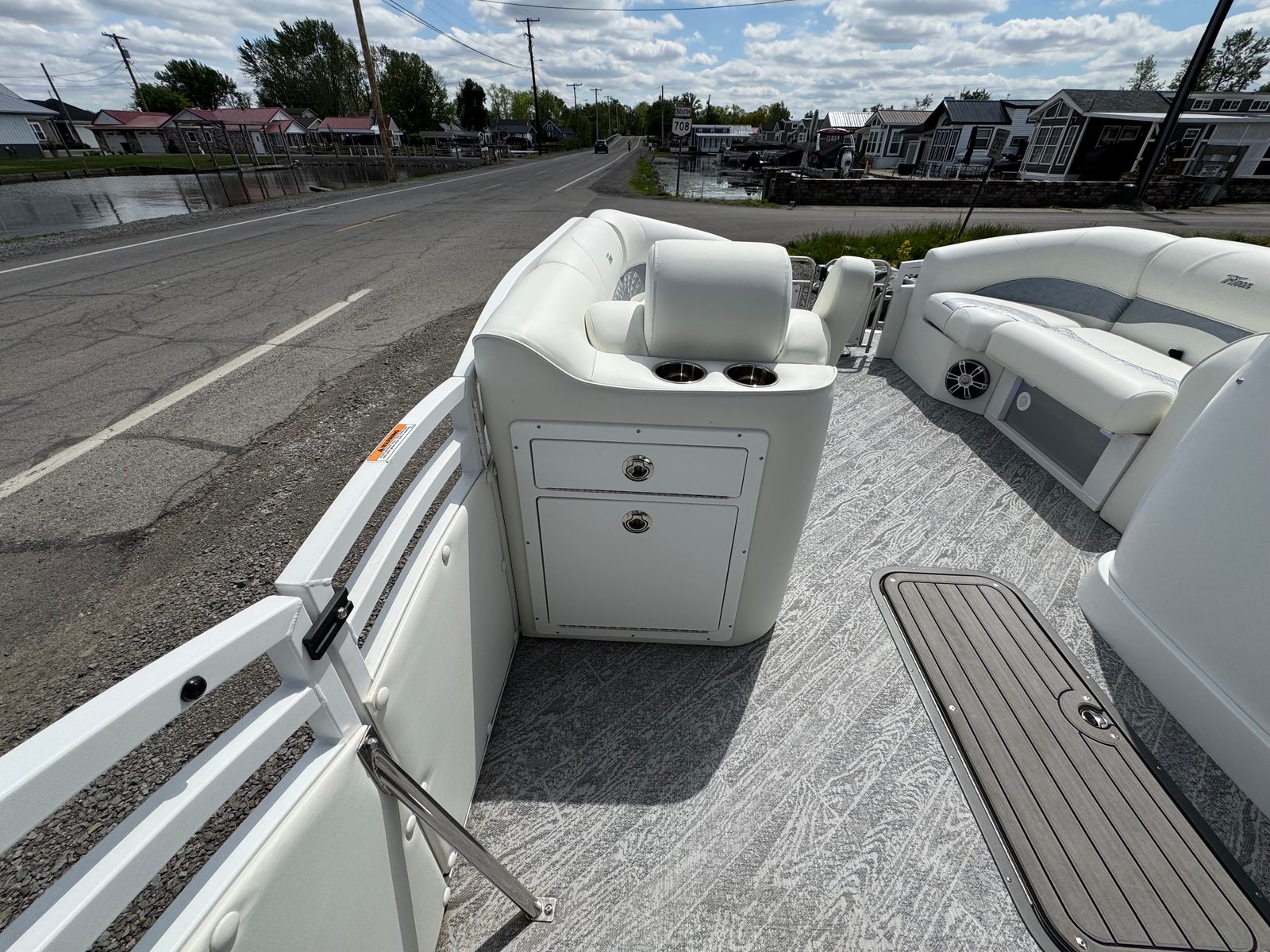 The Jc Neptoon 23TT Sport is packed with special features that set it apart from other pontoon boats for sale. The upholstery base color is a crisp white, complemented by silver quilted accent colors that add a touch of sophistication to the seating. The seat base panel color in silver, paired with white panels and striking black graphics, creates a modern and stylish aesthetic that’s sure to turn heads at the marina.The bimini top in steel color offers shade and protection from the sun, allowing you to relax comfortably during long days on the water. JC Plank Flooring in gray provides a durable and attractive foundation, while white rails contribute to the boat’s clean and contemporary look. The DSL stern configuration features dual stern lounges, perfect for unwinding with friends or soaking up the scenery. Notably, this model is designed without a sundeck or star gate, streamlining the layout for maximum usability and comfort.