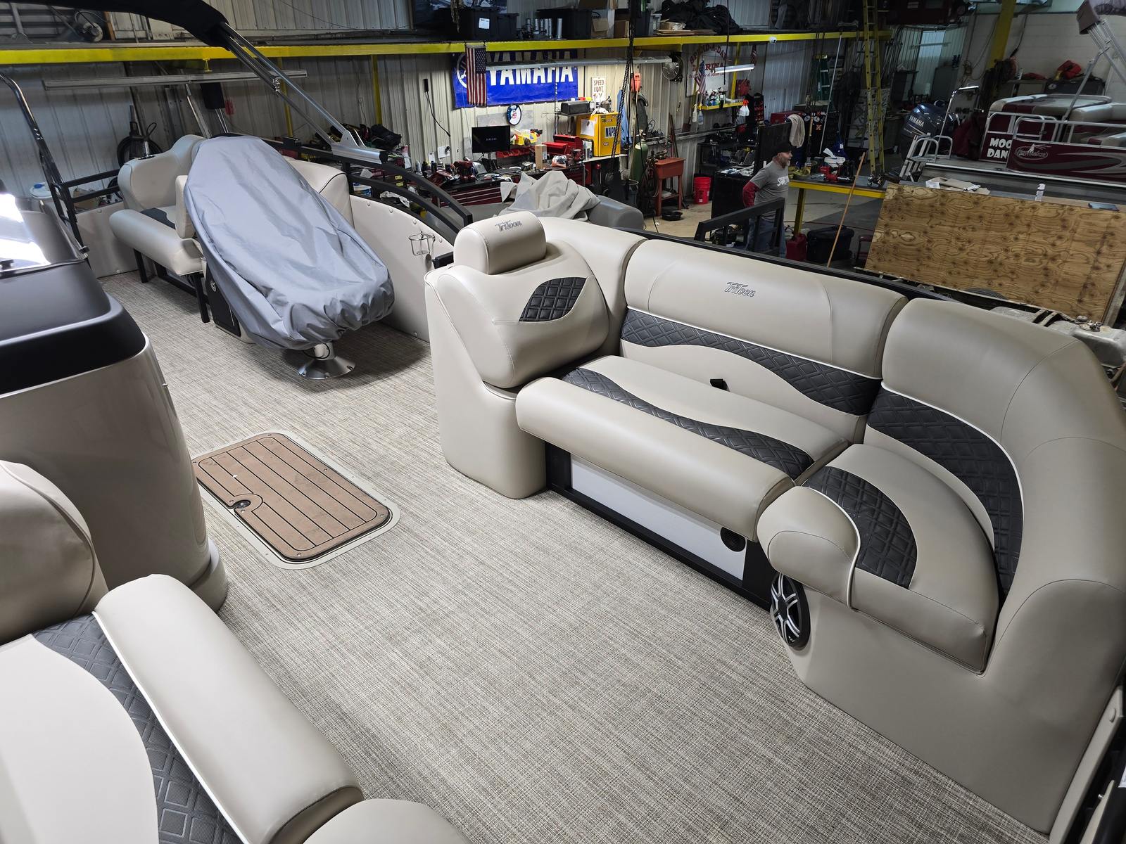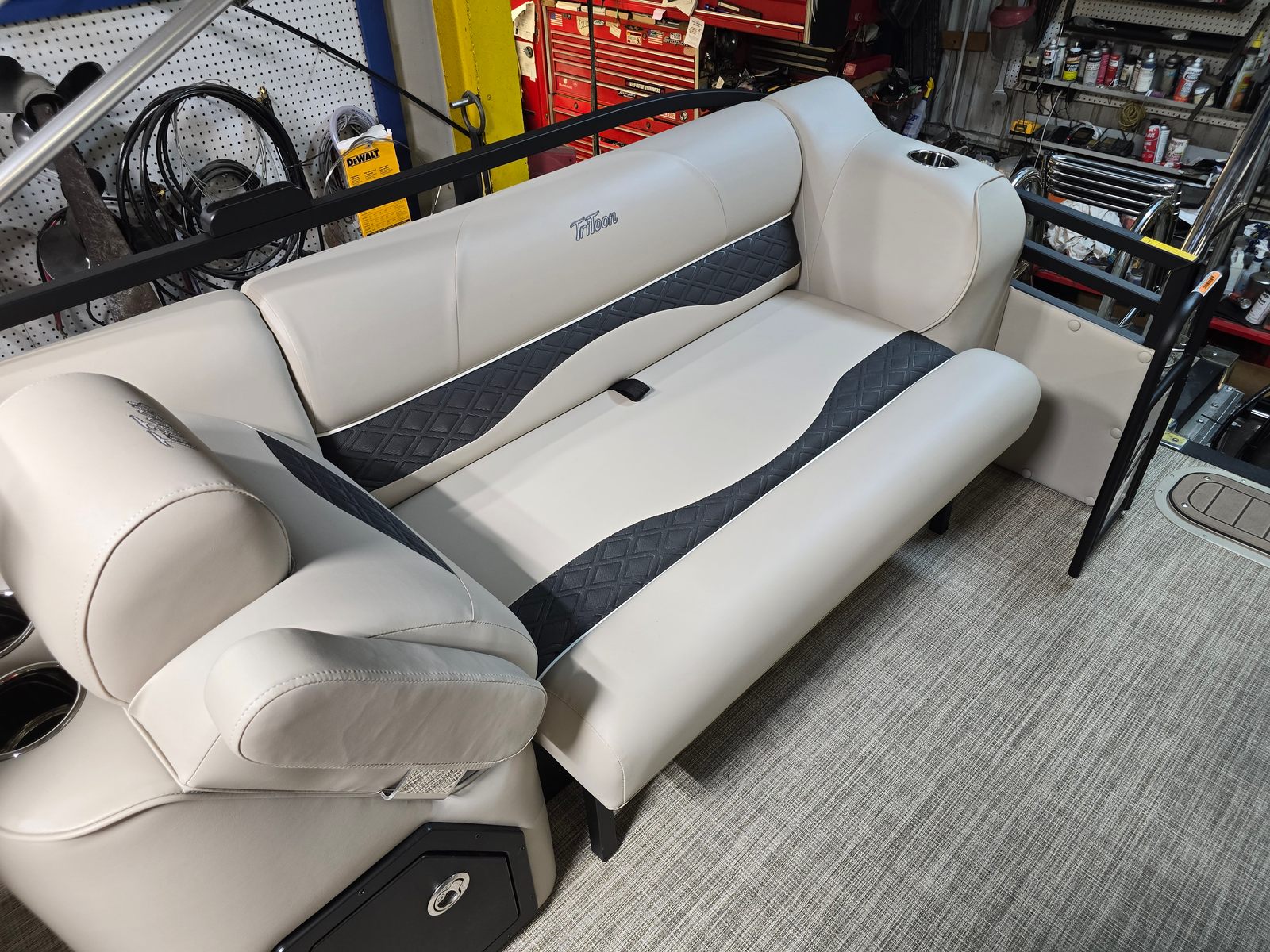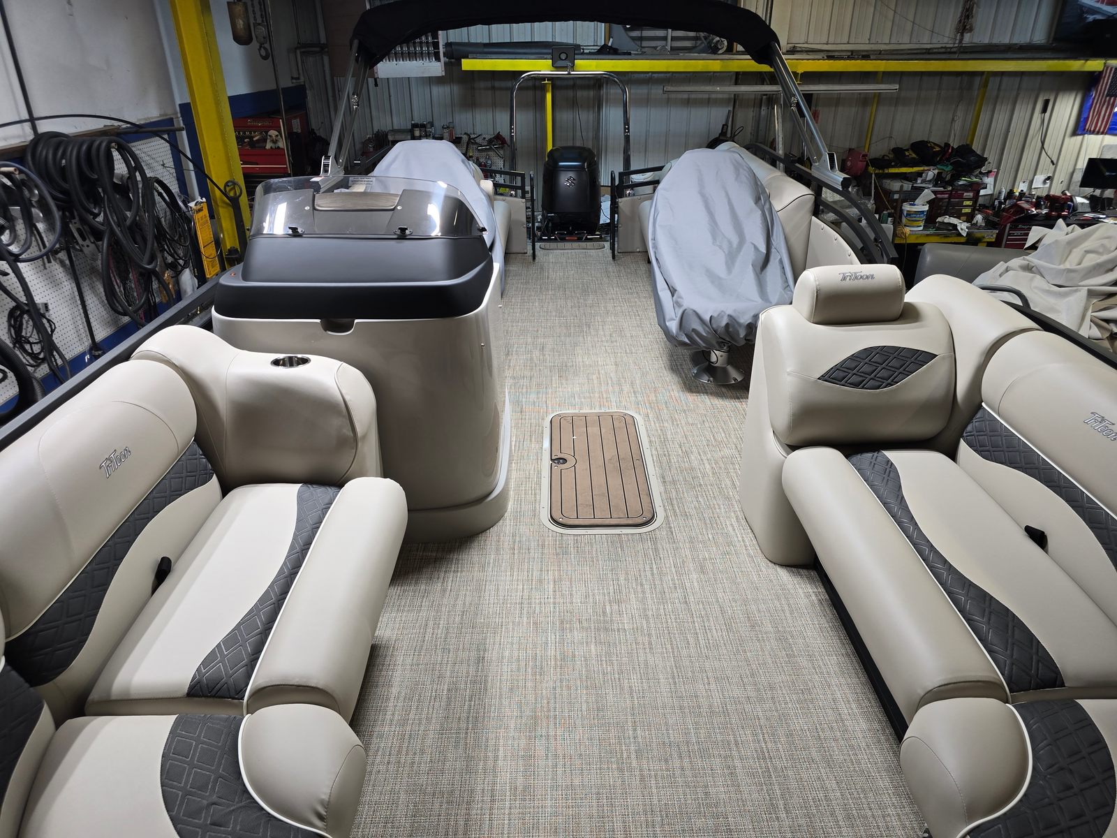 The 2026 Jc Neptoon 23TT Sport is loaded with features that enhance both its functionality and visual appeal. The tan and carbon upholstery provides a sophisticated and inviting atmosphere, while the white seat panels and white/black graphics add a modern touch to the overall design. The black rails and black bimini top not only contribute to the boat’s sleek appearance but also offer practical benefits such as shade and durability. The taupe flooring is both stylish and easy to maintain, ensuring your pontoon stays looking its best season after season.Comfort is a priority on the Neptoon 23TT Sport, with dual stern lounges that invite you to relax and soak up the sun. The port and stern loungers with integrated storage provide convenient spaces to stow your gear, keeping the deck clutter-free and organized. Every detail is designed to maximize your enjoyment and make every outing as comfortable as possible.